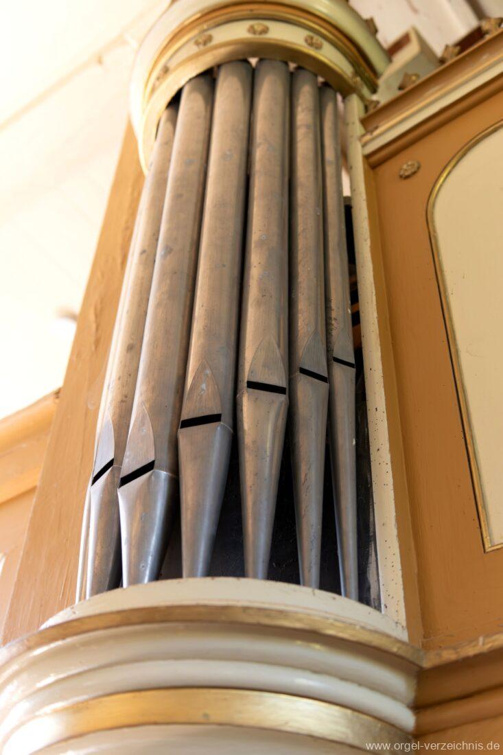 Prinzipal 8 Fuss.            ab F Holz offen, C – E Gedackt 8 Fuss., teilweise Prospekt, ab c‘ innen Metall