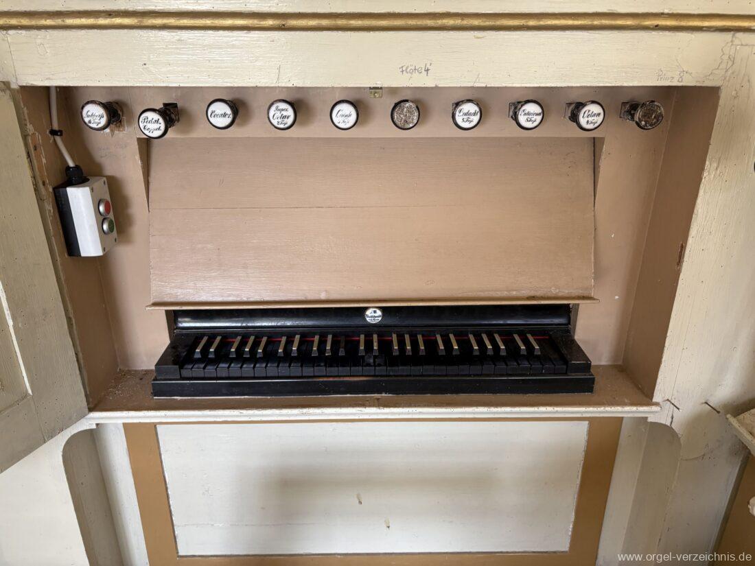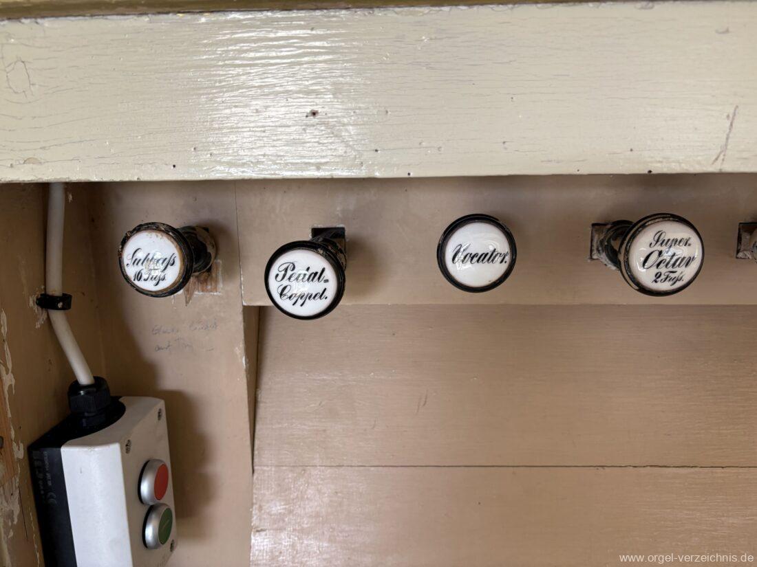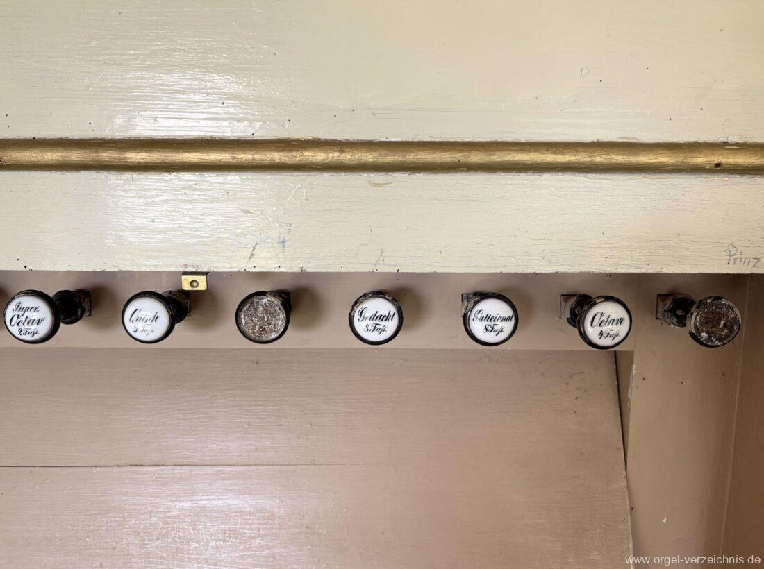 Die Registerbeschriftungen von Prinzipal 8 Fuss. und Flöte 4 Fuss. fehlen leider. Somit kann die exakte Schreibweise beider Register nicht mehr nachvollzogen werden.
