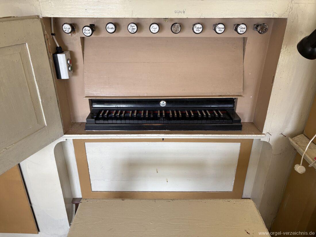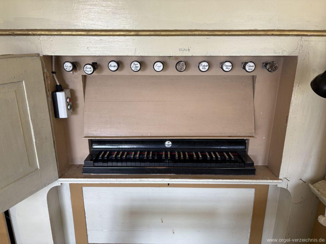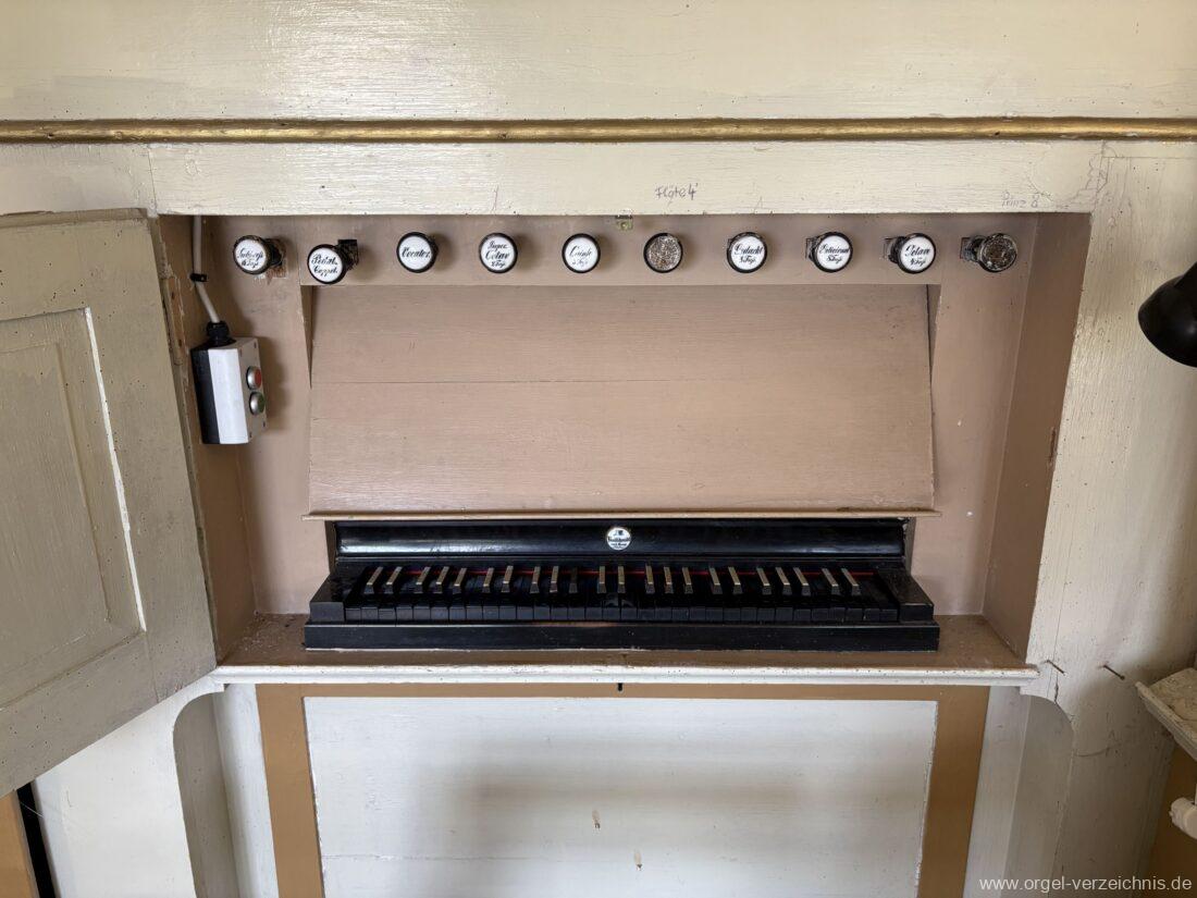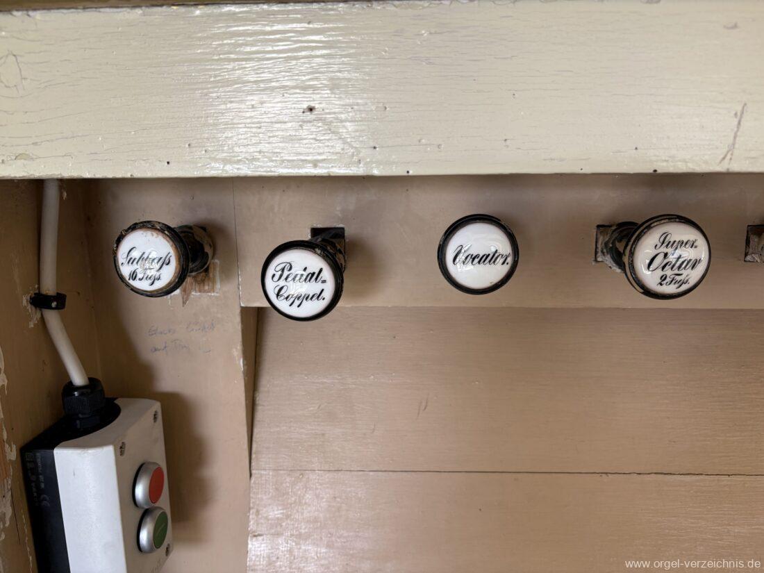 Die Registerbeschriftungen von Prinzipal 8 Fuss. und Flöte 4 Fuss. fehlen leider. Somit kann die exakte Schreibweise beider Register nicht mehr nachvollzogen werden.