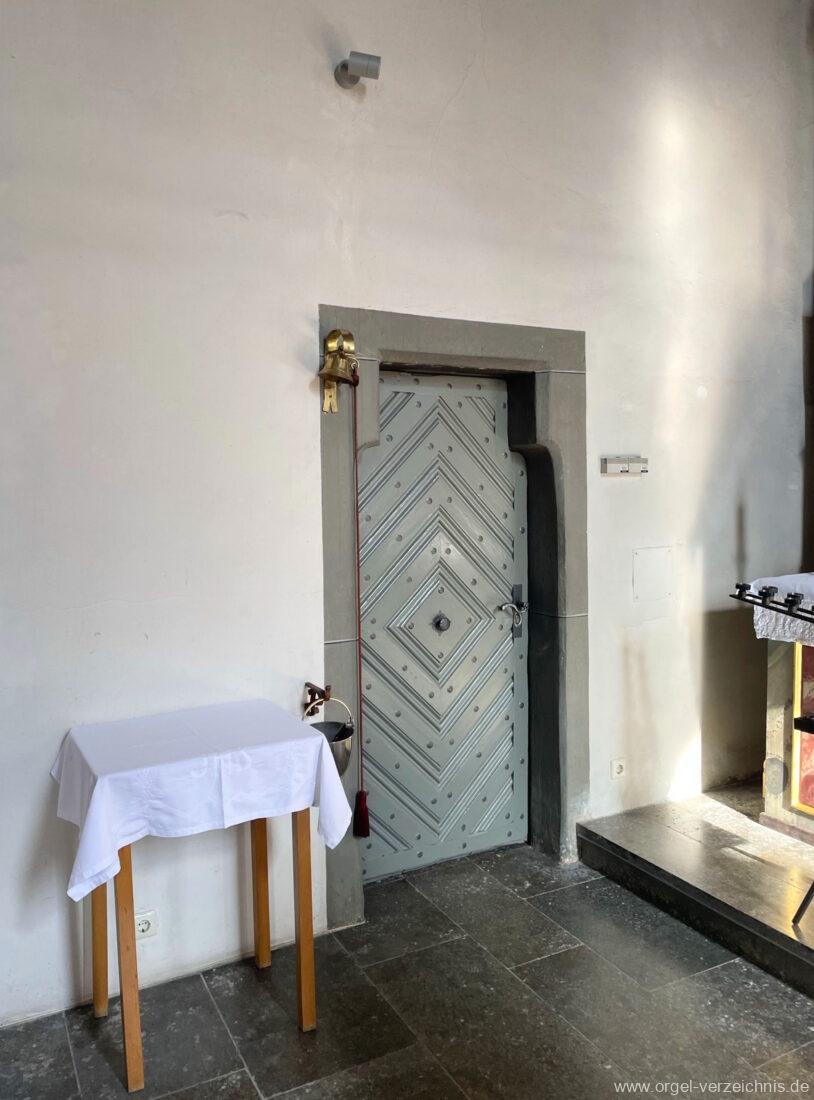 II Positiv C – g“‘Gedeckt 8′ C – H Holz ged.; ab c° Zink ged.; ab d‘ Metall ged. Prinzipal 4′ teilw. Prospekt Zink – Anm. 2; ab e‘ innen, Metall Blockflöte 2′ Metall, konisch Schwiegel 1′ Metall Terzzymbel 3 f. 1/5′ Metall Tremulant