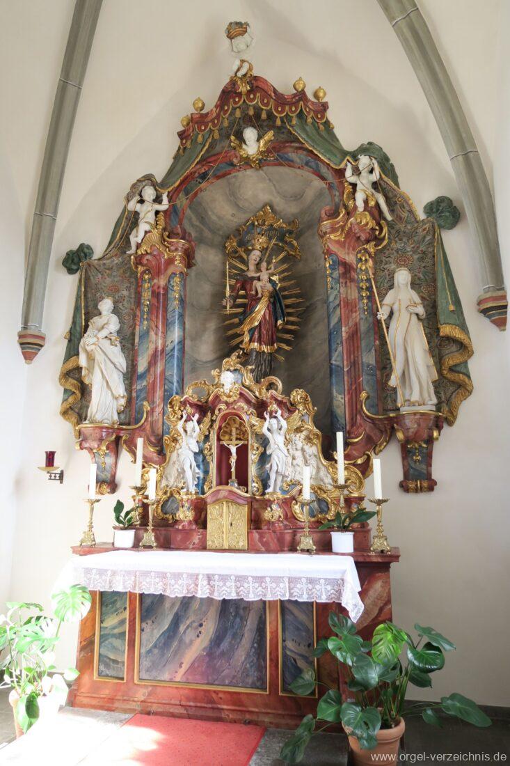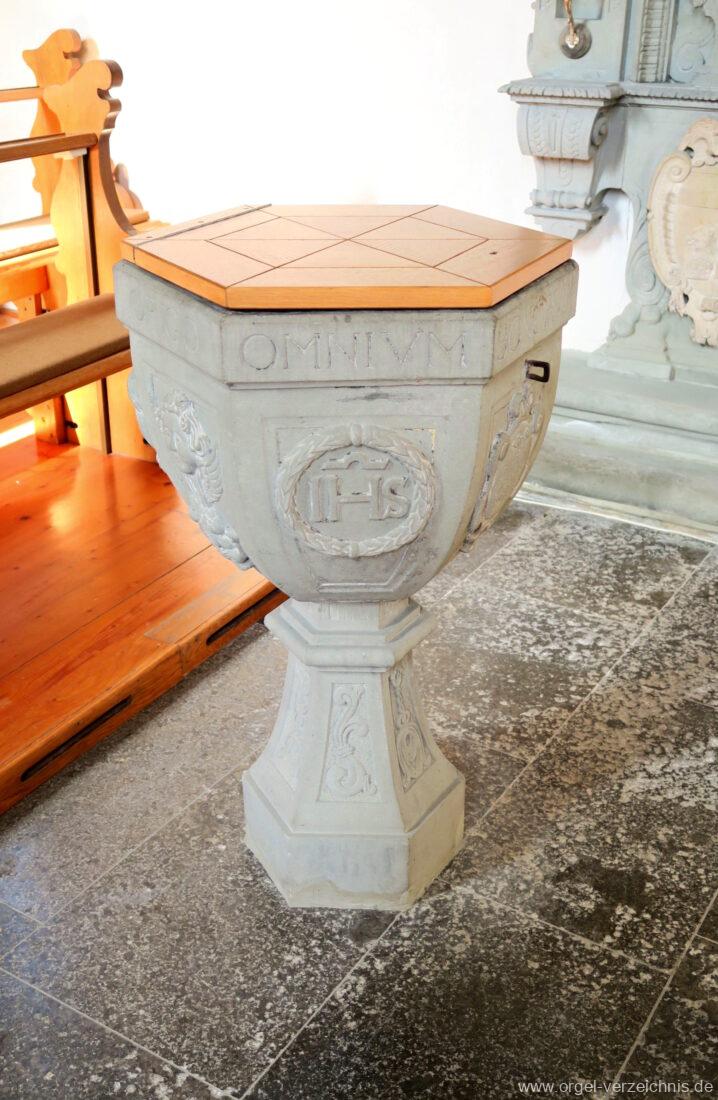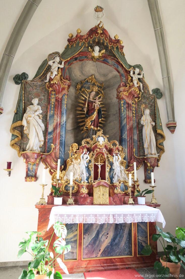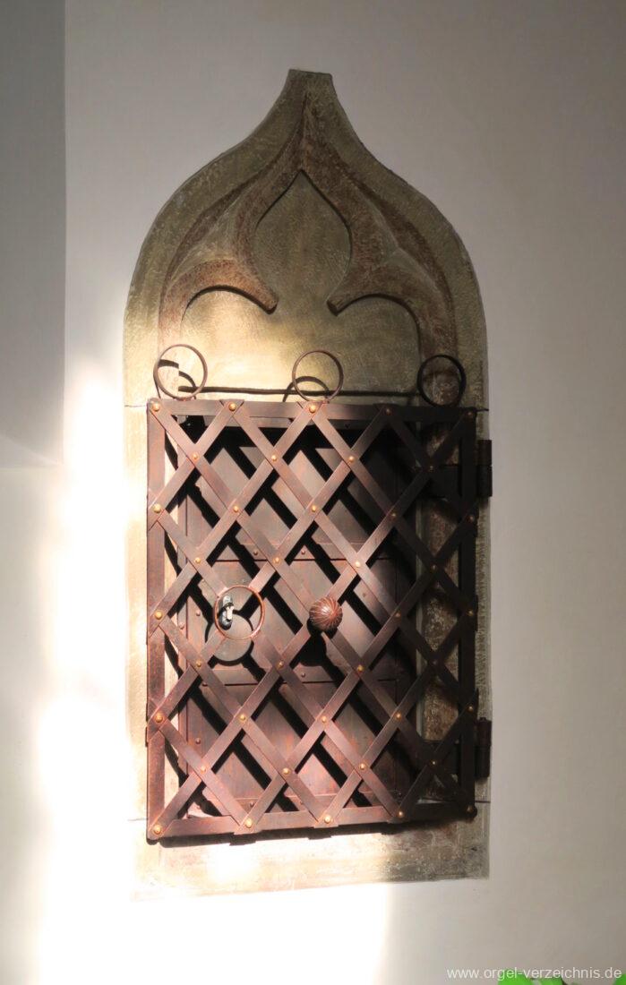 1952 elektropneumatische Kegelladenorgel mit seitlich freistehendem Spieltisch, erbaut von Orgelbau-Anstalt Xaver Mönch Söhne Inhaber Otto Mönch (Überlingen a. Bodensee) II/12 + 1 Windabschwächung und 2 Transmissionen.
