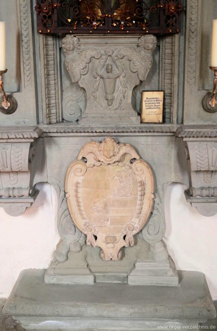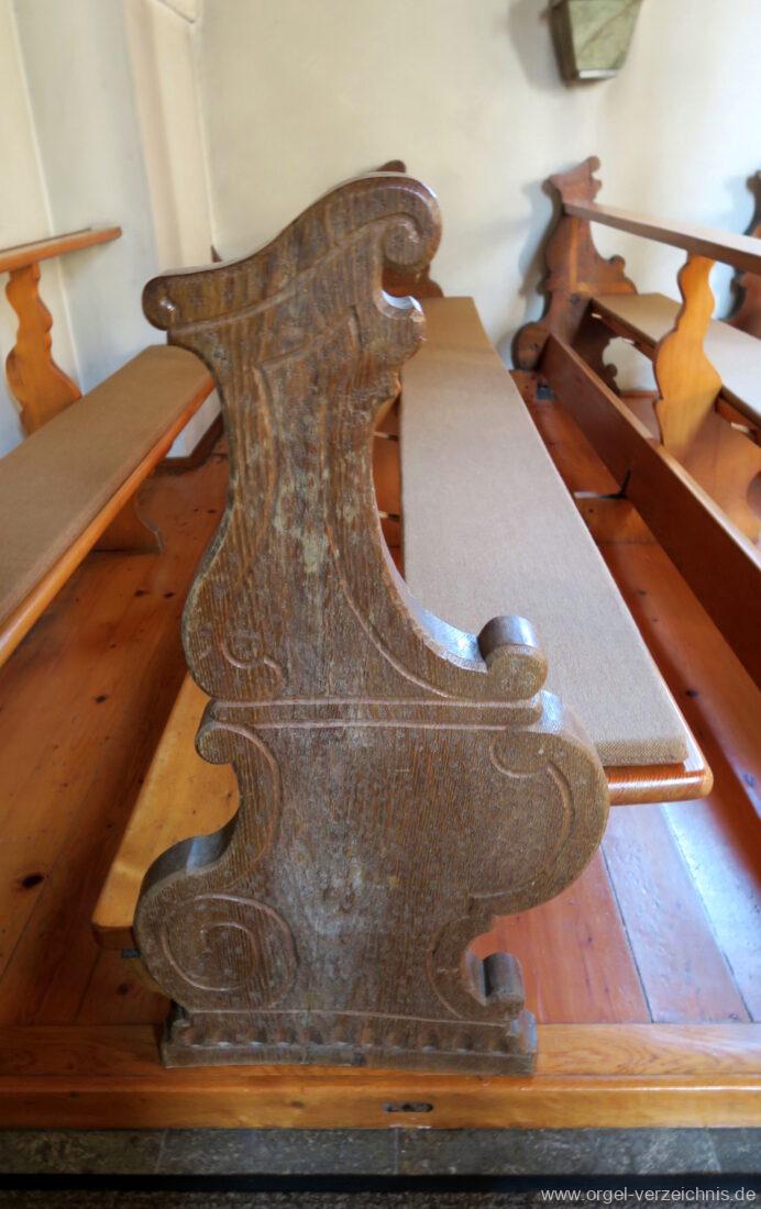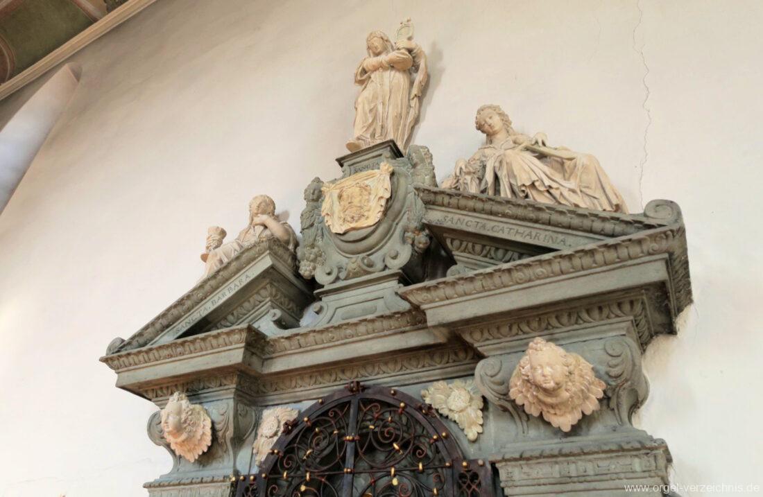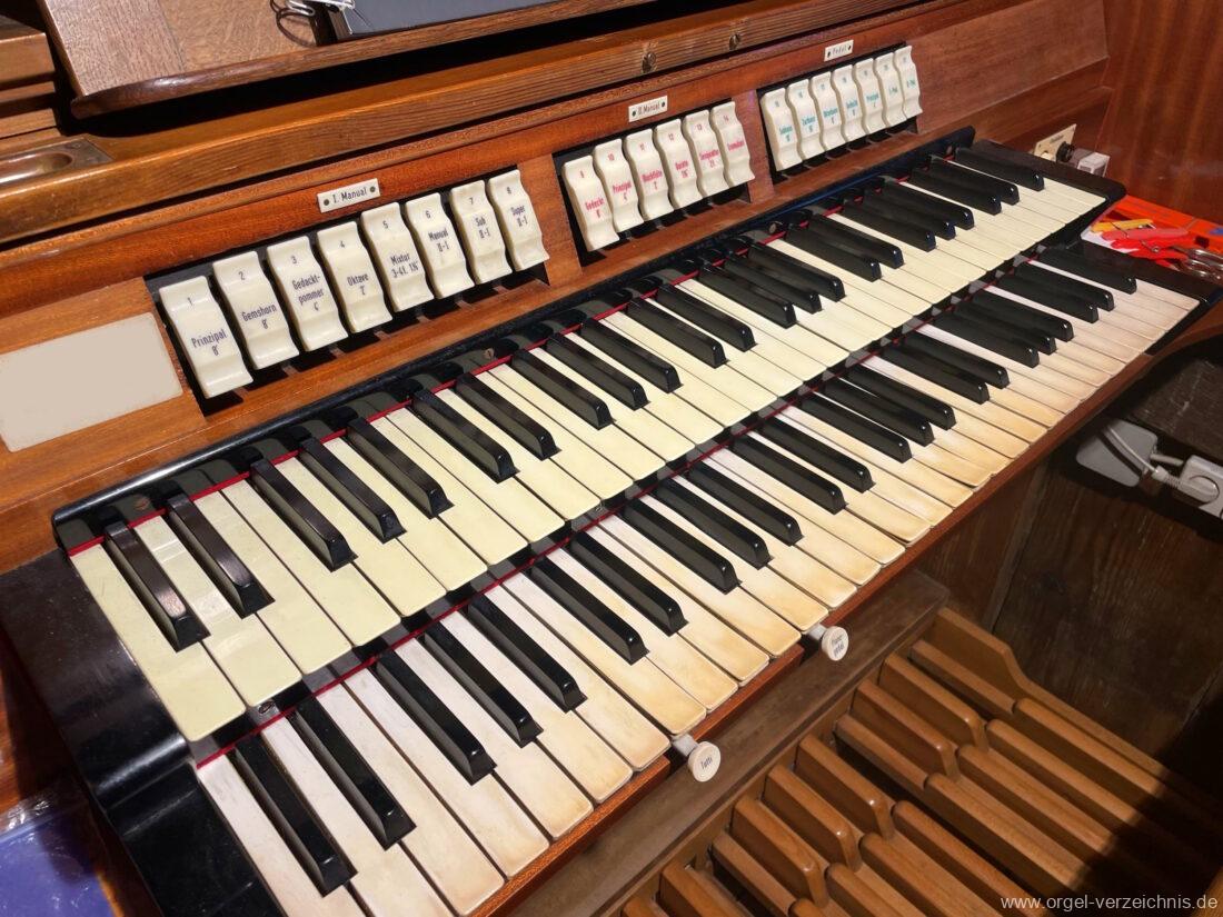 I Hauptwerk C – g“‘Prinzipal 8′ teilw. Prospekt – Anm. 1; Zink im Prospekt Gemshorn 8′ Zink, konisch Gedacktpommer 4′ Metall ged. Oktave 2′ Metall Mixtur 3-4 f. 1 1/3′ Metall; rep. c°/c’/c“; ab c° 4 fach