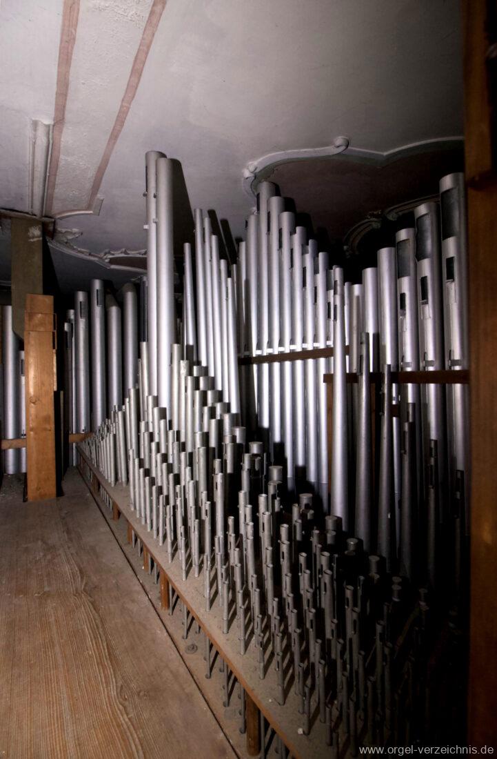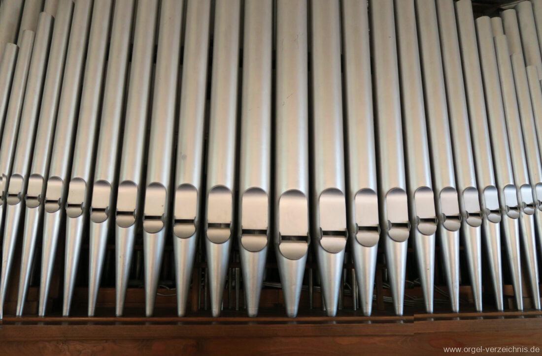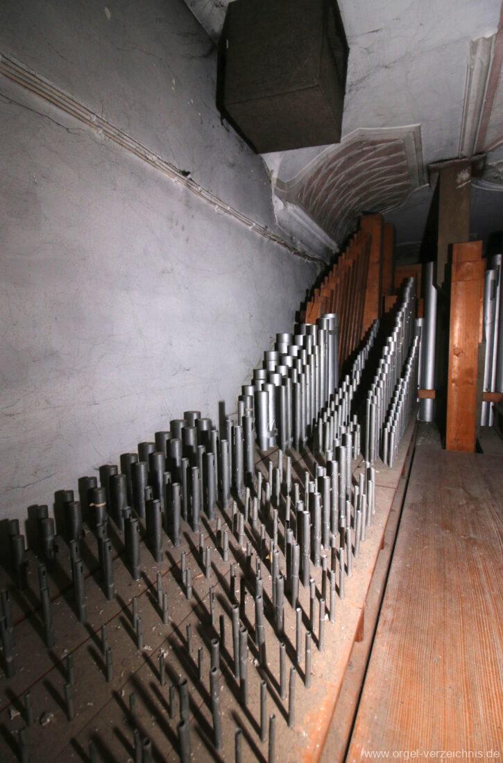 Pedal C – f‘Subbass 16′ Holz ged. Zartbass 16′ Windabschwächung Subbass 16′ Oktavbass 8′ Metall offen; teilw. Prospekt Zink – Anm. 3 Gedeckt 8′ Tr. Pos. II Prinzipal 4′ Tr. Pos. II