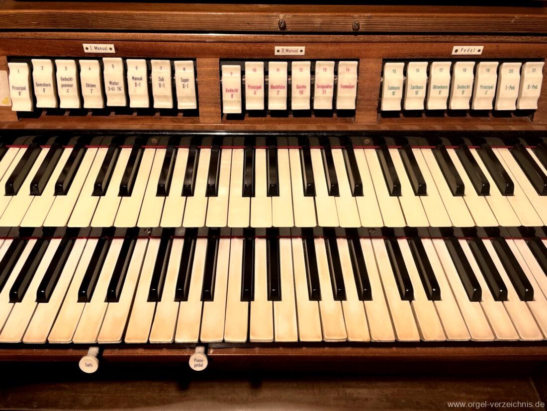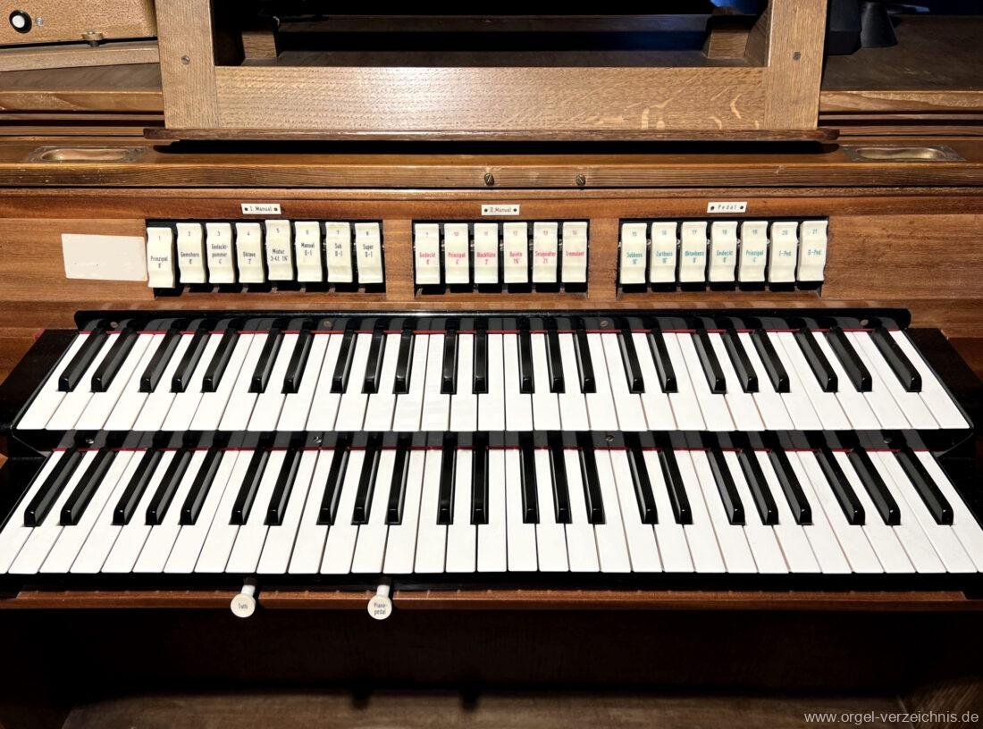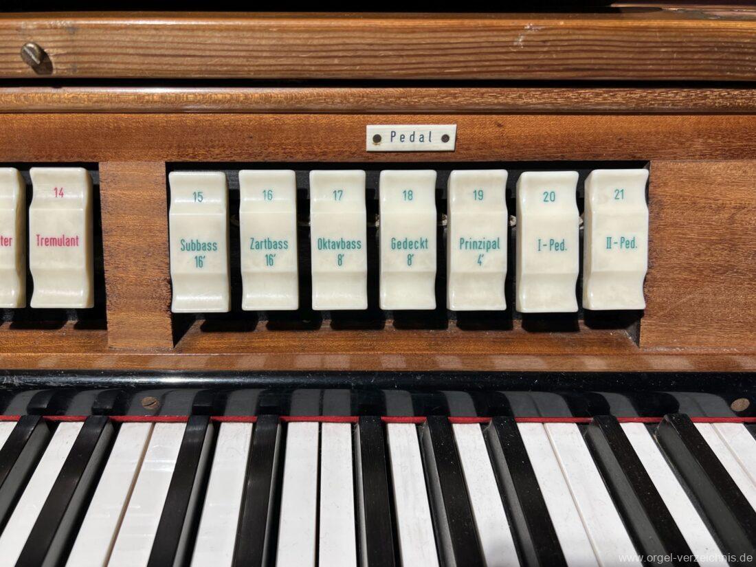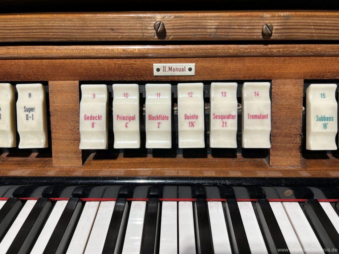 Manual II-I (Nr. 6), Sub II-I (Nr. 7 / ab c°), Super II-I (Nr. 8 / nicht ausgebaut), I-Ped. (Nr. 20), II-Ped. (Nr. 21) als Registerwippen