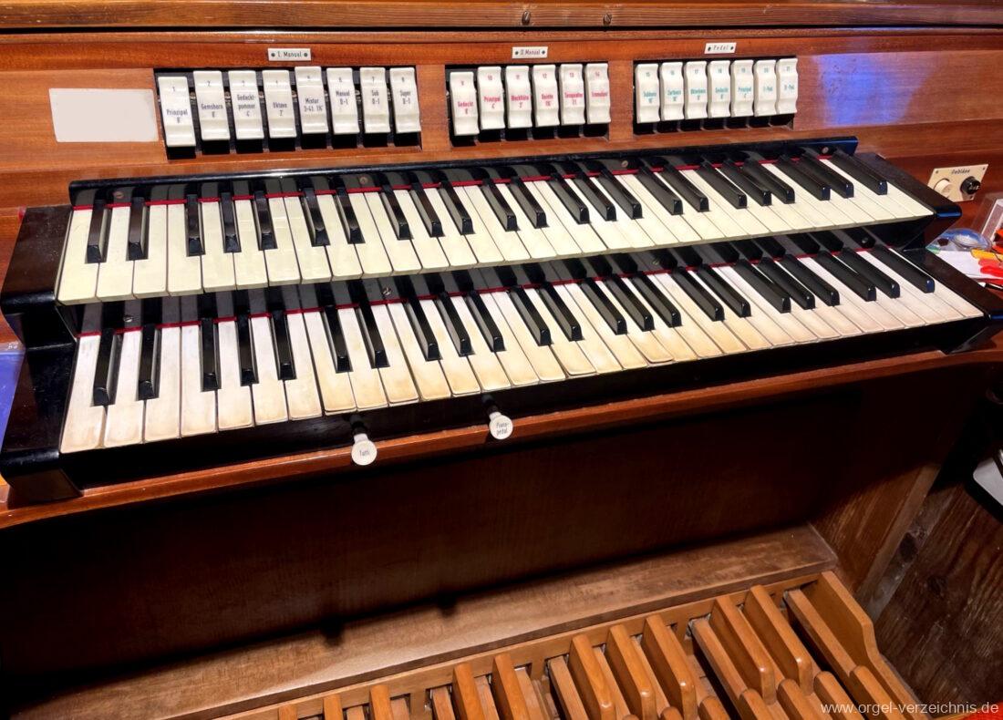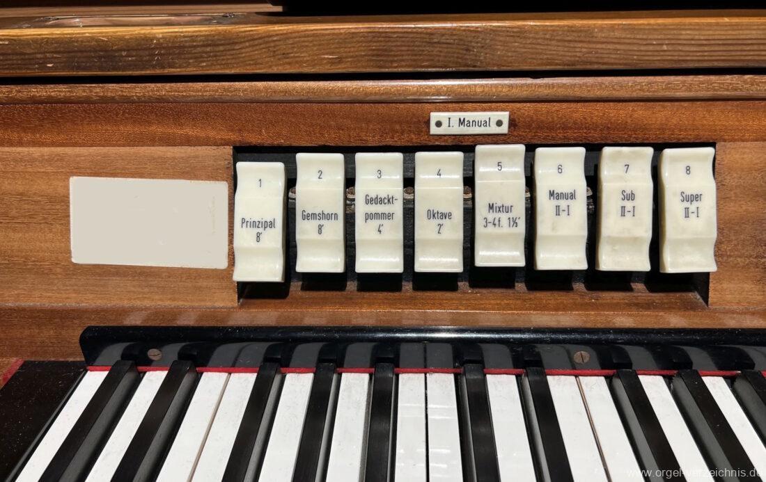 Manual C, D, E, F, G, A – c“‘Coppel 8′ Principal 4′ Prospekt Flöte 4′ Principal 2′ Mixtur 3-fach 1′ 2 weitere neue Register (unbekannt)
