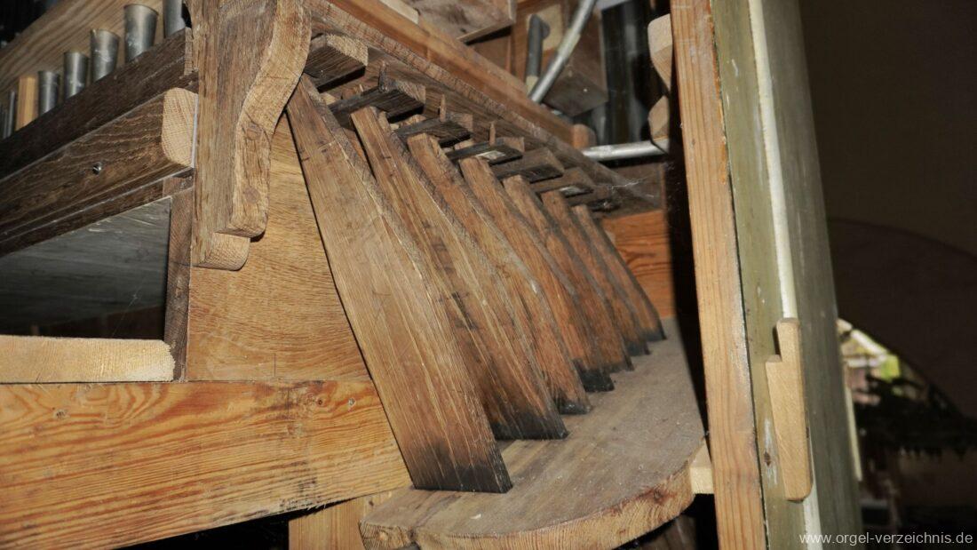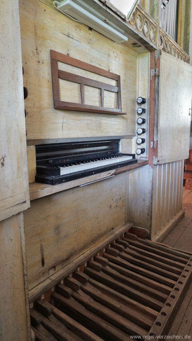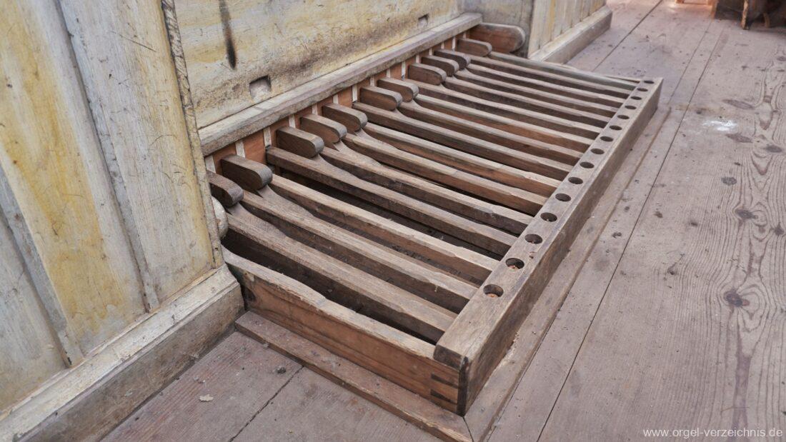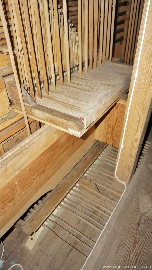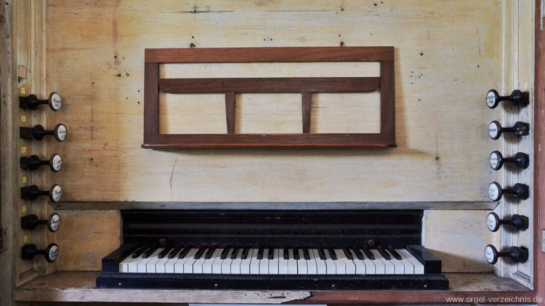 Manual C – f“‘Principal 8 Fuss C – H Holz, ab c° Metall, teilw. im Prospekt (neue Pfeifen) Rohrflöte 8 Fuss. C – H Holz ged., ab d“‘ konisch Salicional 8 Fuss. C – H Holz, c° – e° Prospekt Octava 4 Fuss. C – H Prospekt, ab c° innen Flauto dolce 4 Fuss. ged., ab b“ konisch Quintflöte 2 2/3′ Fuss. konisch, neue Pfeifen Superoctave 2 Fuss.