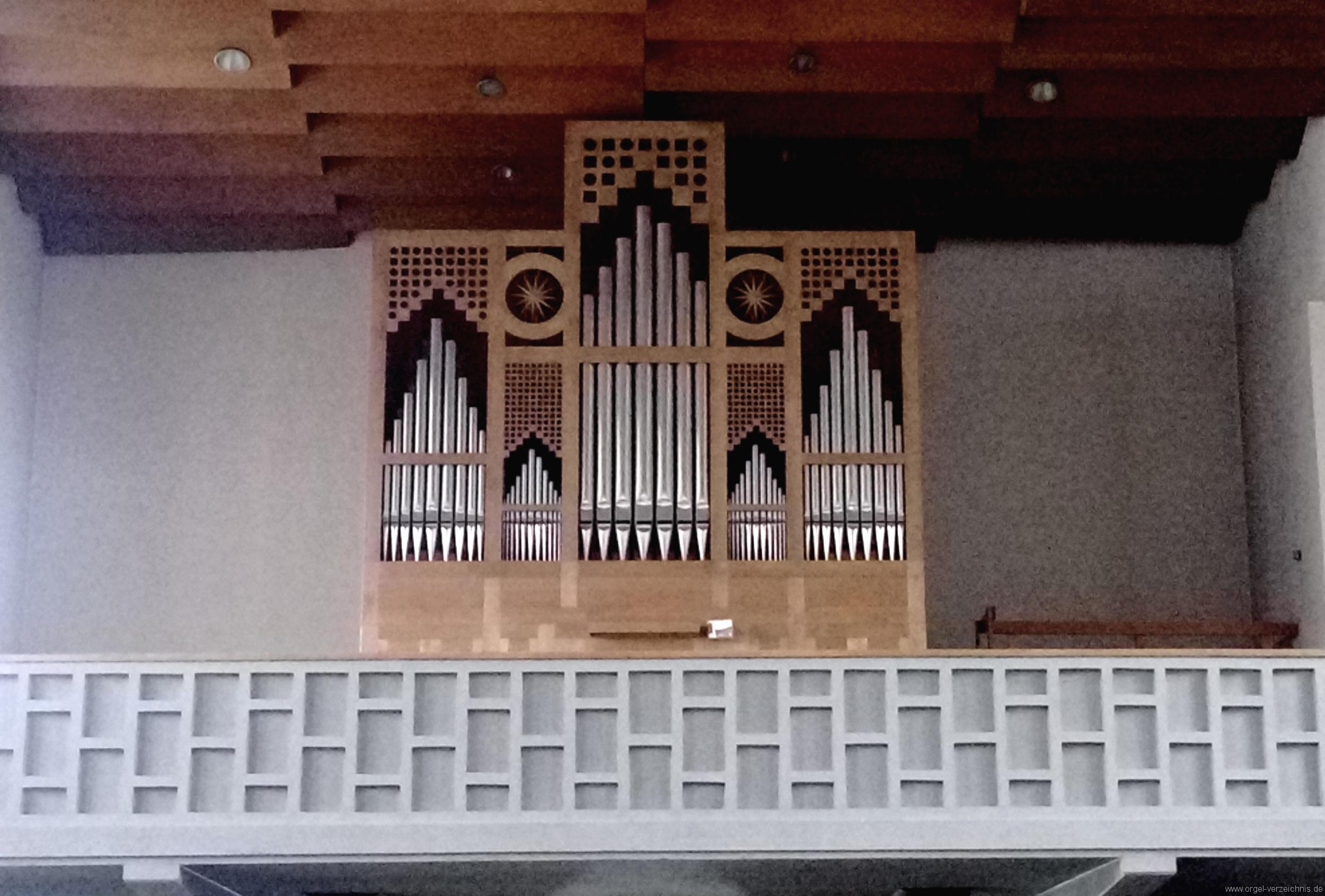 1992 Schleifladenorgel mit fest eingebautem Spieltisch und reinmechanischer Traktur, erbaut als Opus 92 von Orgelbau Johannes Rohlf (Neubulach) II/24.