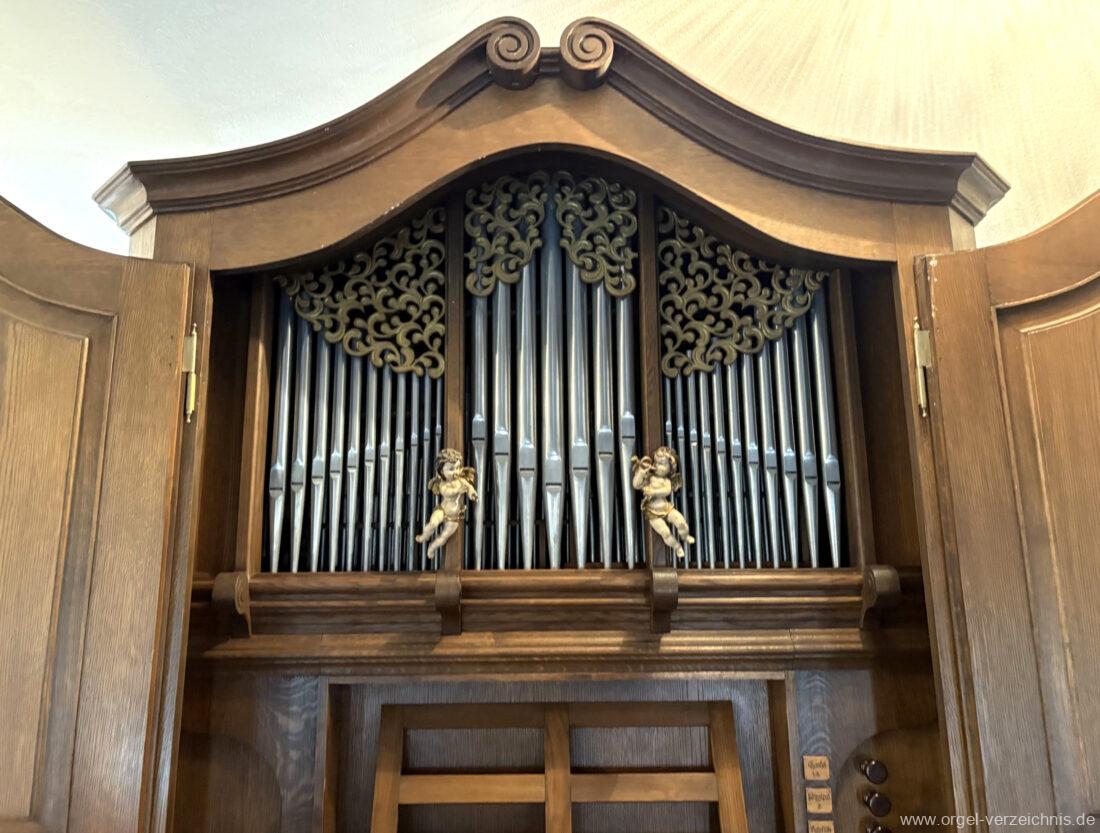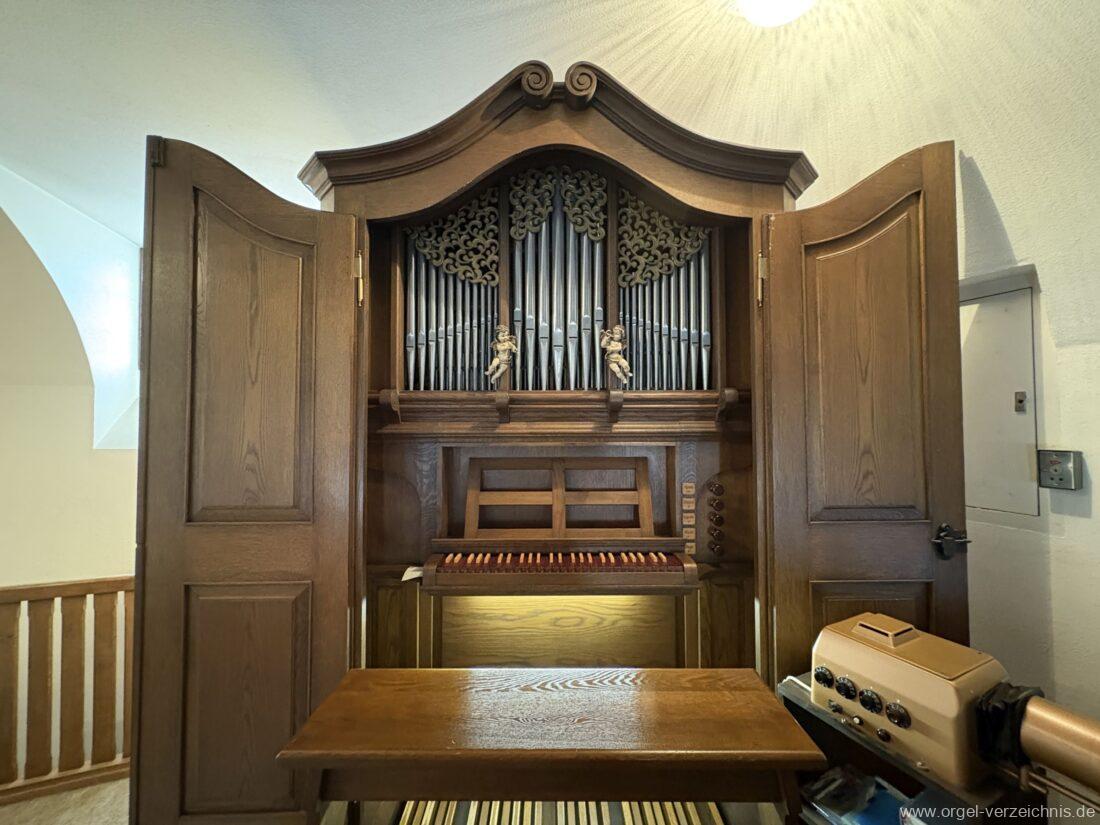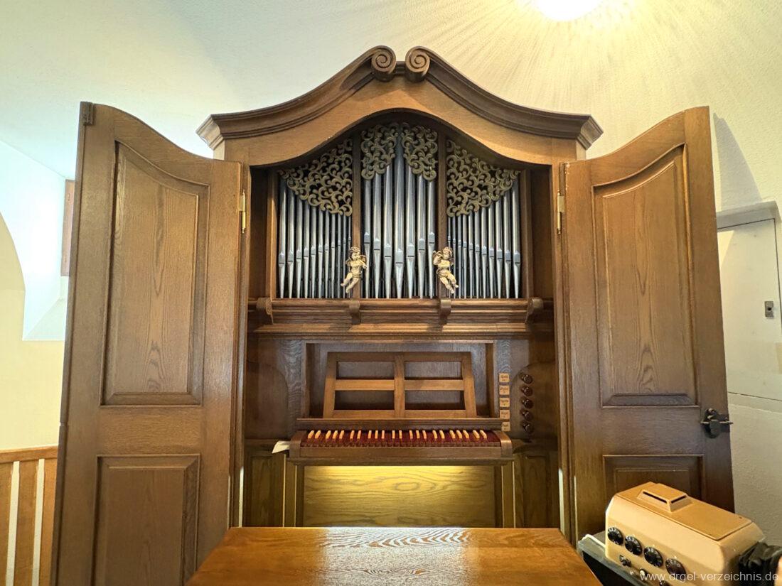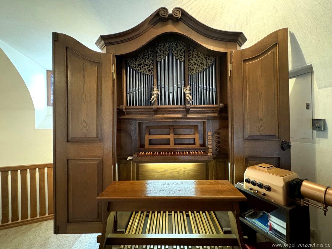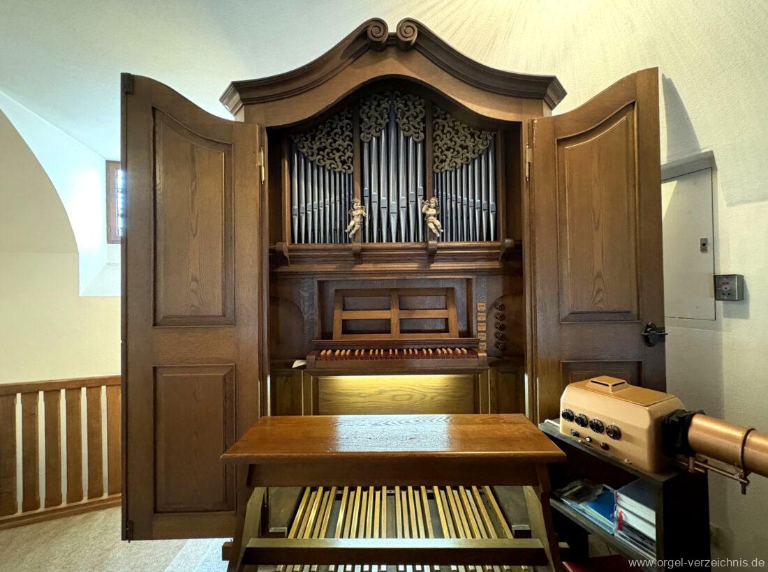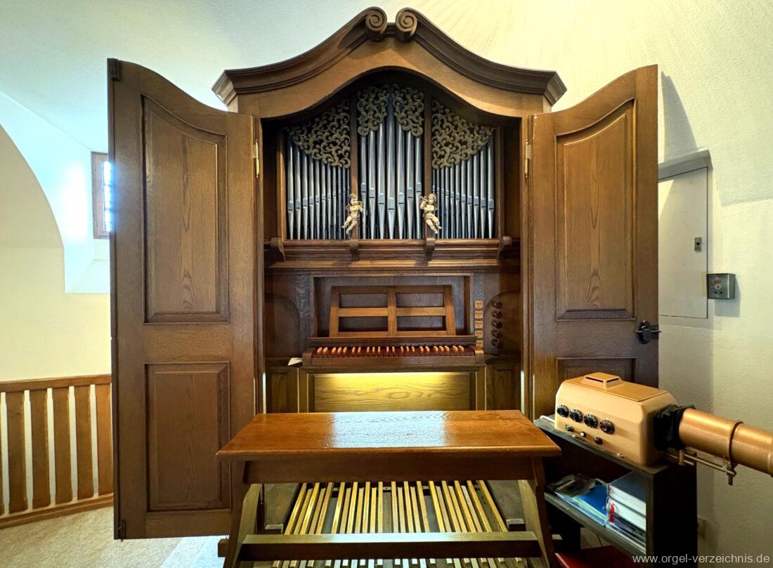 1980 mechanisches Schleifladenpositiv mit klappbaren Gehäuseflügeltüren (welche auch den Spieltisch mit einschliessen), erbaut von Orgelbauer Heinz Boschert (Emmendingen-Windenreute) I/5 mit angehängtem Pedal. Das Gehäuse ist bis auf die beiden Figuren von Boschert im historisch angelehnten Stil neu erstellt worden.