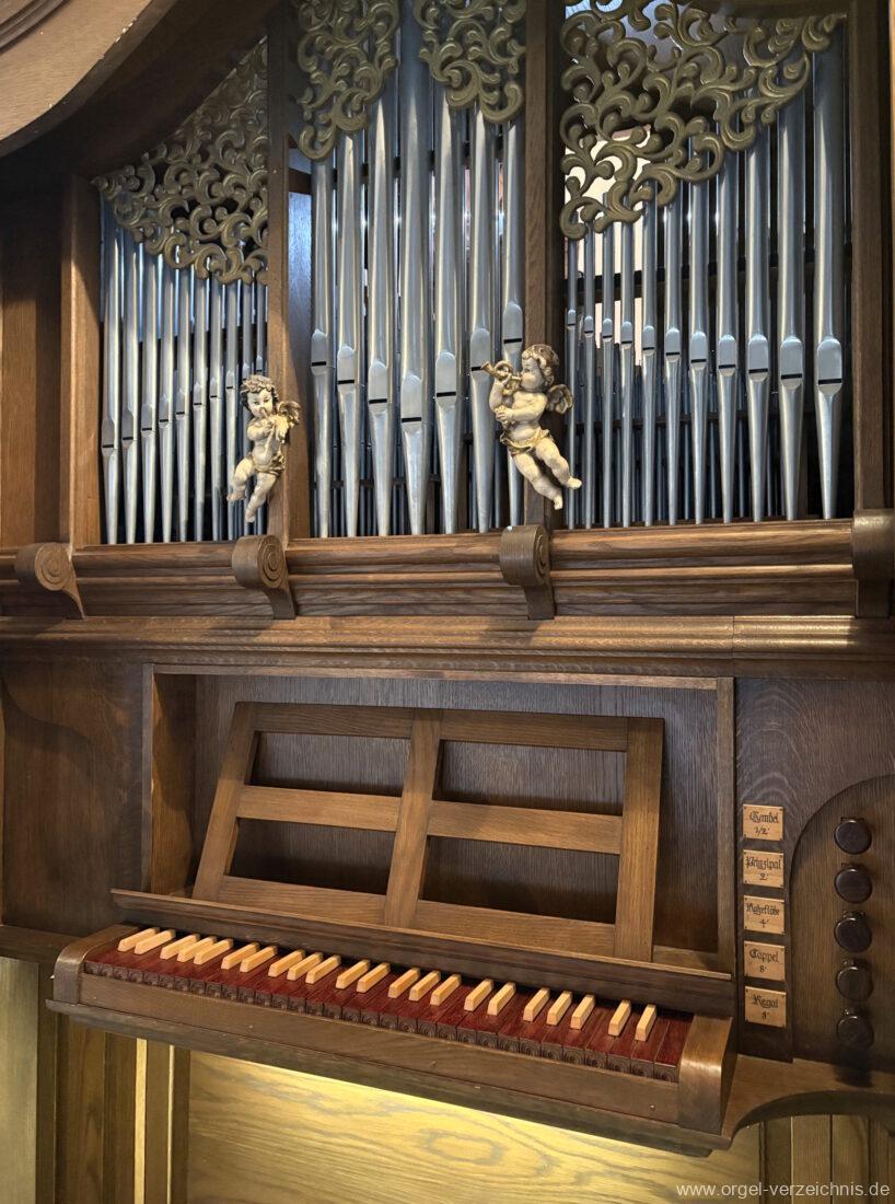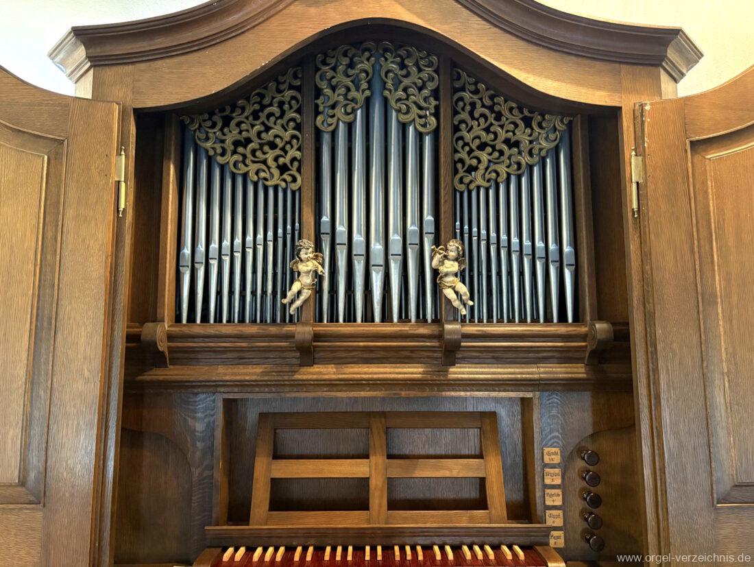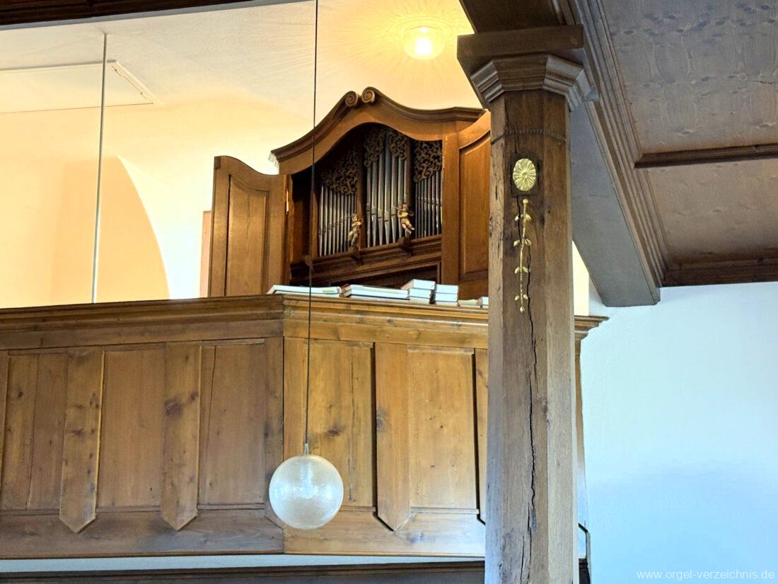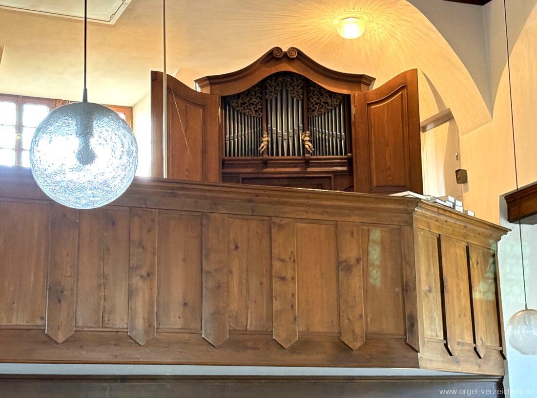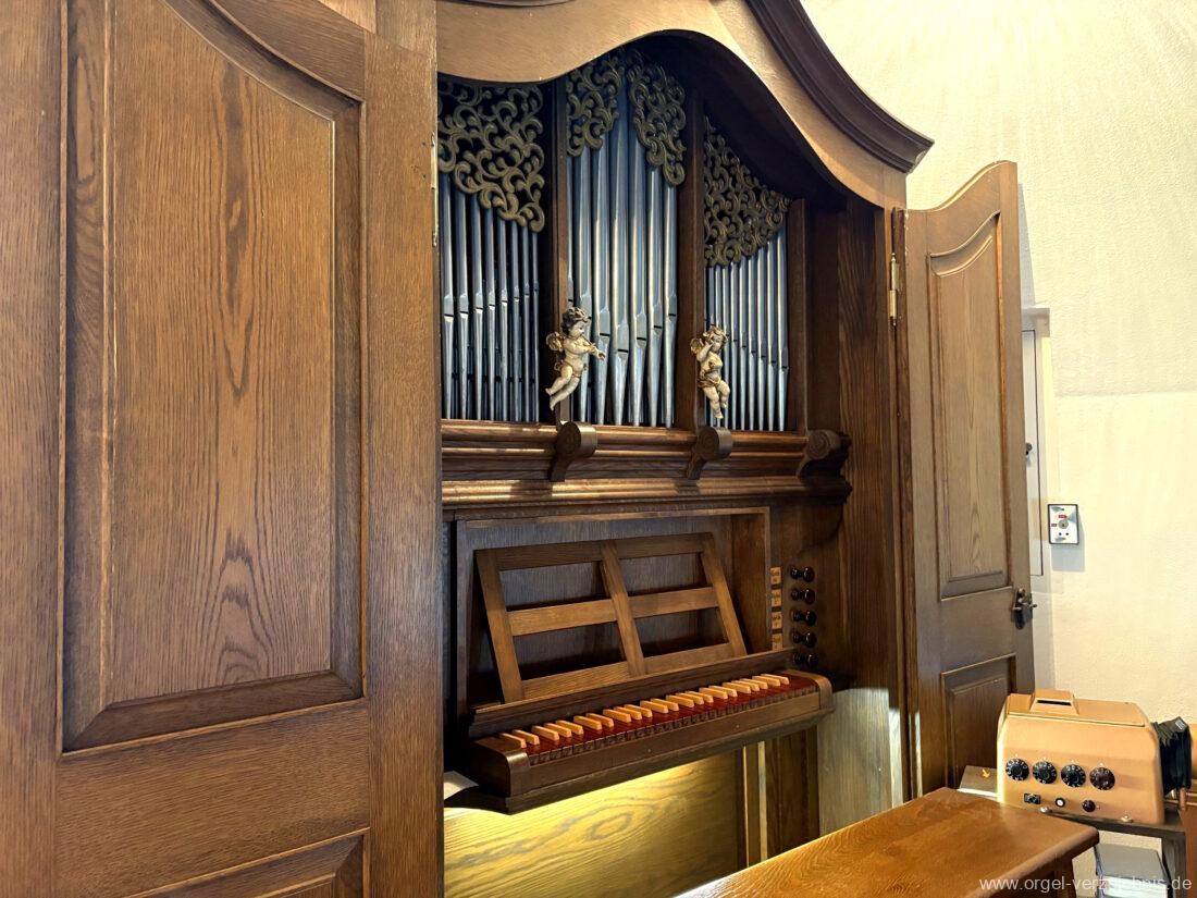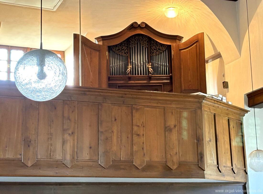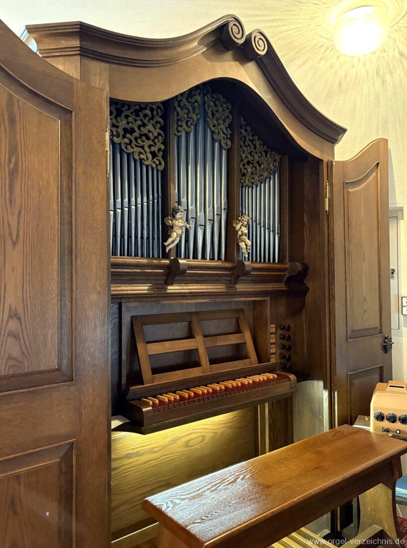 1980 mechanisches Schleifladenpositiv mit klappbaren Gehäuseflügeltüren (welche auch den Spieltisch mit einschliessen), erbaut von Orgelbauer Heinz Boschert (Emmendingen-Windenreute) I/5 mit angehängtem Pedal. Das Gehäuse ist bis auf die beiden Figuren von Boschert im historisch angelehnten Stil neu erstellt worden.