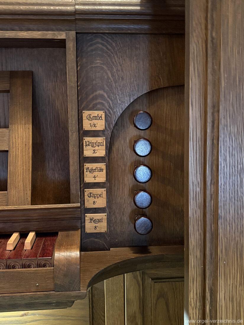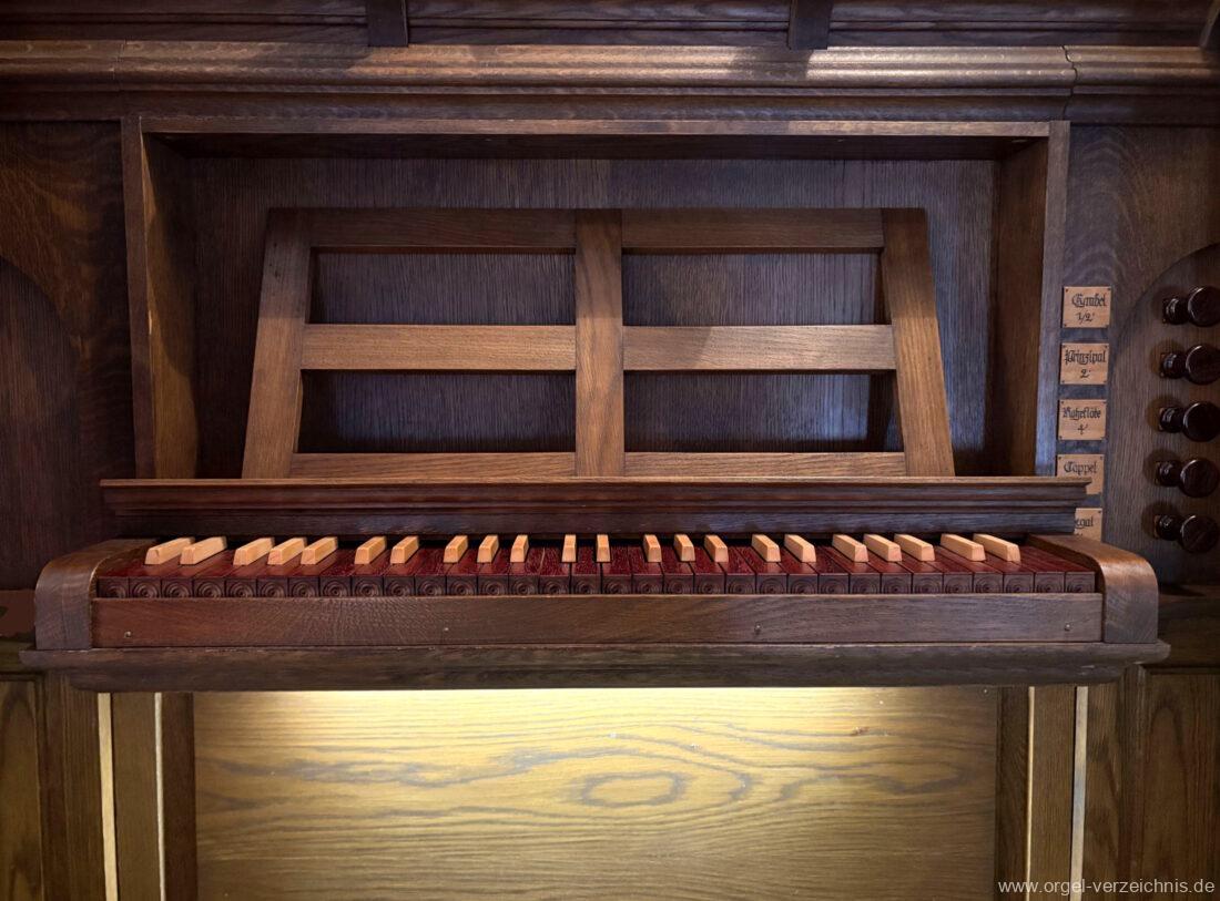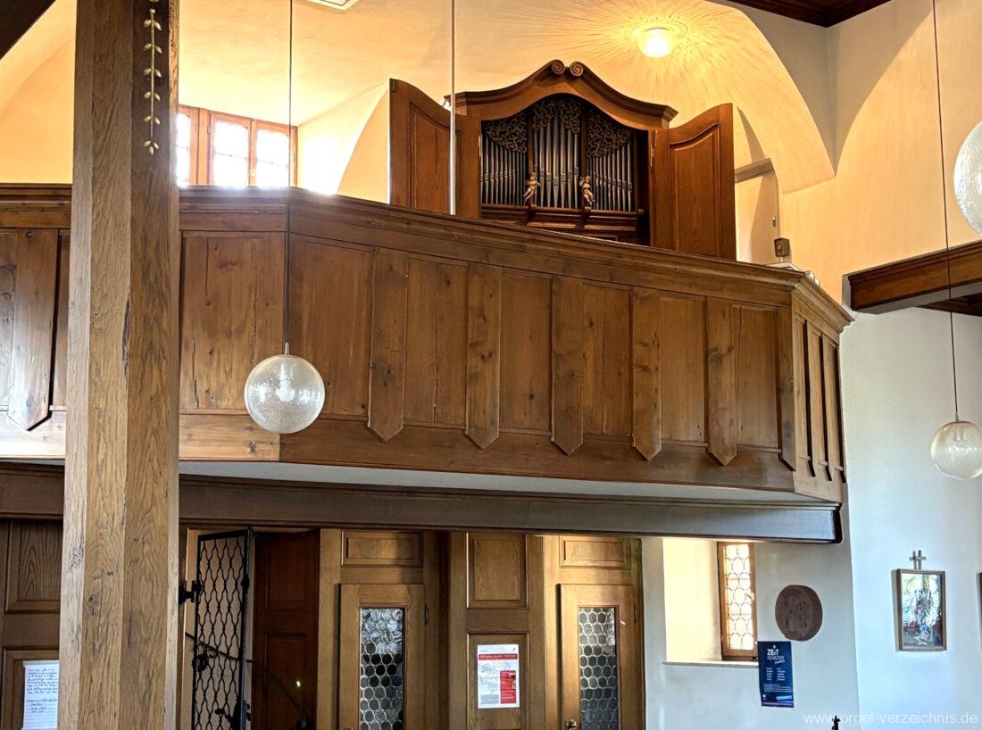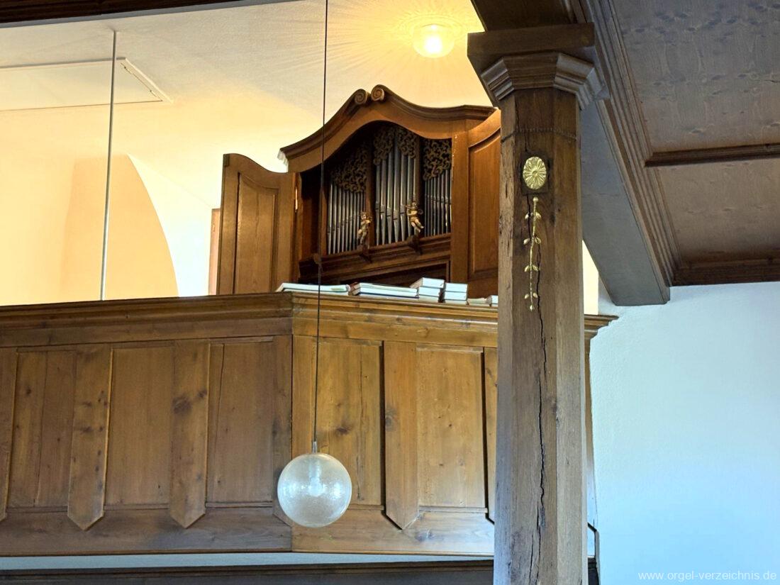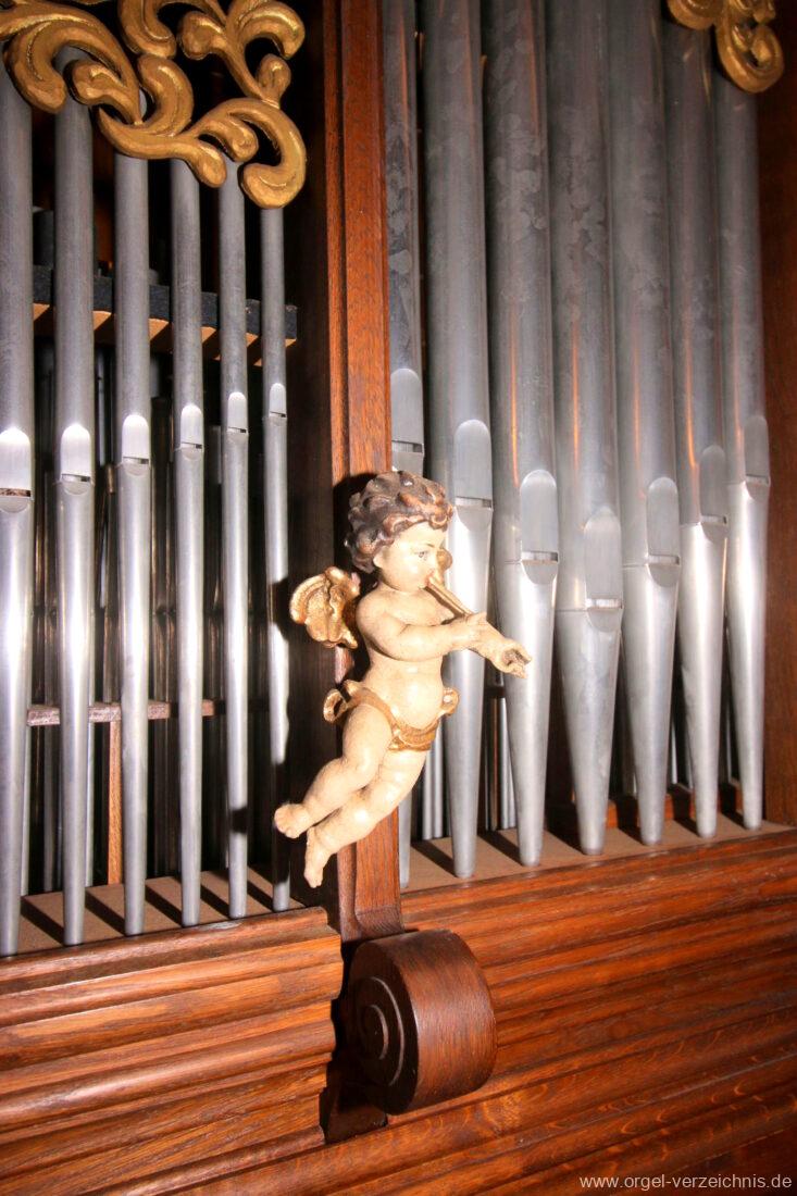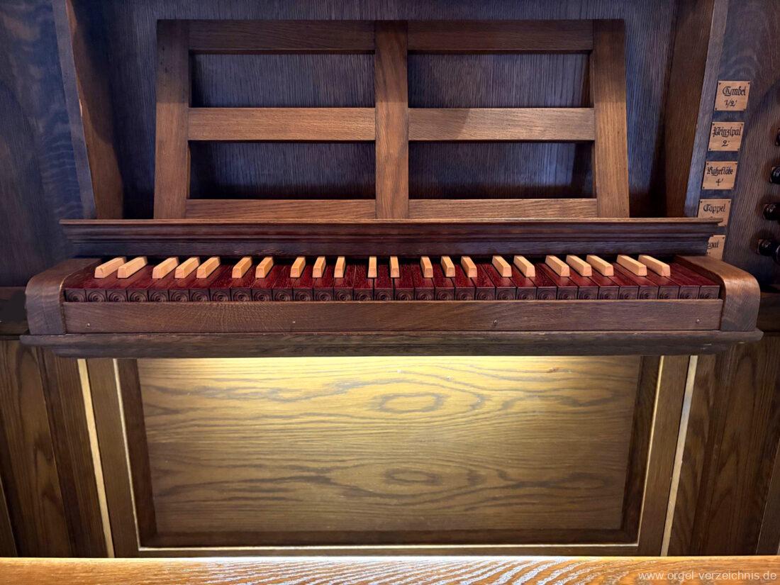 1980 mechanisches Schleifladenpositiv mit klappbaren Gehäuseflügeltüren (welche auch den Spieltisch mit einschliessen), erbaut von Orgelbauer Heinz Boschert (Emmendingen-Windenreute) I/5 mit angehängtem Pedal. Das Gehäuse ist bis auf die beiden Figuren von Boschert im historisch angelehnten Stil neu erstellt worden.