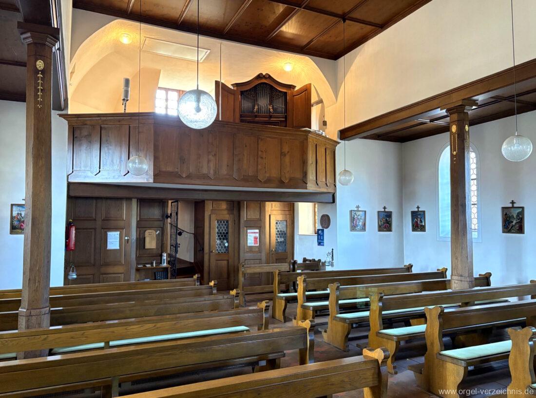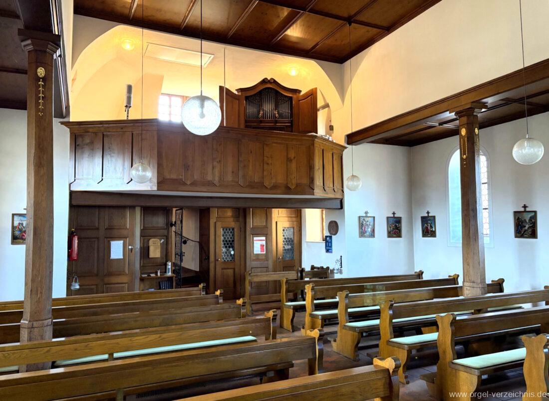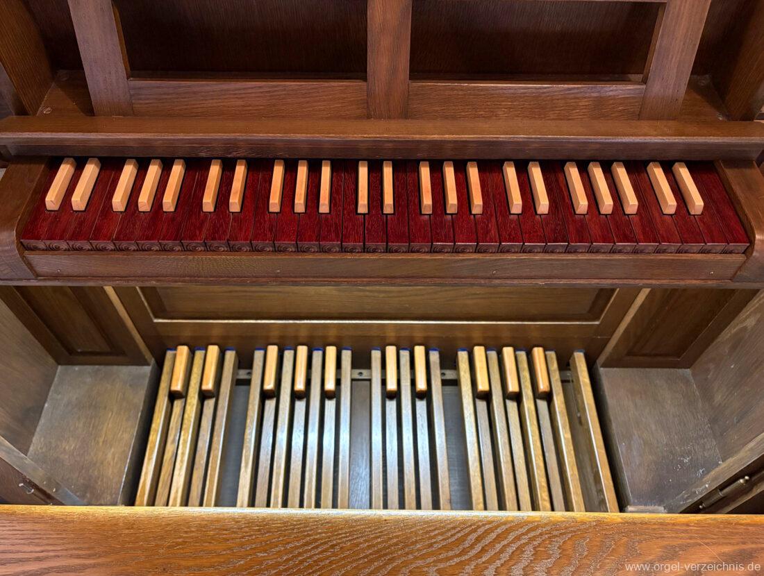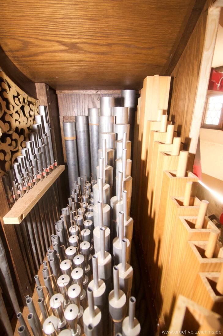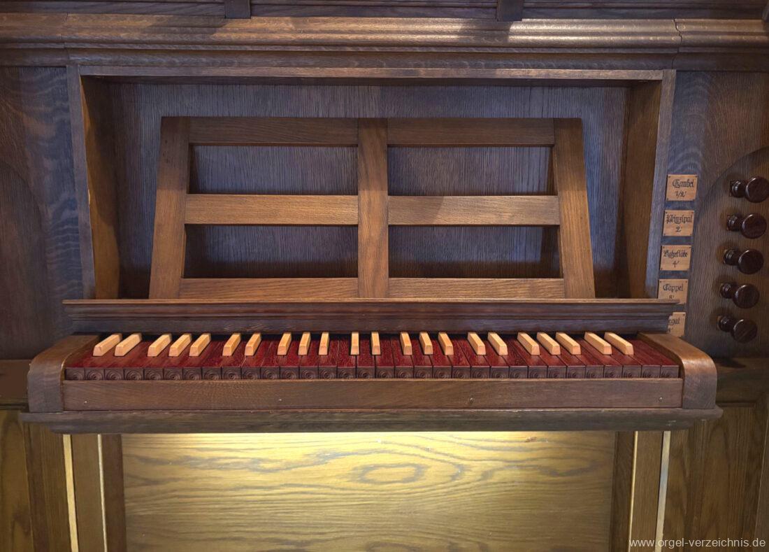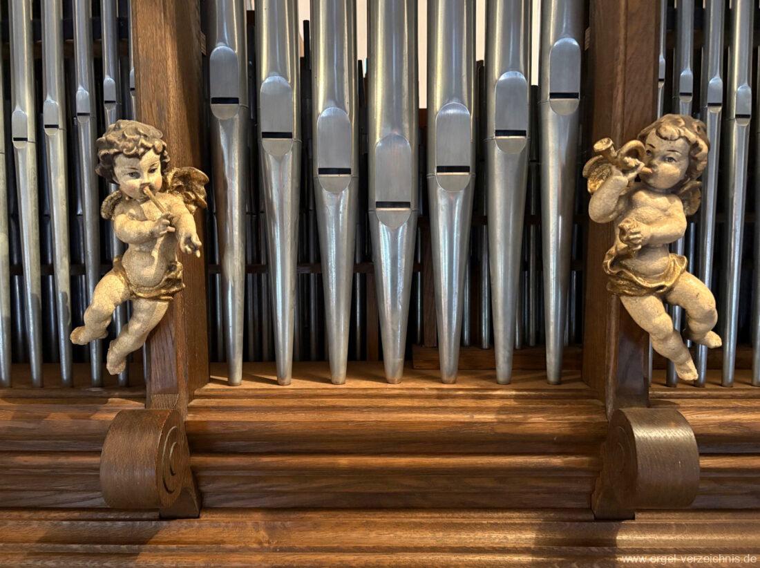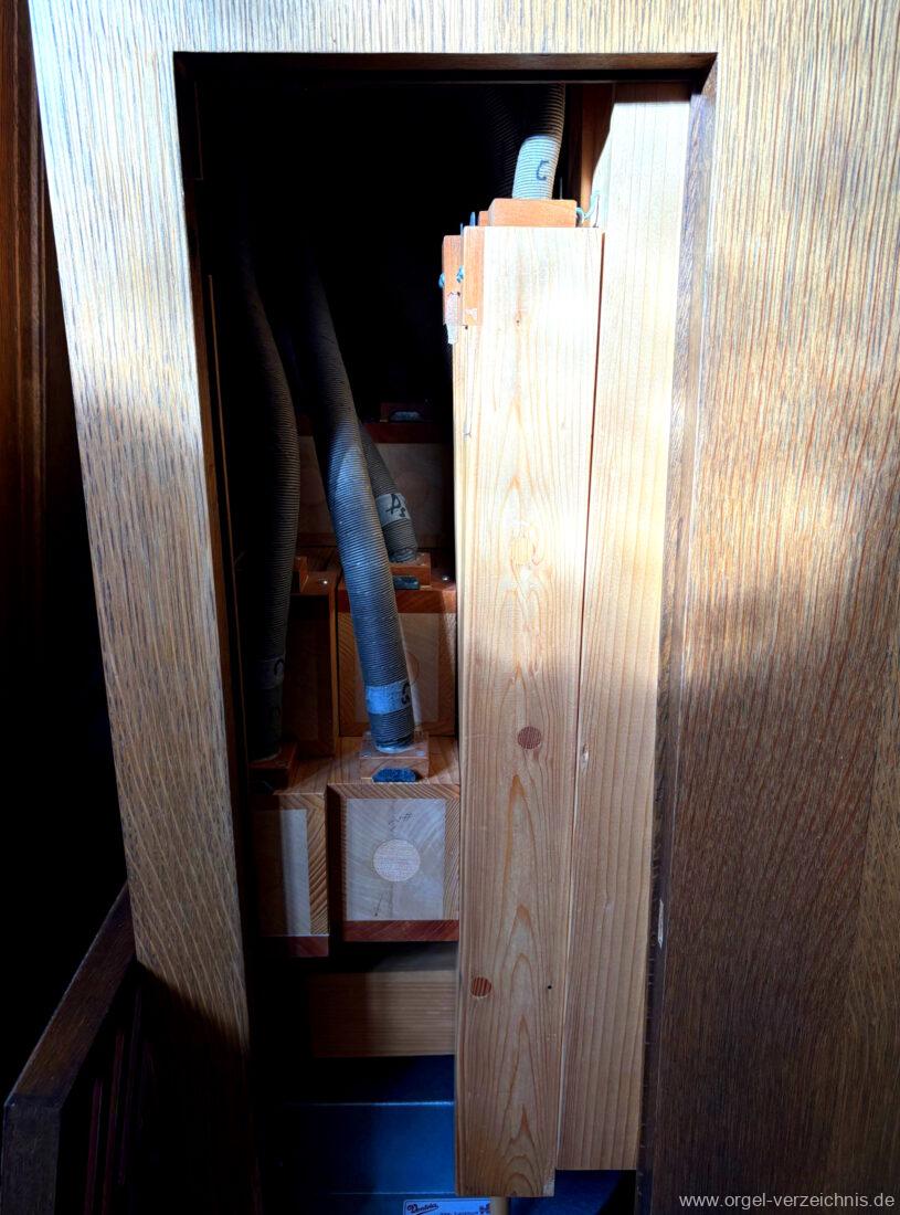 1980 mechanisches Schleifladenpositiv mit klappbaren Gehäuseflügeltüren (welche auch den Spieltisch mit einschliessen), erbaut von Orgelbauer Heinz Boschert (Emmendingen-Windenreute) I/5 mit angehängtem Pedal. Das Gehäuse ist bis auf die beiden Figuren von Boschert im historisch angelehnten Stil neu erstellt worden.