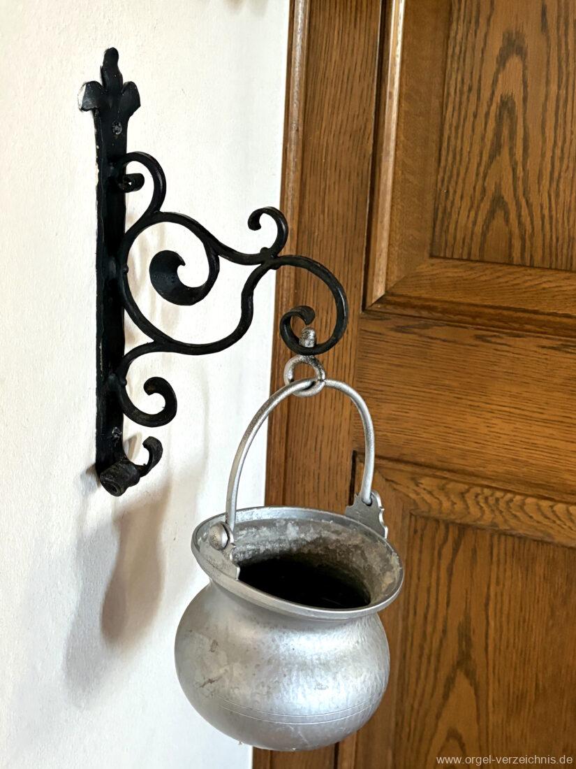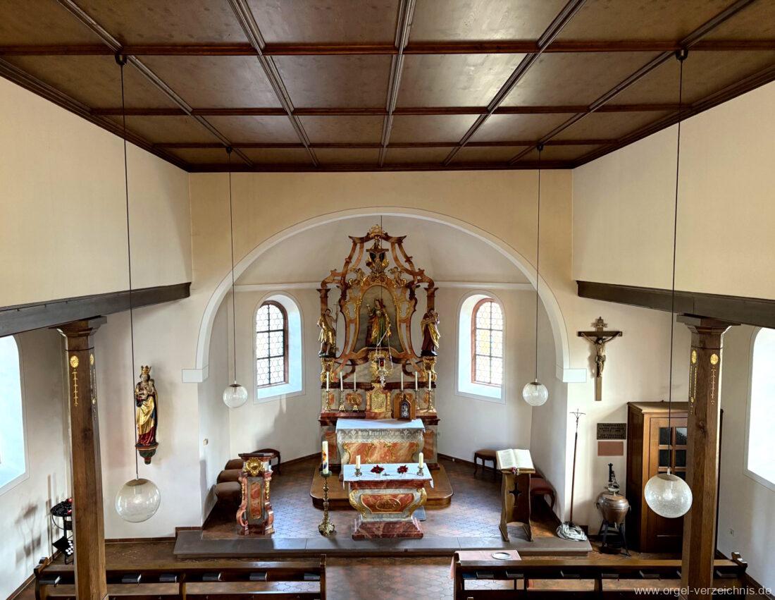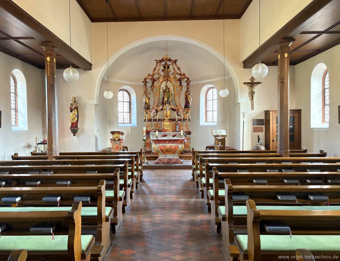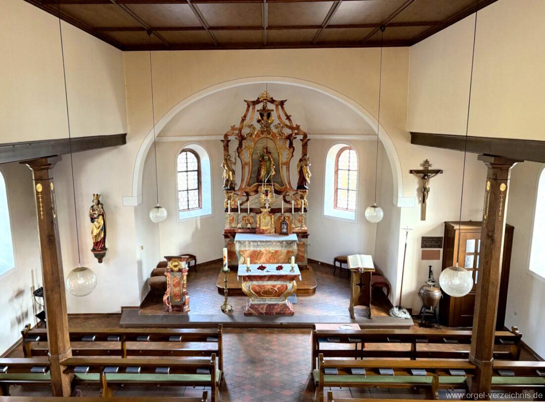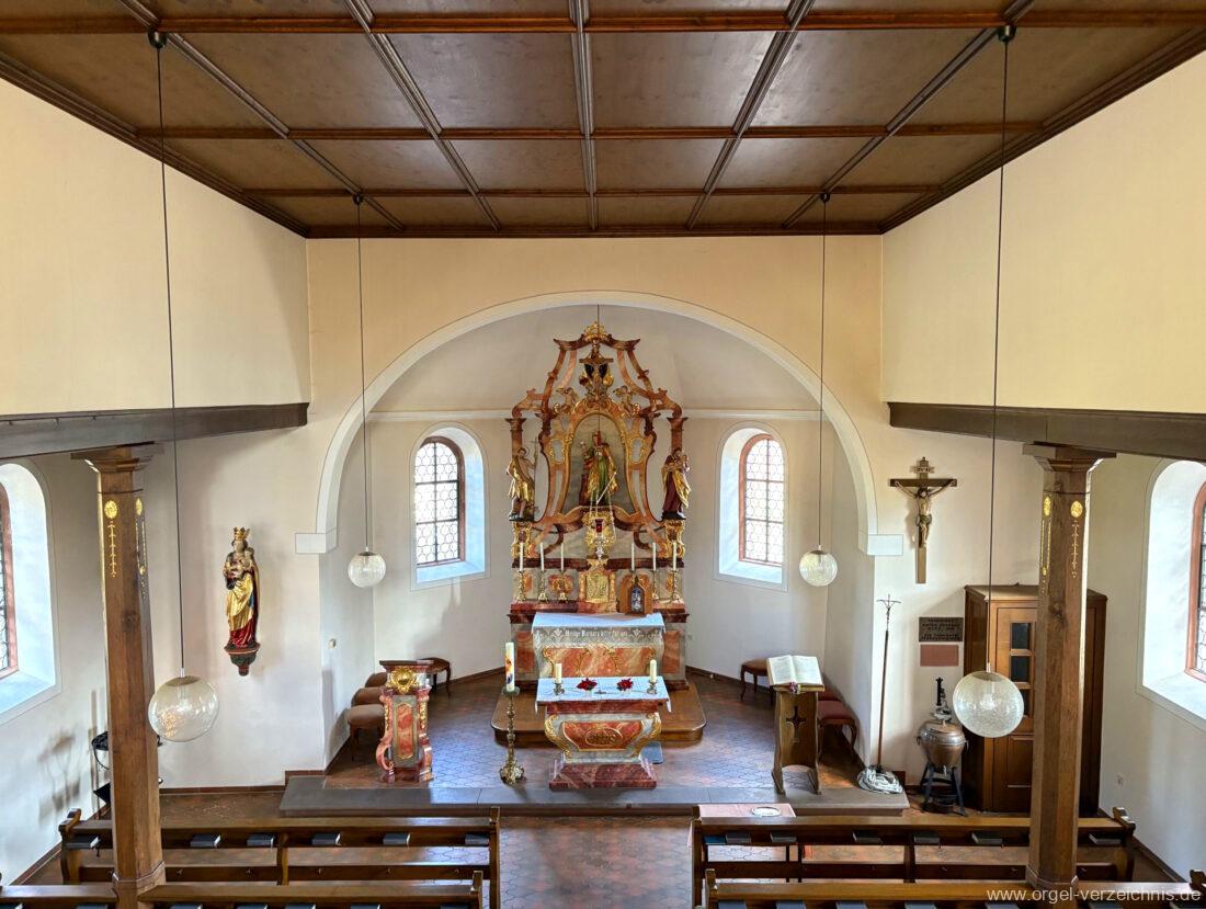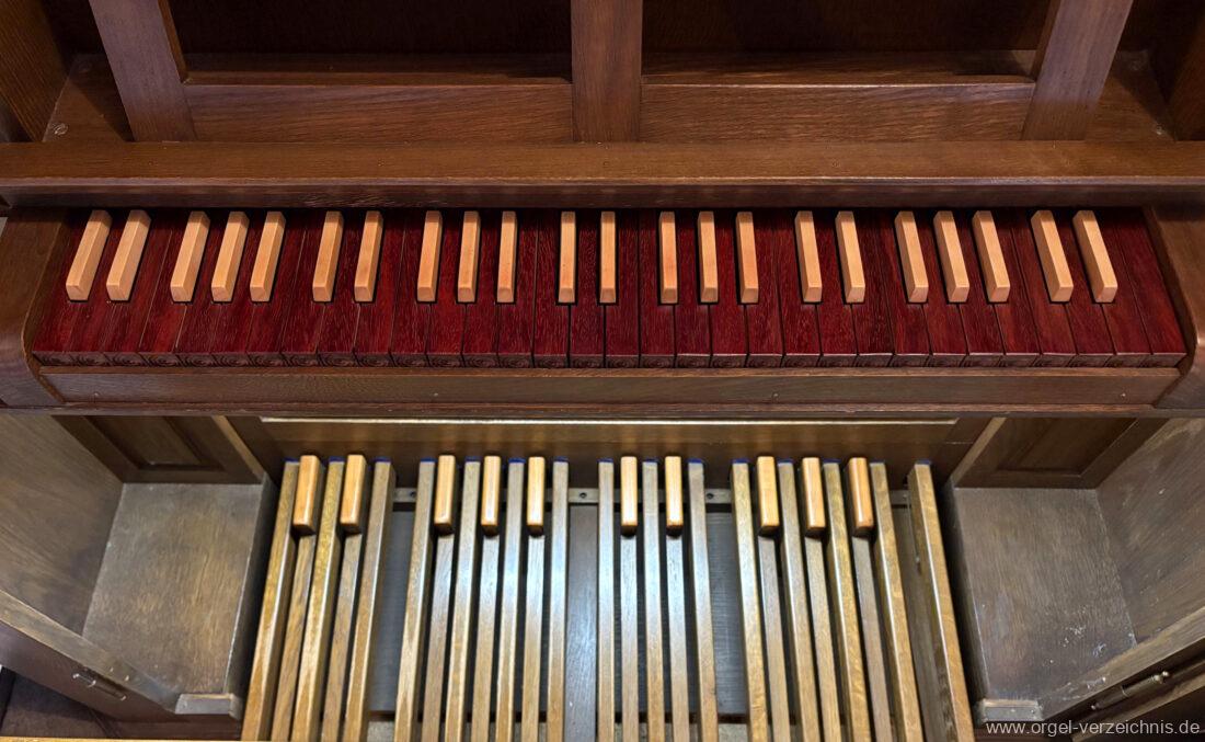 1980 mechanisches Schleifladenpositiv mit klappbaren Gehäuseflügeltüren (welche auch den Spieltisch mit einschliessen), erbaut von Orgelbauer Heinz Boschert (Emmendingen-Windenreute) I/5 mit angehängtem Pedal. Das Gehäuse ist bis auf die beiden Figuren von Boschert im historisch angelehnten Stil neu erstellt worden.