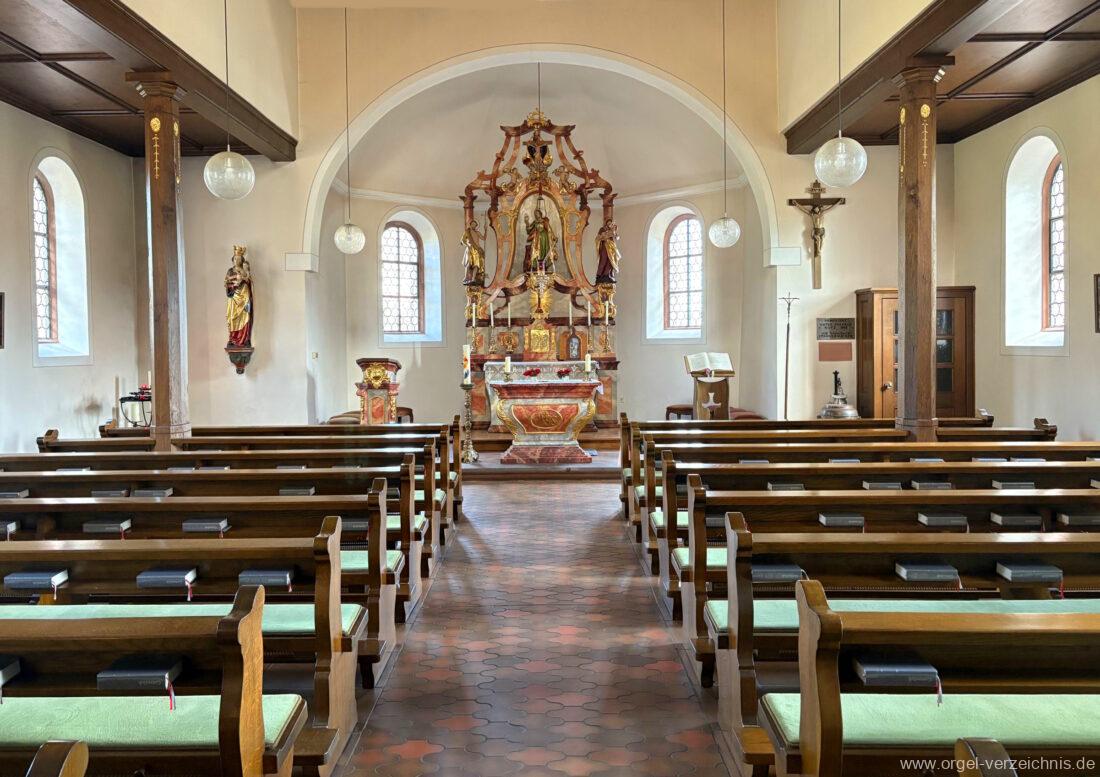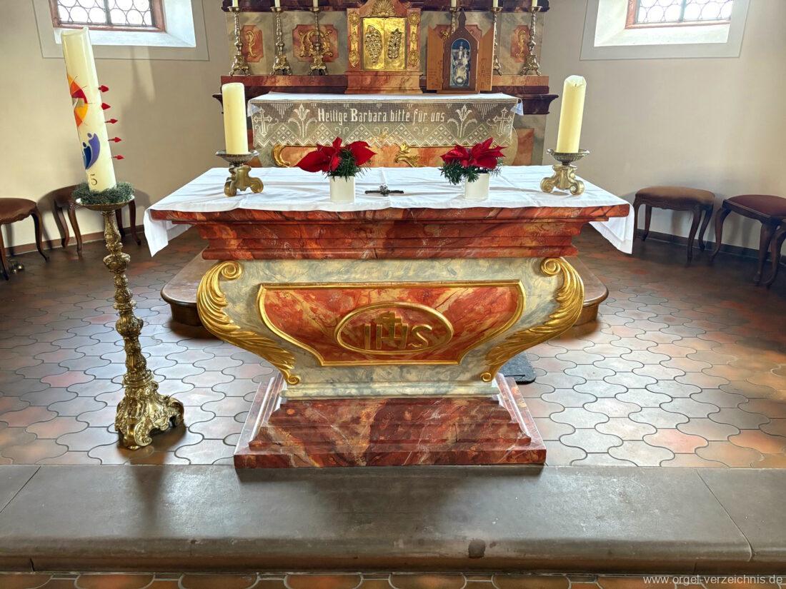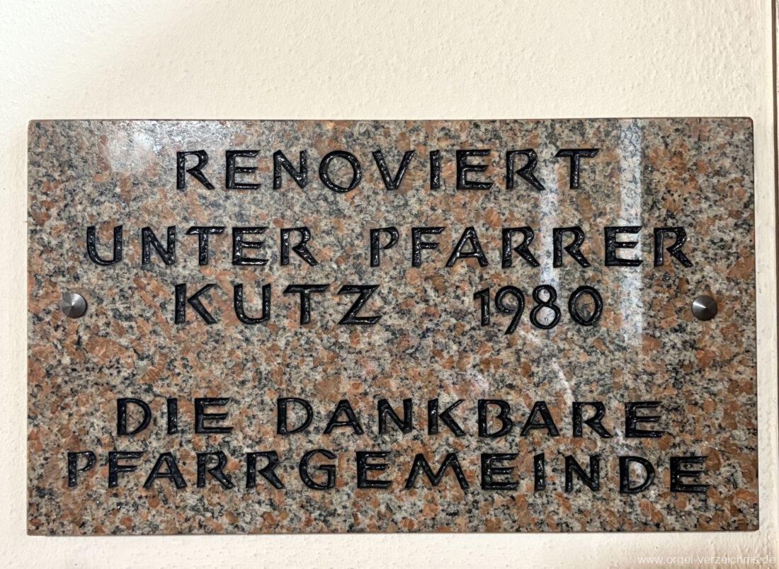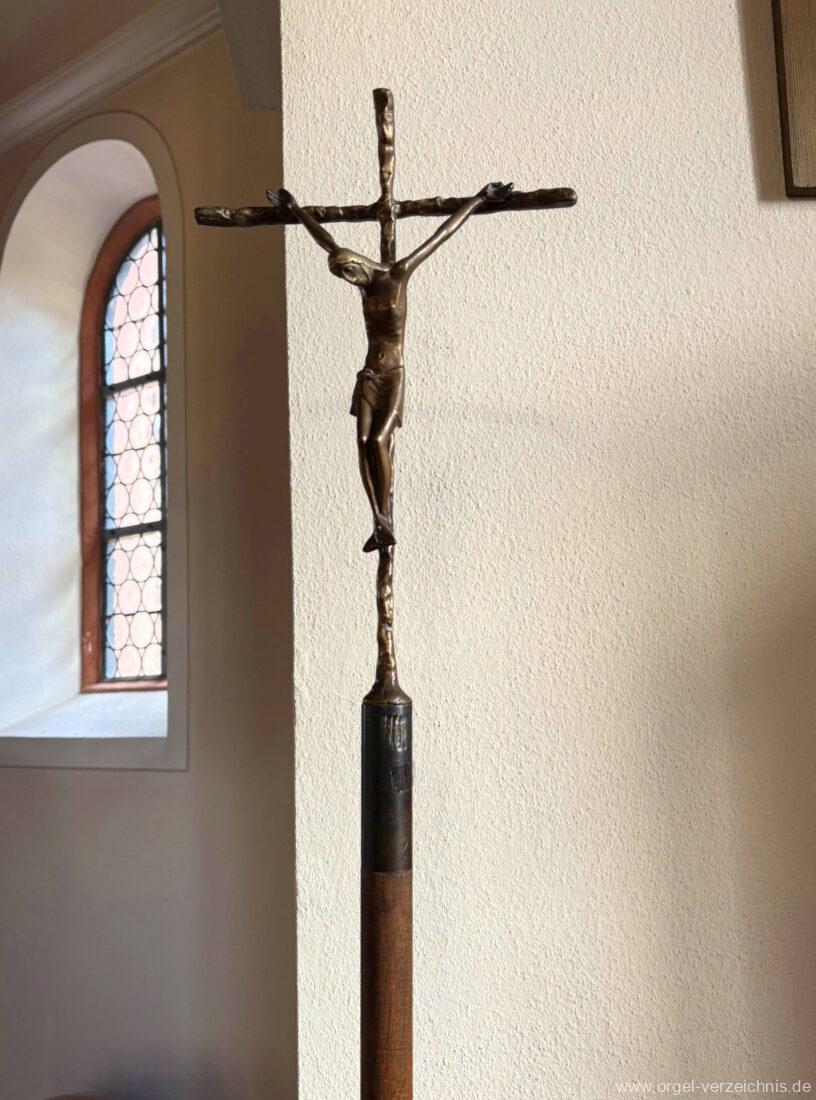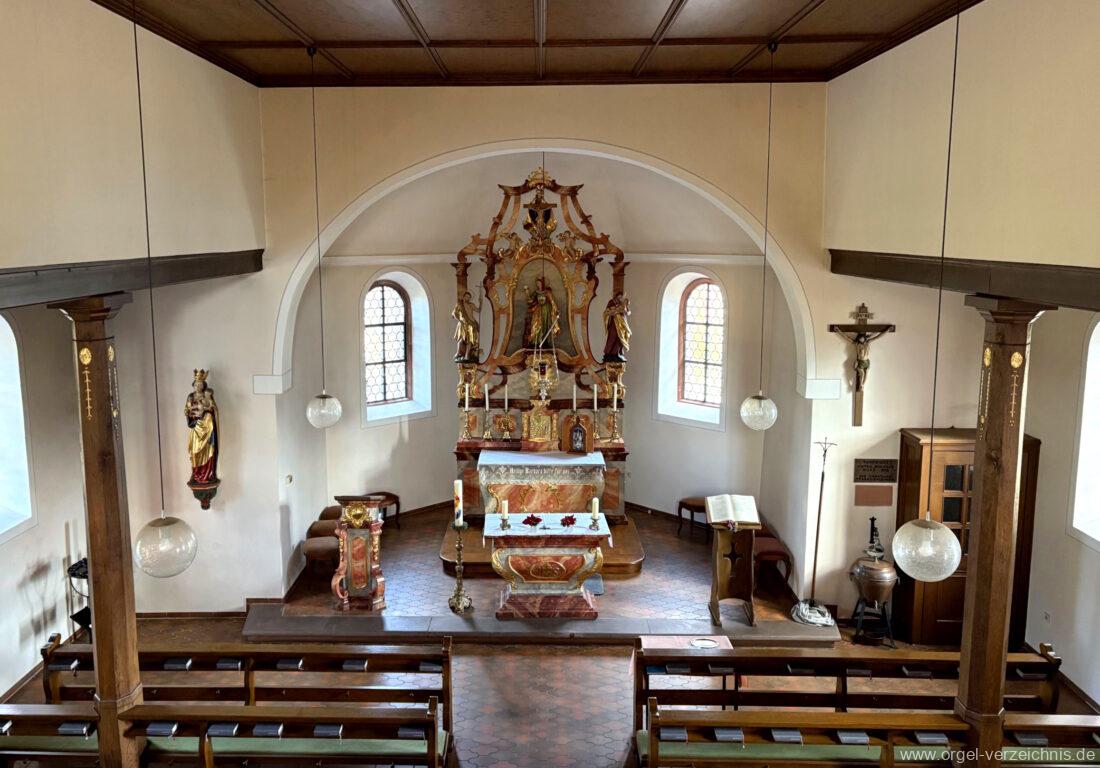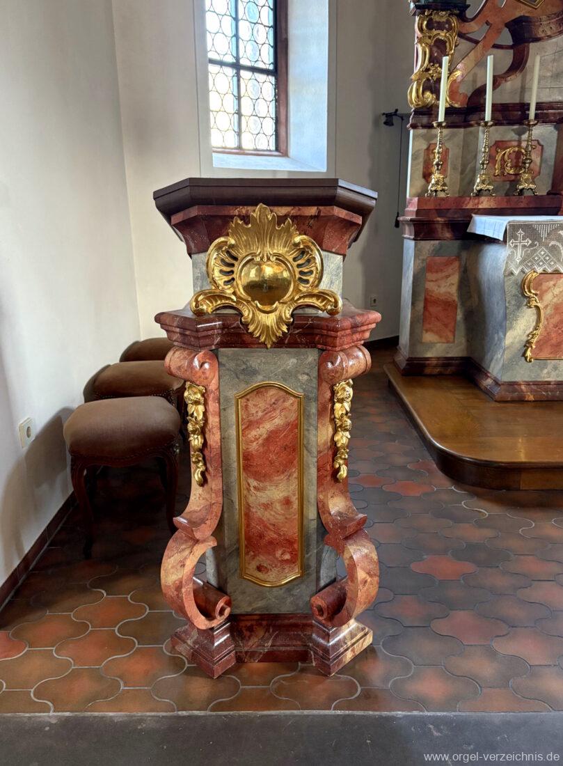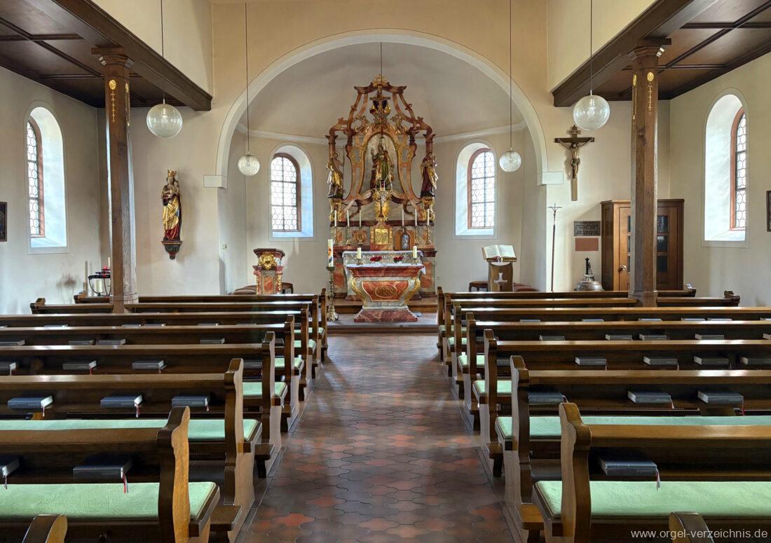 1980 mechanisches Schleifladenpositiv mit klappbaren Gehäuseflügeltüren (welche auch den Spieltisch mit einschliessen), erbaut von Orgelbauer Heinz Boschert (Emmendingen-Windenreute) I/5 mit angehängtem Pedal. Das Gehäuse ist bis auf die beiden Figuren von Boschert im historisch angelehnten Stil neu erstellt worden.