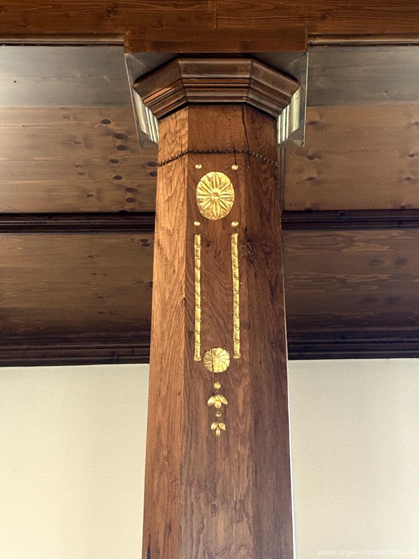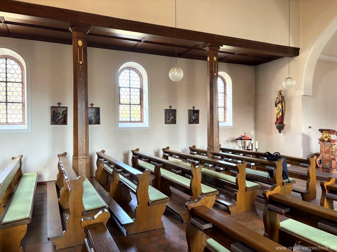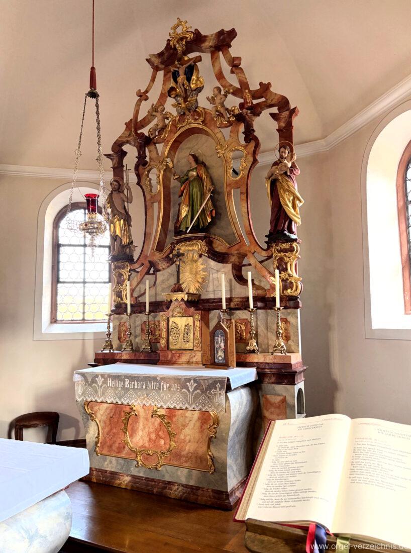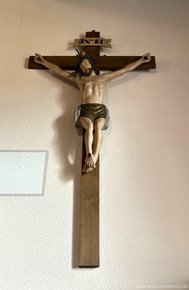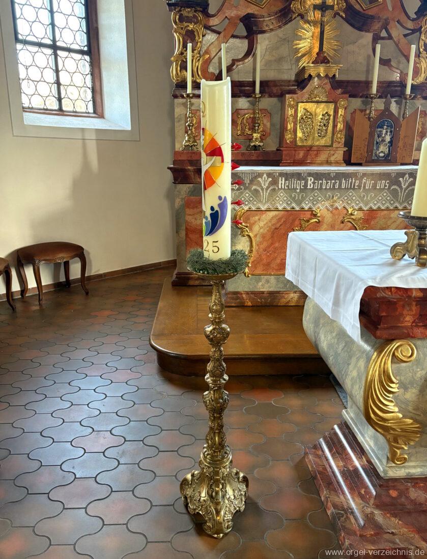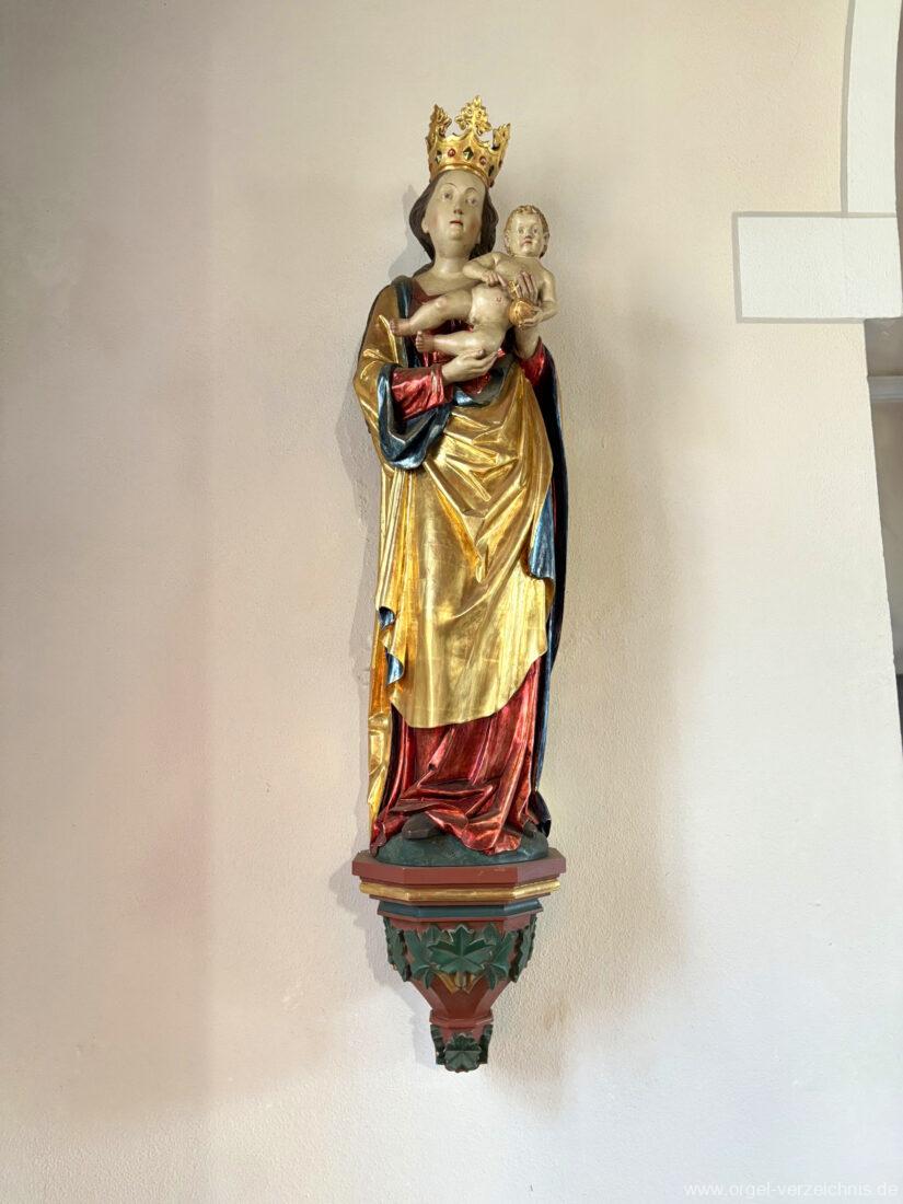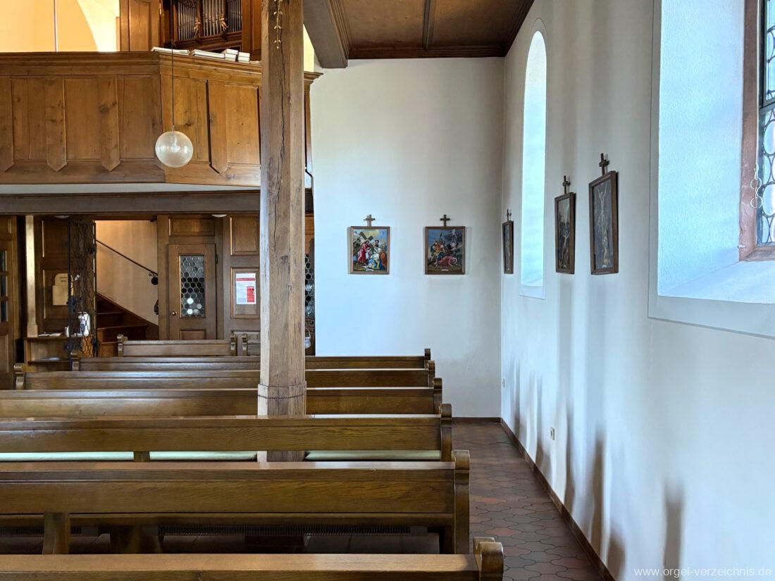 1980 mechanisches Schleifladenpositiv mit klappbaren Gehäuseflügeltüren (welche auch den Spieltisch mit einschliessen), erbaut von Orgelbauer Heinz Boschert (Emmendingen-Windenreute) I/5 mit angehängtem Pedal. Das Gehäuse ist bis auf die beiden Figuren von Boschert im historisch angelehnten Stil neu erstellt worden.