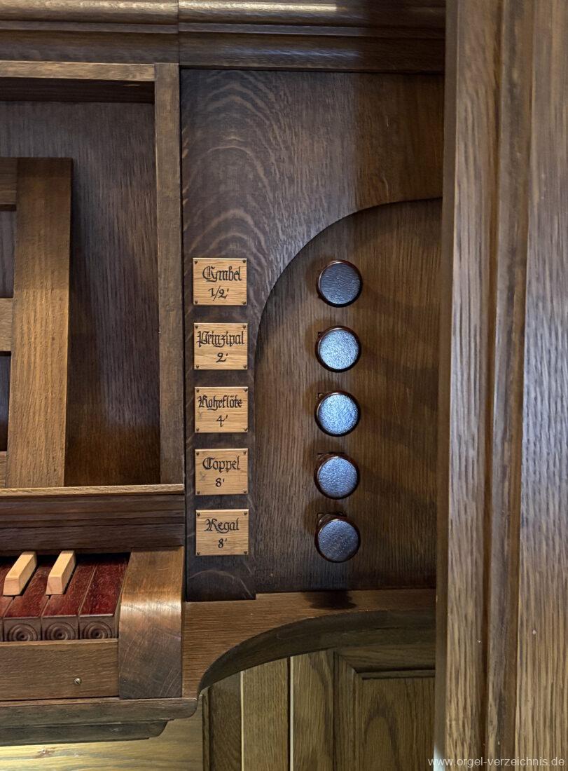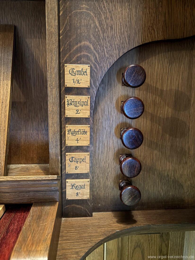 Cymbel 1/2′ Prinzipal 2′ Rohrflöte 4′ Coppel 8′ Regal 8′