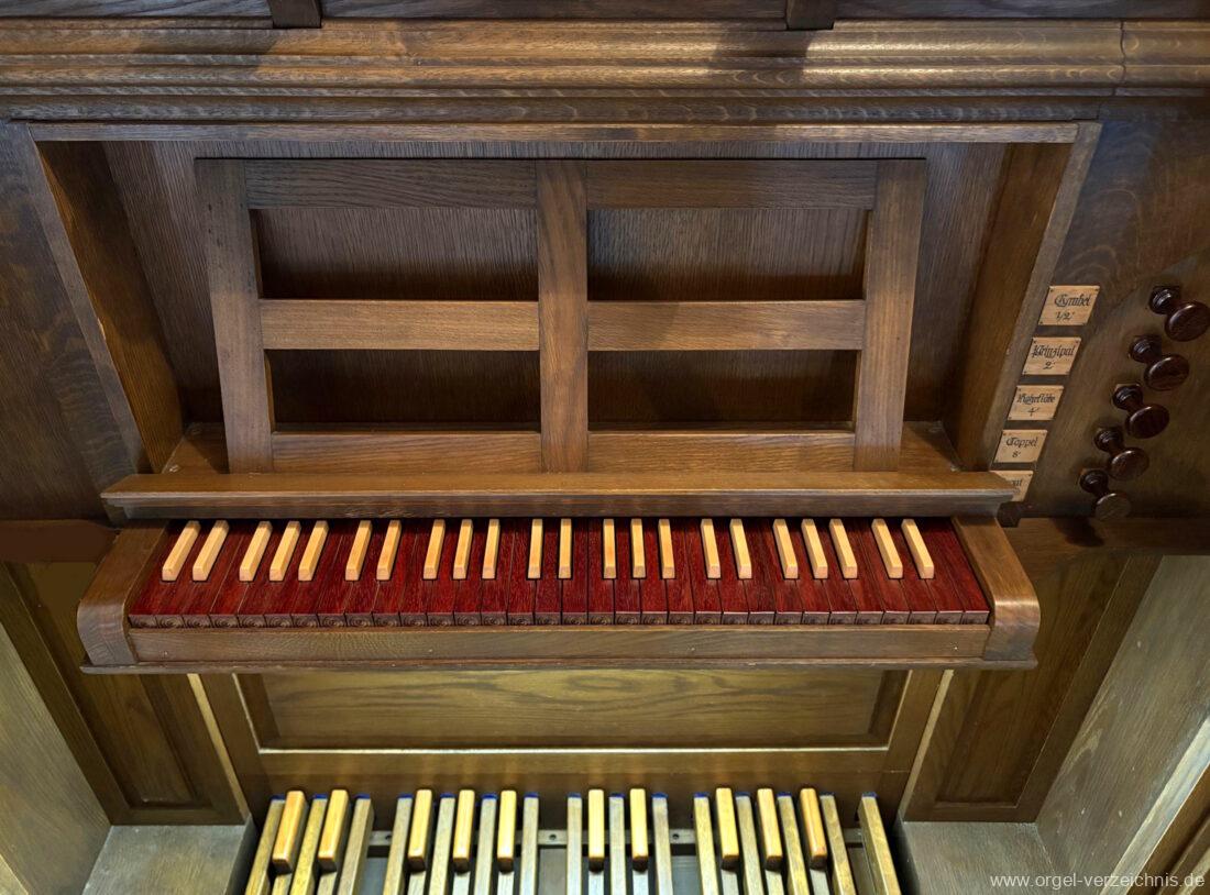 Manual C – f“‘Coppel 8′ Holz ged. Rohrflöte 4′ Metall rohrged.; ab f“ offen konisch Prinzipal 2′ C – e‘ Prospekt; ab f‘ innen, Metall Cymbel 1/2′ I-II; ab c° II – rep. c°/c’/c“/fs“; Metall Regal 8′ Stiefel Metall/Becher Metall, konisch, halbged.
