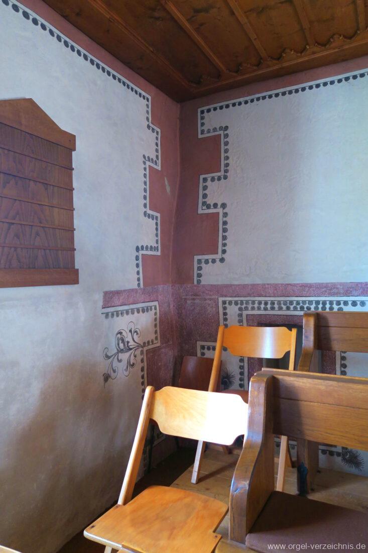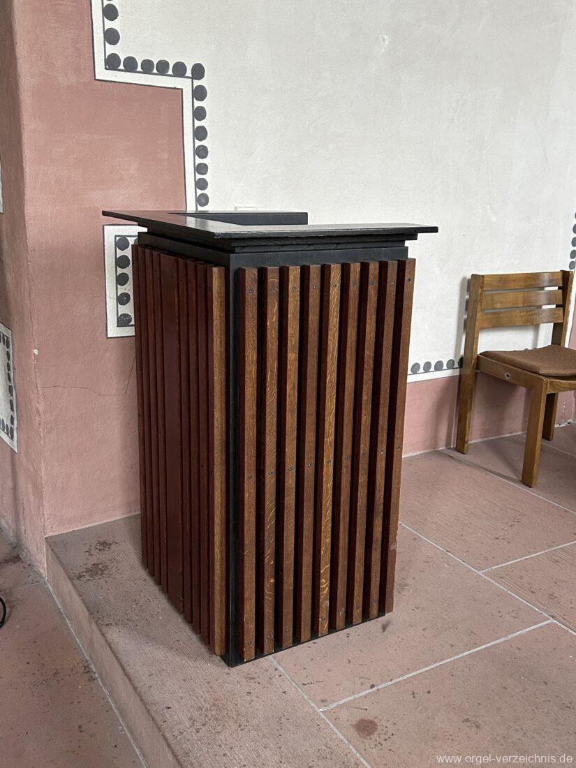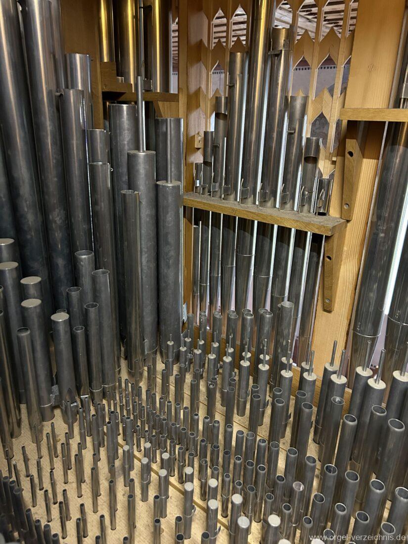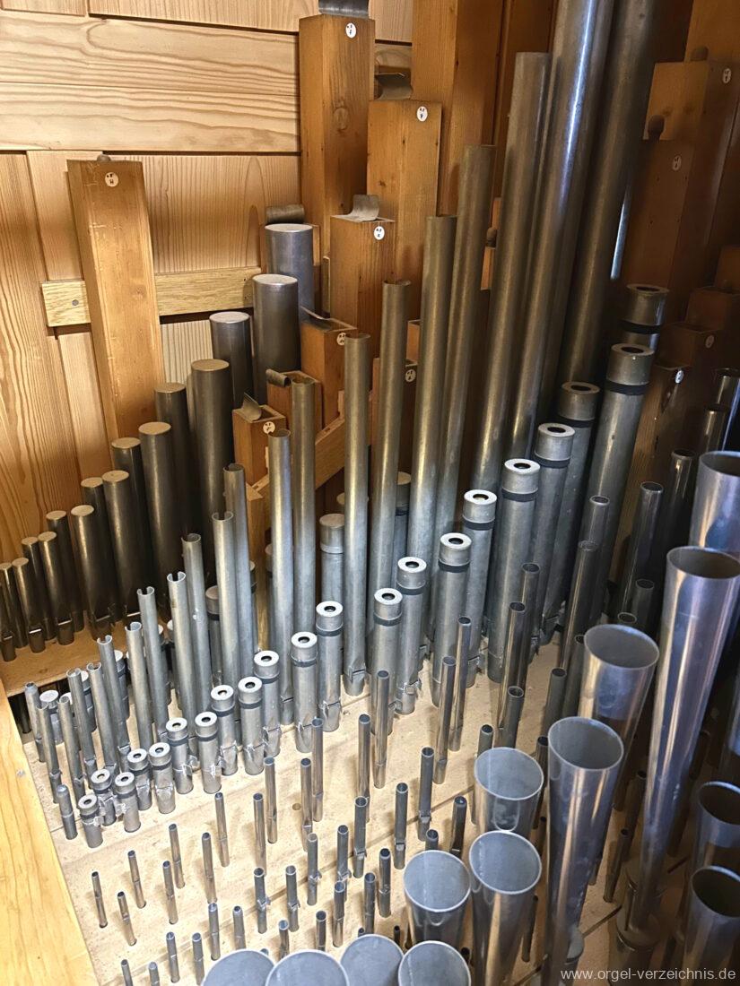 Pedal C – f‘Subbaß 16p. aus Vorgängerorgel, Tr. aus SW Holzflöte 8p. aus Vorgängerorgel, Holz offen, innen labiiert Gedeckt 8p. aus Vorgängerorgel, Tr. aus SW Flöte 4p. aus Vorgängerorgel, Tr. aus SW Clairon 4′ Stiefel/Becher Metall, fr. Bauart, später eingebaut