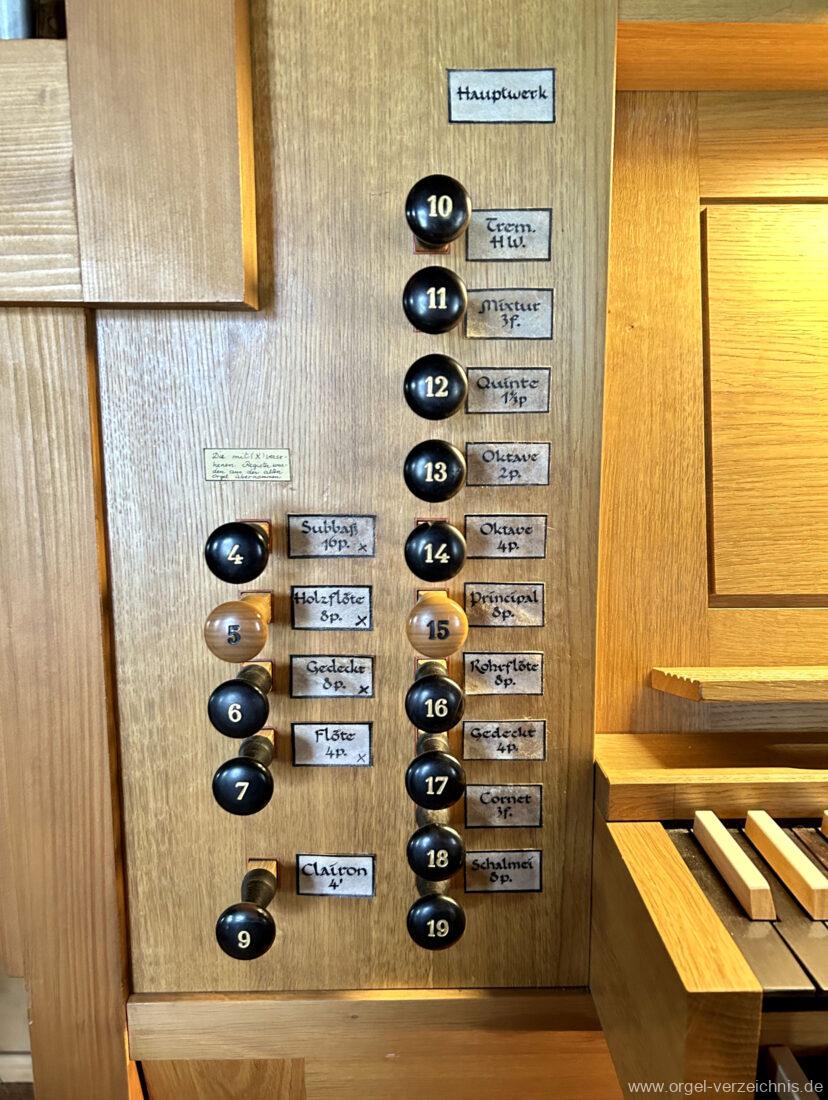 Linke Seite innere ReiheTrem. HW. Mixtur 3f. Quinte 1 1/3p Oktave 2p. Oktave 4p. Principal 8p. Rohrflöte 8p. Gedeckt 4p. Cornet 3f. Schalmei 8p.