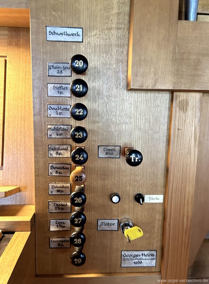 1988 rein mechanische Schleifladenorgel mit mittig fest ins Hauptgehäuse eingelassenem Spieltisch, erbaut als Opus 101 auf der Nordempore durch Orgelbau Georges Heintz (Schiltach) II/20 + 3 Transmissionen. Aus der Vorgängerorgel wurden sechs Register übernommen, drei davon wurden als Transmissionen für das Pedalwerk eingerichtet.