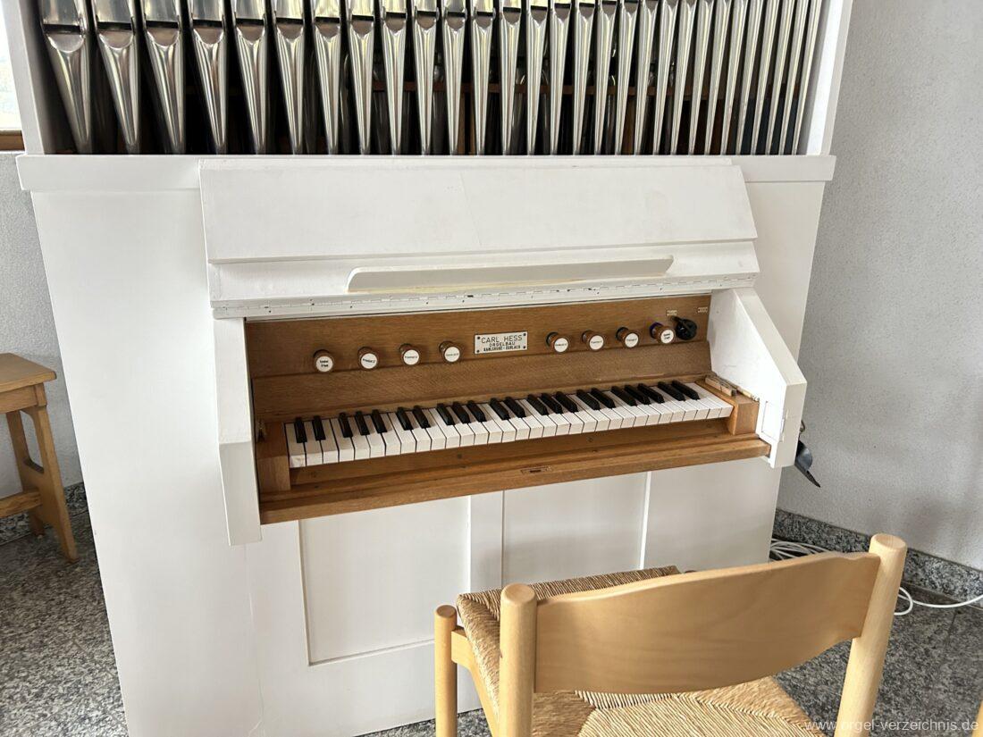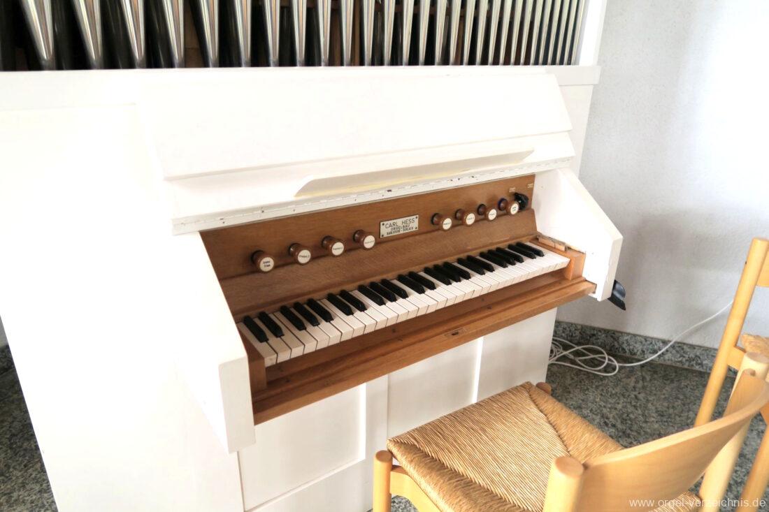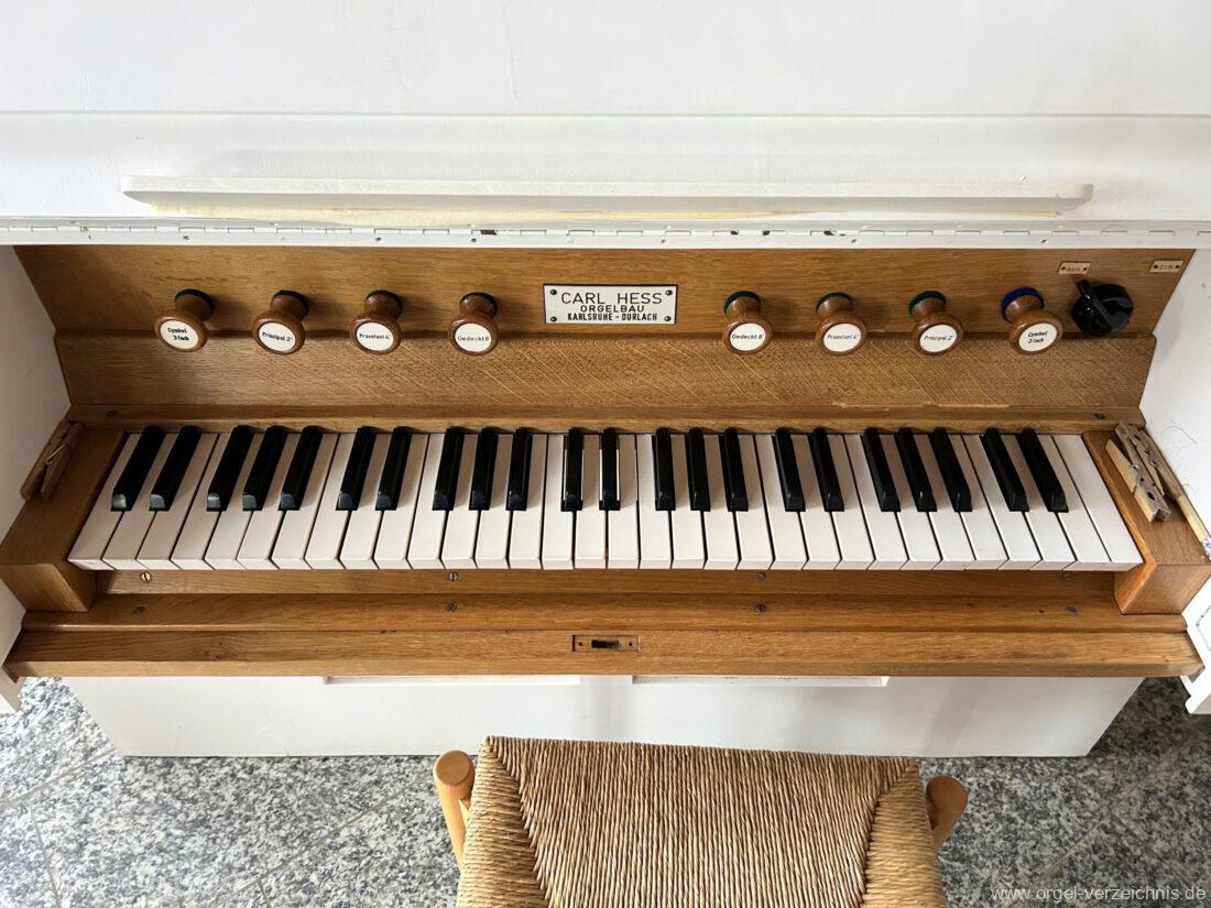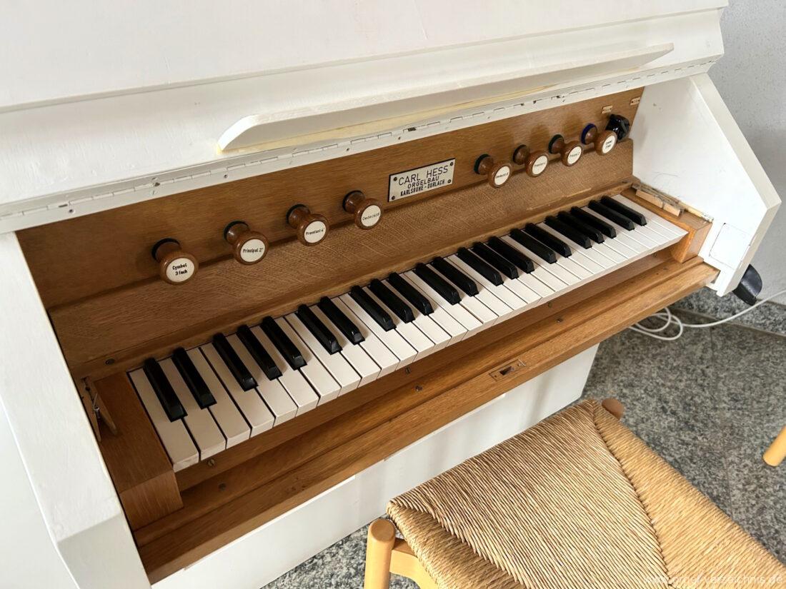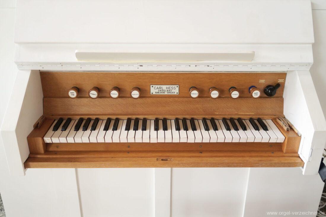Um 1950 mechanisches Schleifladenpositiv, erbaut für einen Standort in Freiburg im Breisgau durch Orgelbauer Carl Hess (Karlsruhe-Durlach) I/4 (Bass/Discant-Teilung) ohne Pedal.