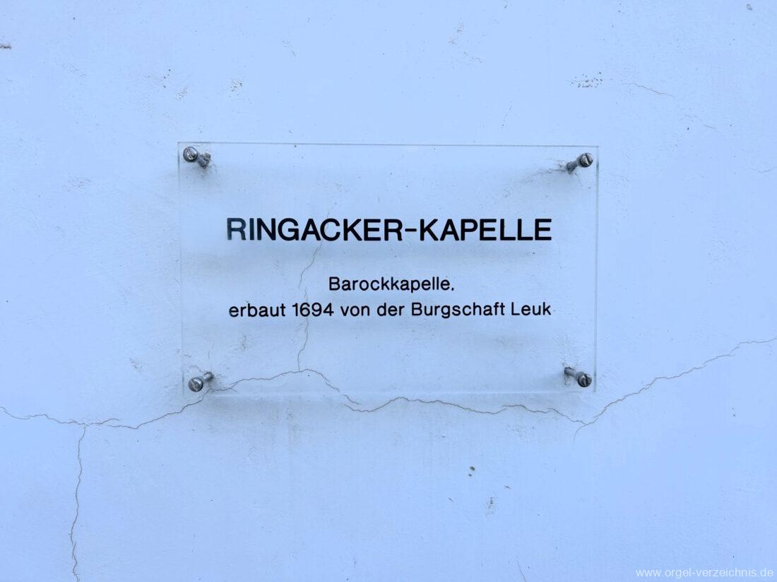 Orgelgeschichte: Eigene Sichtung und Spiel 2023, zitiert aus dem Restaurierungsbericht von Rudolf Bruhin „Die Orgel der Ringackerkapelle zu Leuk“ mit Forschungen von Herrn Philipp Kalbermatter (Turtmann), zitiert aus den Dokumenten von Rudolf Bruhin „Die Orgeln des Oberwallis“ und „Das Oberwallis als Orgellandschaft“