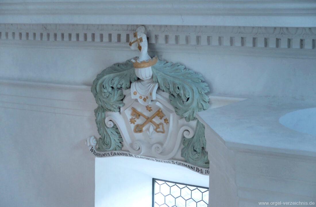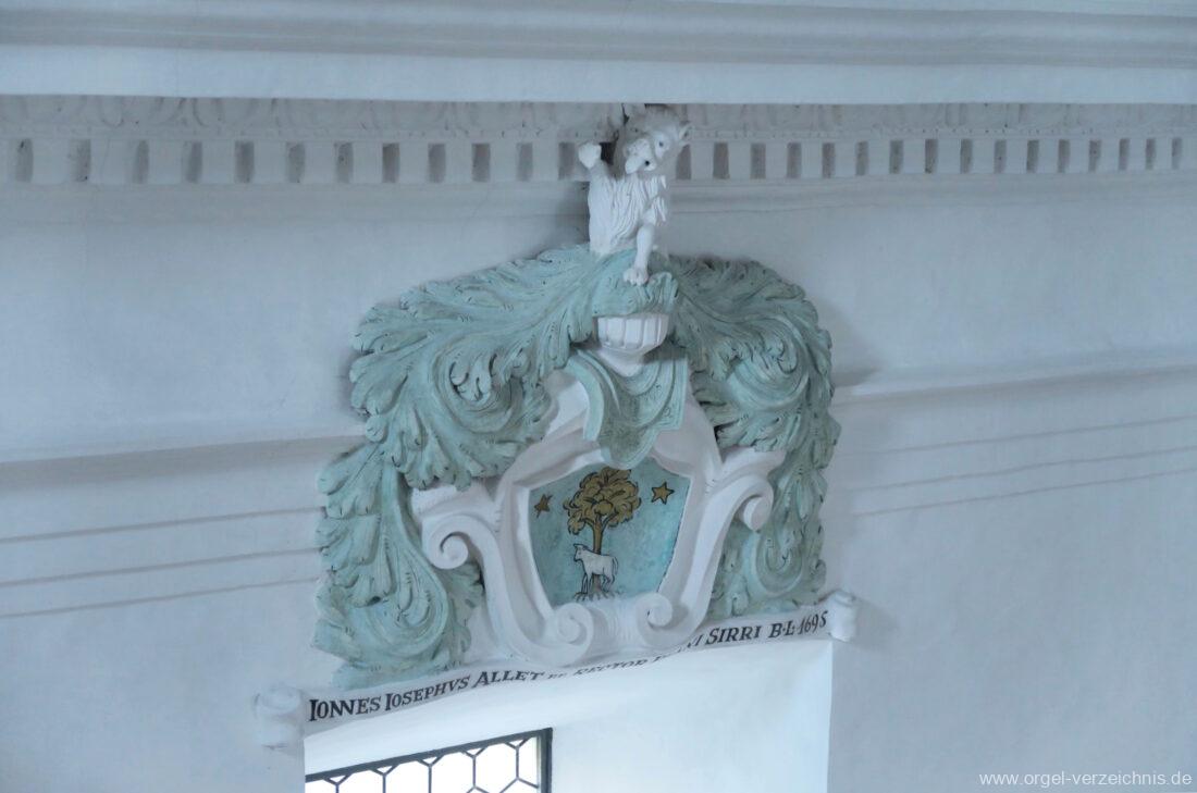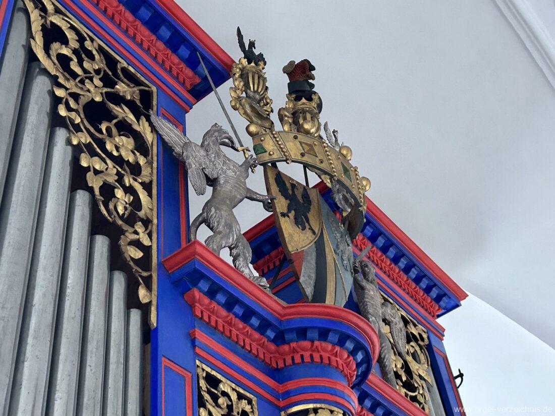 Im 19. Jahrhundert wird das Gehäuse mit einem Wappen versehen, Entfernung der Prospektflügeltüren.