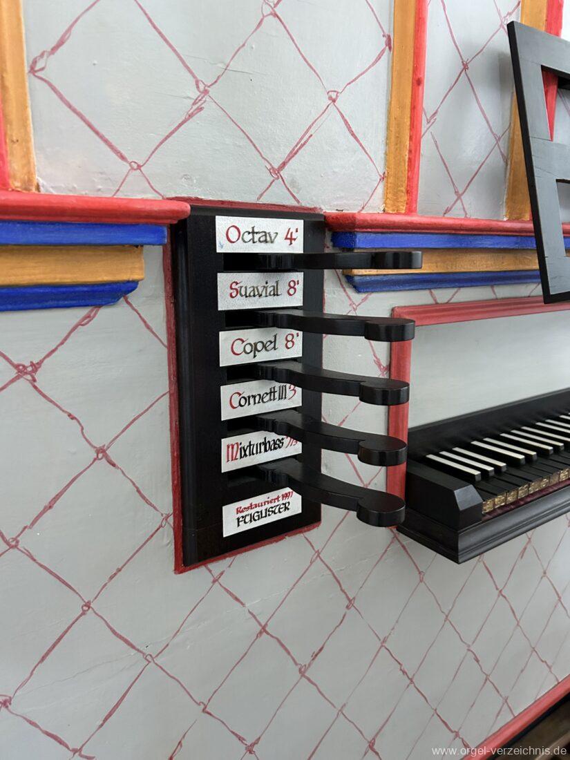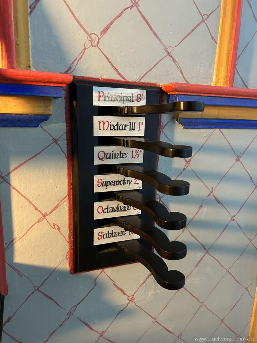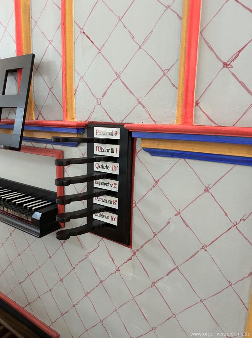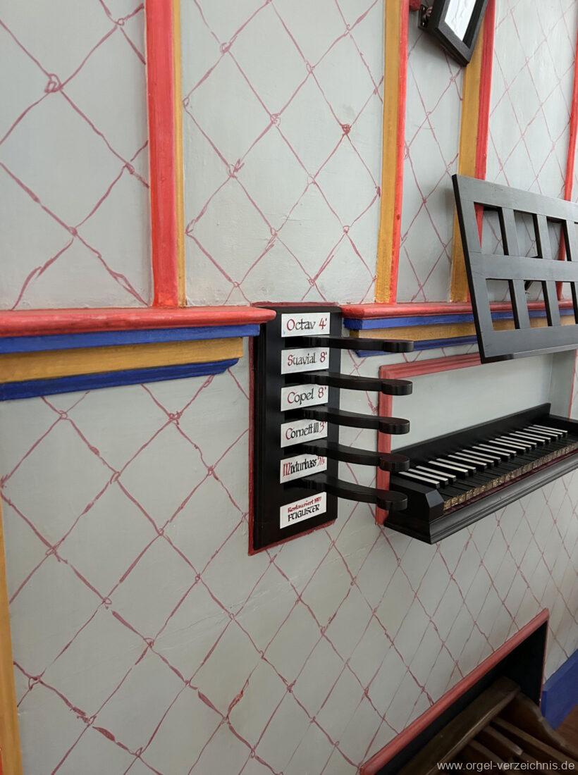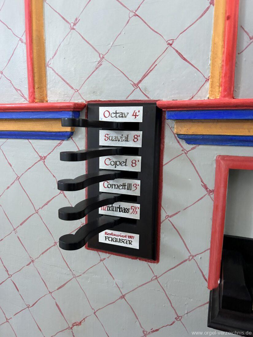 Manual C, D, E, F, G, A – c“‘Principal 8′ Prospekt C – b“; h“/c“‘ innen – Anm. 1 Suavial 8′ ab c‘; Metall Copel 8′ C – H Holz ged.; ab c° Metall ged. Octav 4′ Metall Superoctav 2′ Metall Quinte 1 1/3′ Metall; rep. fs“ zu fs‘ Cornett III 3′ ab C!; Metall; Bass/Disc. Teilung c’/cs‘ (Abschaltung Bass rechts hinter dem Gehäuse) Mixtur III 1′ rep. c°/c’/c“; Metall