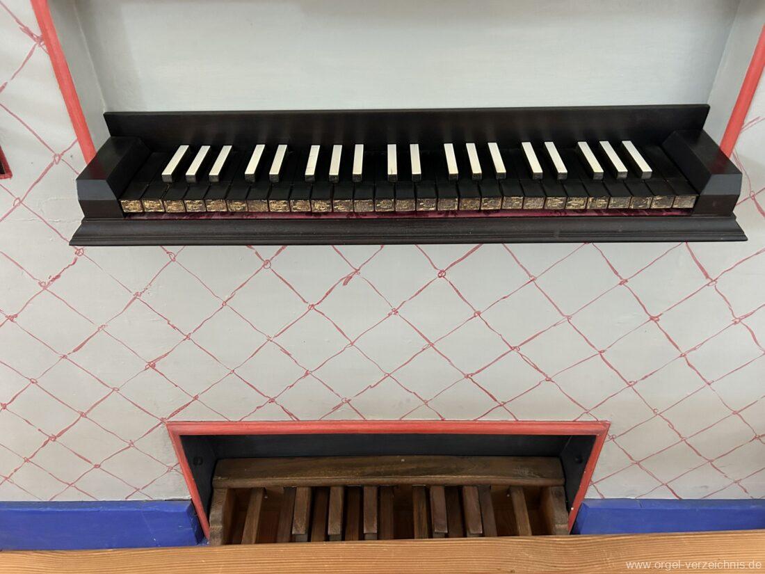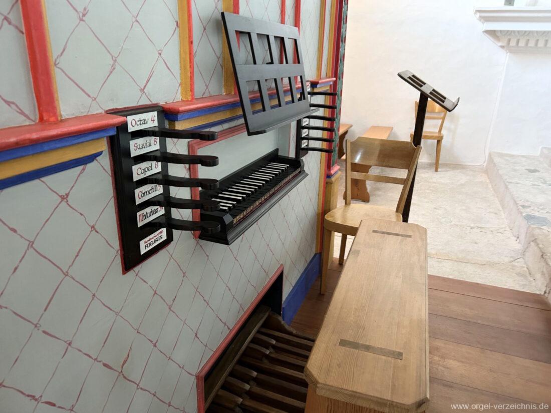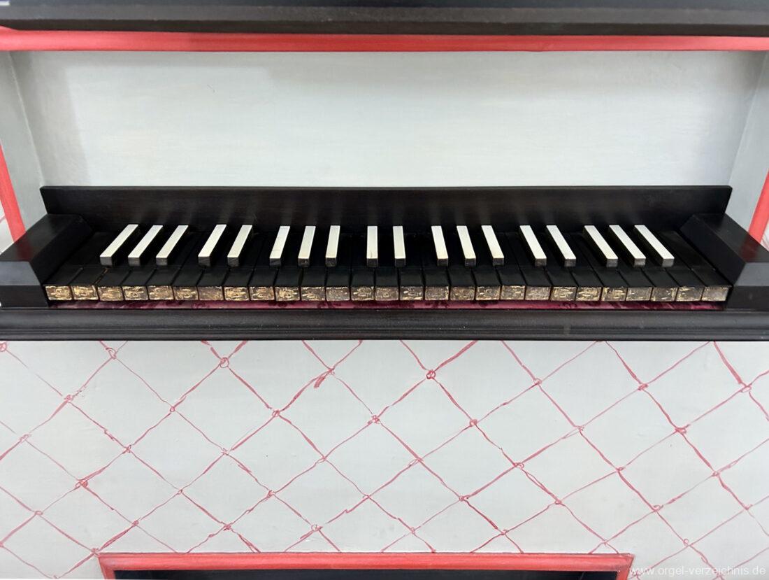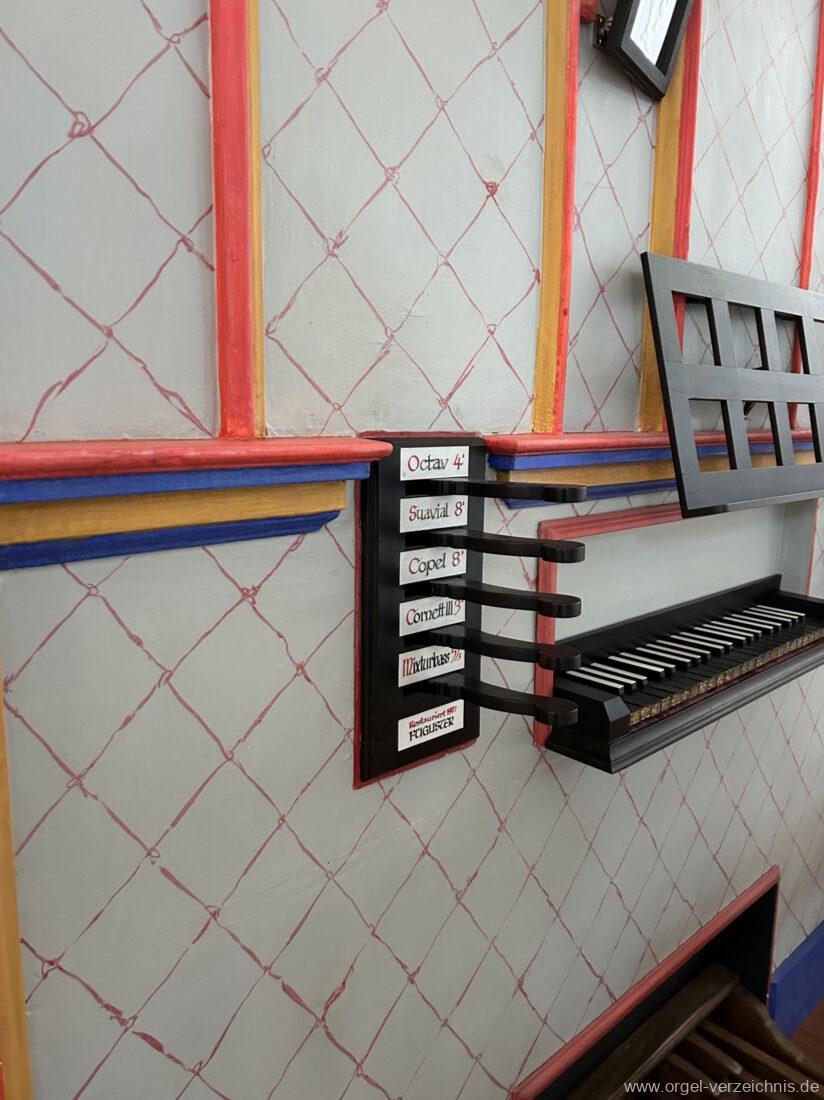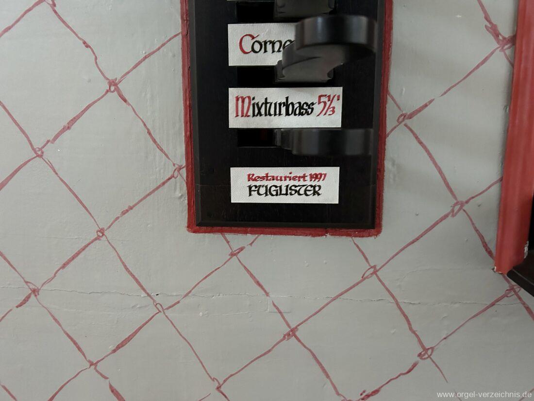 Manual C, D, E, F, G, A – c“‘Principal 8′ Prospekt C – b“; h“/c“‘ innen – Anm. 1 Suavial 8′ ab c‘; Metall Copel 8′ C – H Holz ged.; ab c° Metall ged. Octav 4′ Metall Superoctav 2′ Metall Quinte 1 1/3′ Metall; rep. fs“ zu fs‘ Cornett III 3′ ab C!; Metall; Bass/Disc. Teilung c’/cs‘ (Abschaltung Bass rechts hinter dem Gehäuse) Mixtur III 1′ rep. c°/c’/c“; Metall