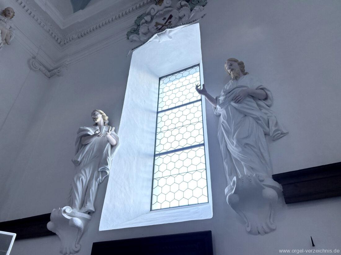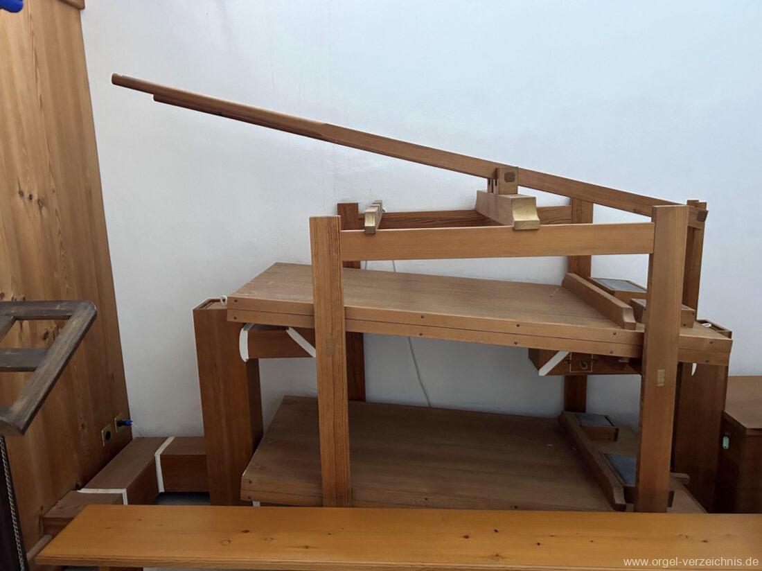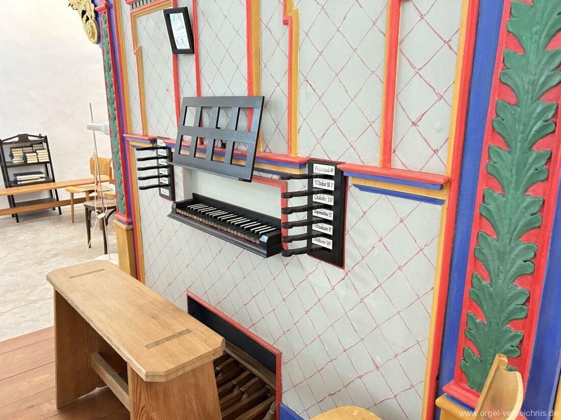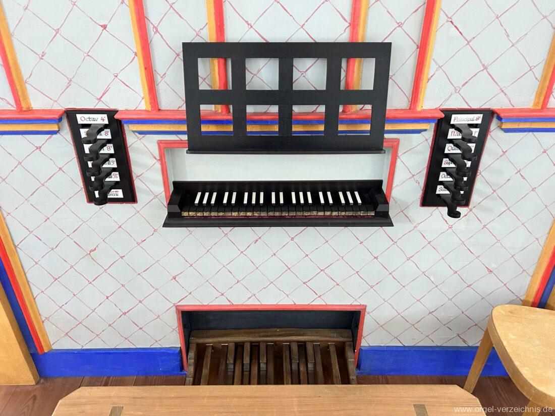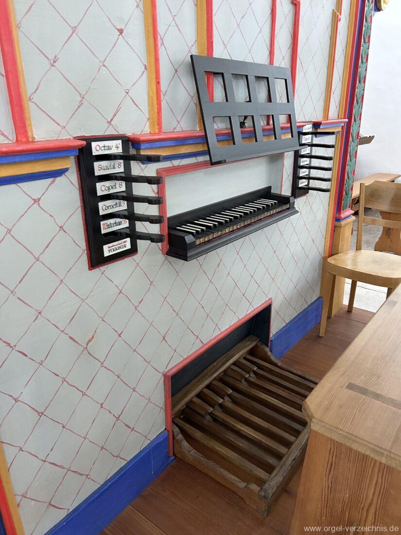 Manual C, D, E, F, G, A – c“‘Principal 8′ Prospekt C – b“; h“/c“‘ innen – Anm. 1 Suavial 8′ ab c‘; Metall Copel 8′ C – H Holz ged.; ab c° Metall ged. Octav 4′ Metall Superoctav 2′ Metall Quinte 1 1/3′ Metall; rep. fs“ zu fs‘ Cornett III 3′ ab C!; Metall; Bass/Disc. Teilung c’/cs‘ (Abschaltung Bass rechts hinter dem Gehäuse) Mixtur III 1′ rep. c°/c’/c“; Metall