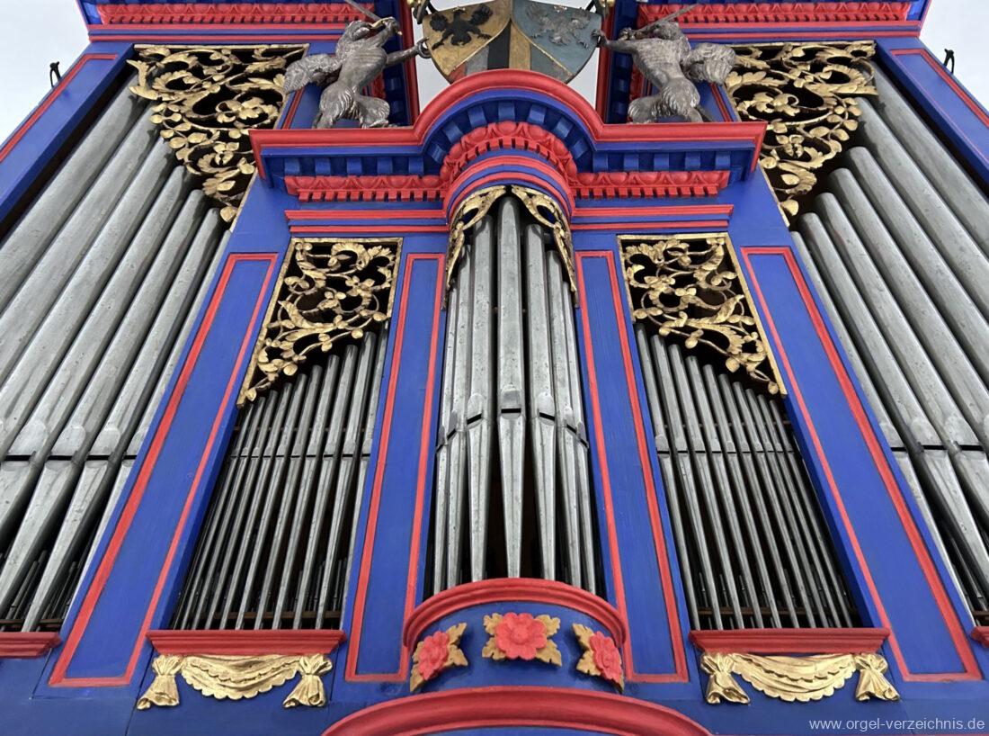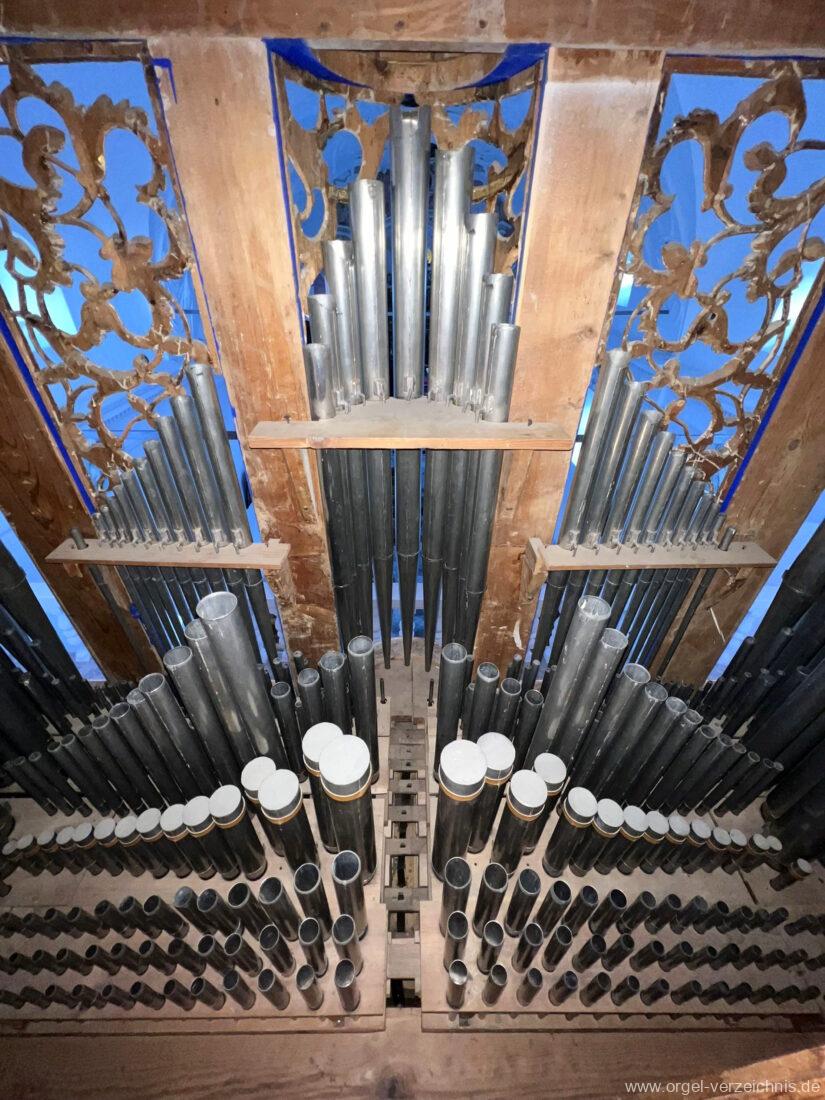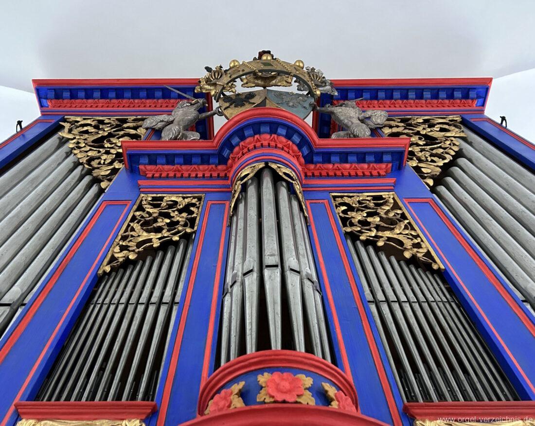 Principal 8′ im Prospekt: C/D/E/F/G/A – f° Aussenfelder, fs° – d‘ rundes Mittelfeld, ds‘ – b“ Flachfelder Mitte