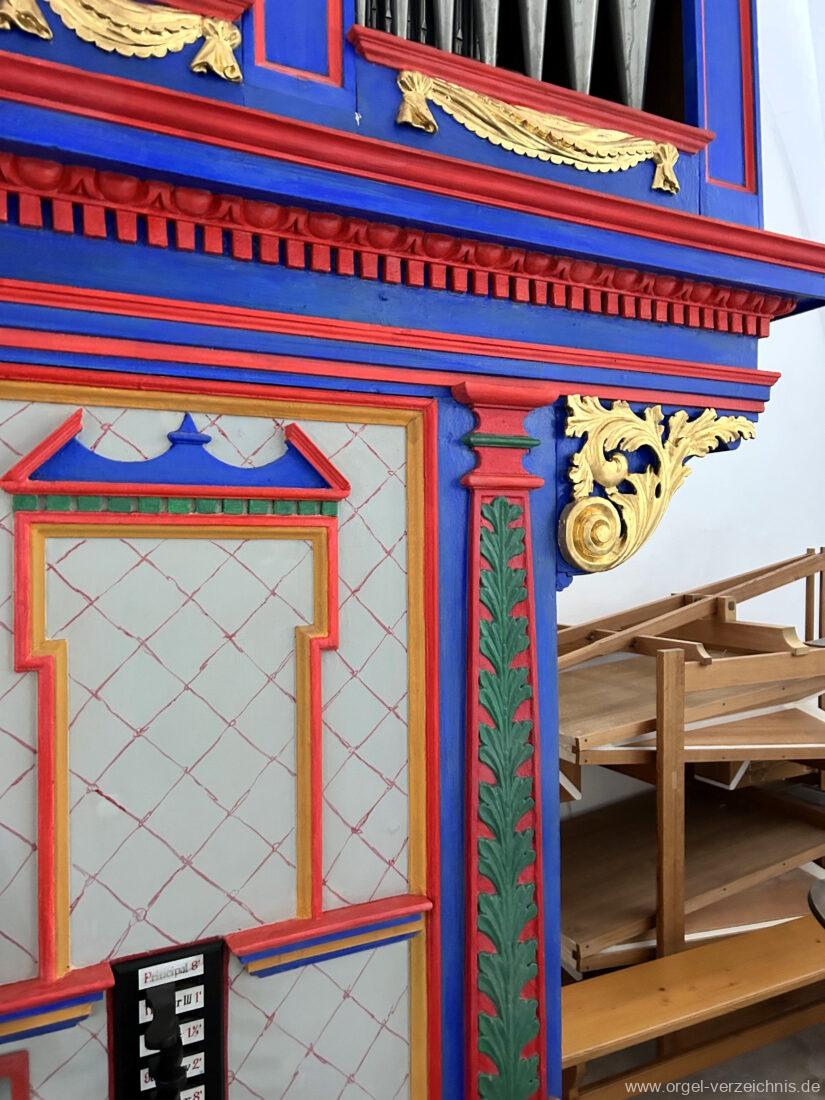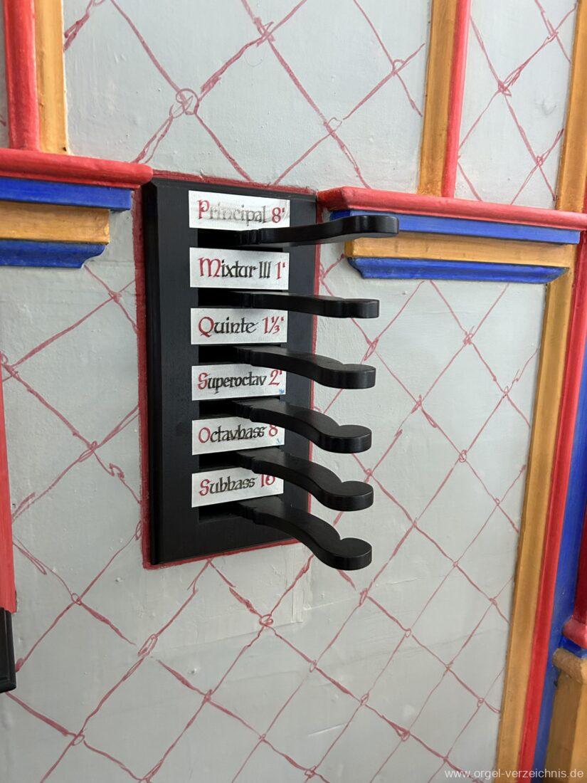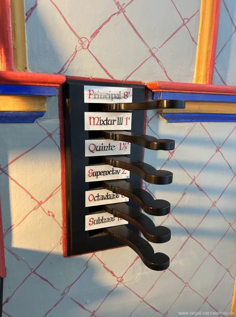 Rechte SeitePrincipal 8′ Mixtur III 1′ Quinte 1 1/3′ Superoctav 2′ Octavbass 8′ Subbass 16′