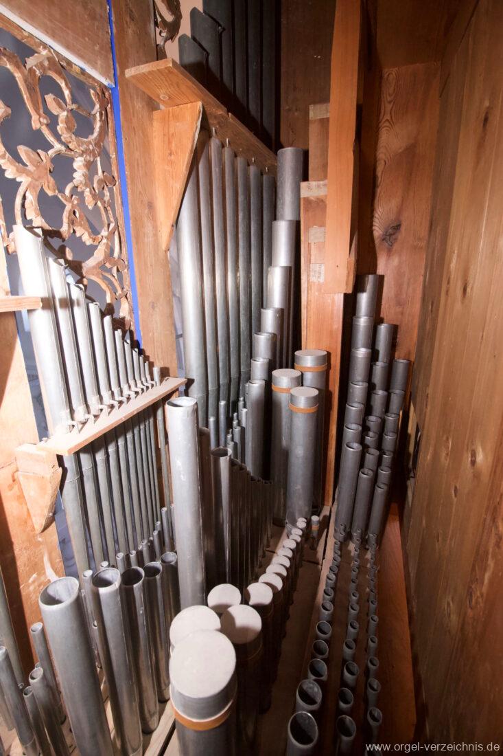 Pedal C, D, E, F, G, A – f° (urspr. bis c°)Subbass 16′ Holz ged. Octavbass 8′ Holz offen Mixturbass 5 1/3′ III; Metall sonst angehängt, Pedalpfeifenwerk hinter Gehäuse separiert aufgestellt