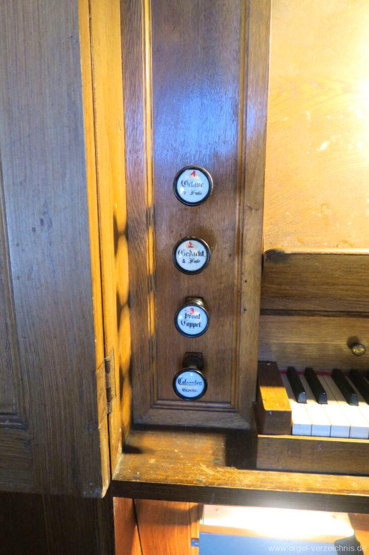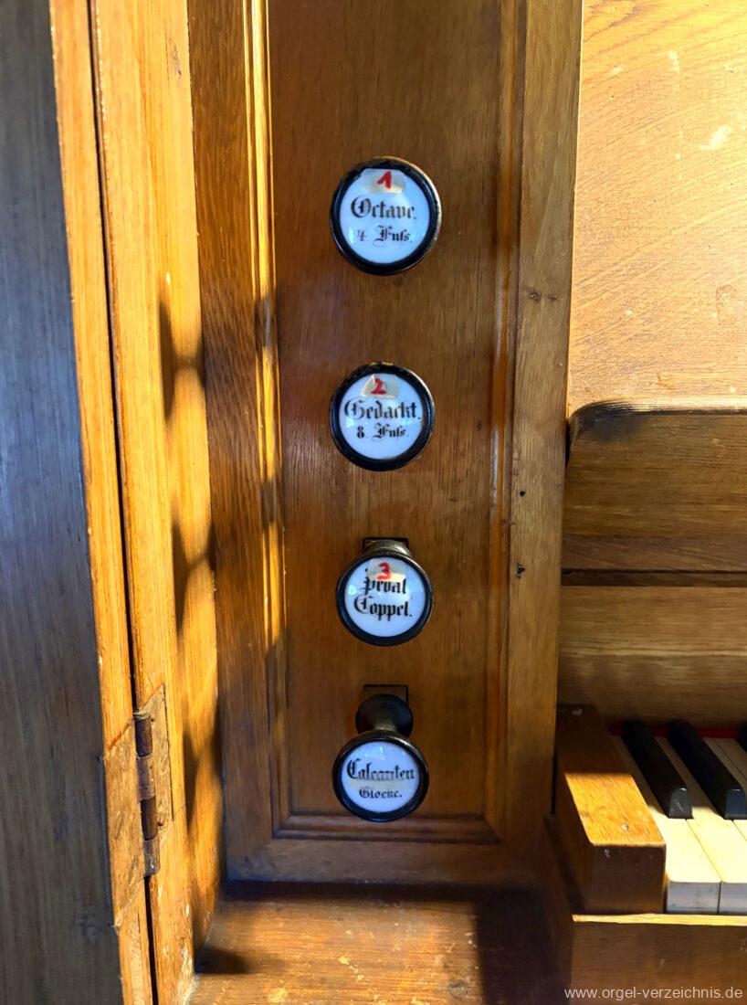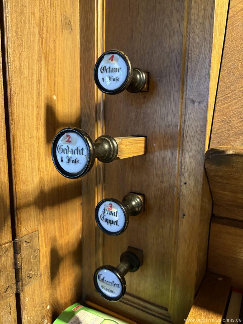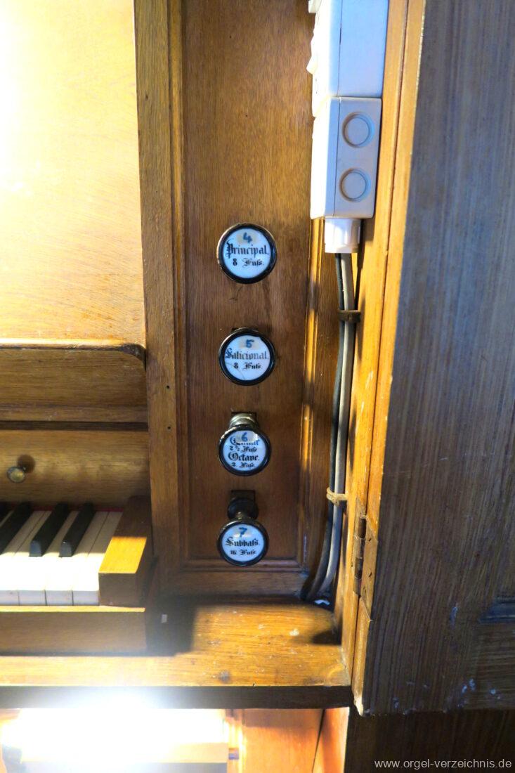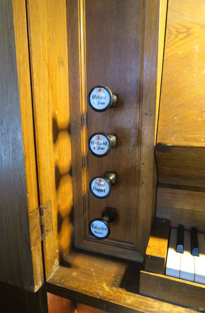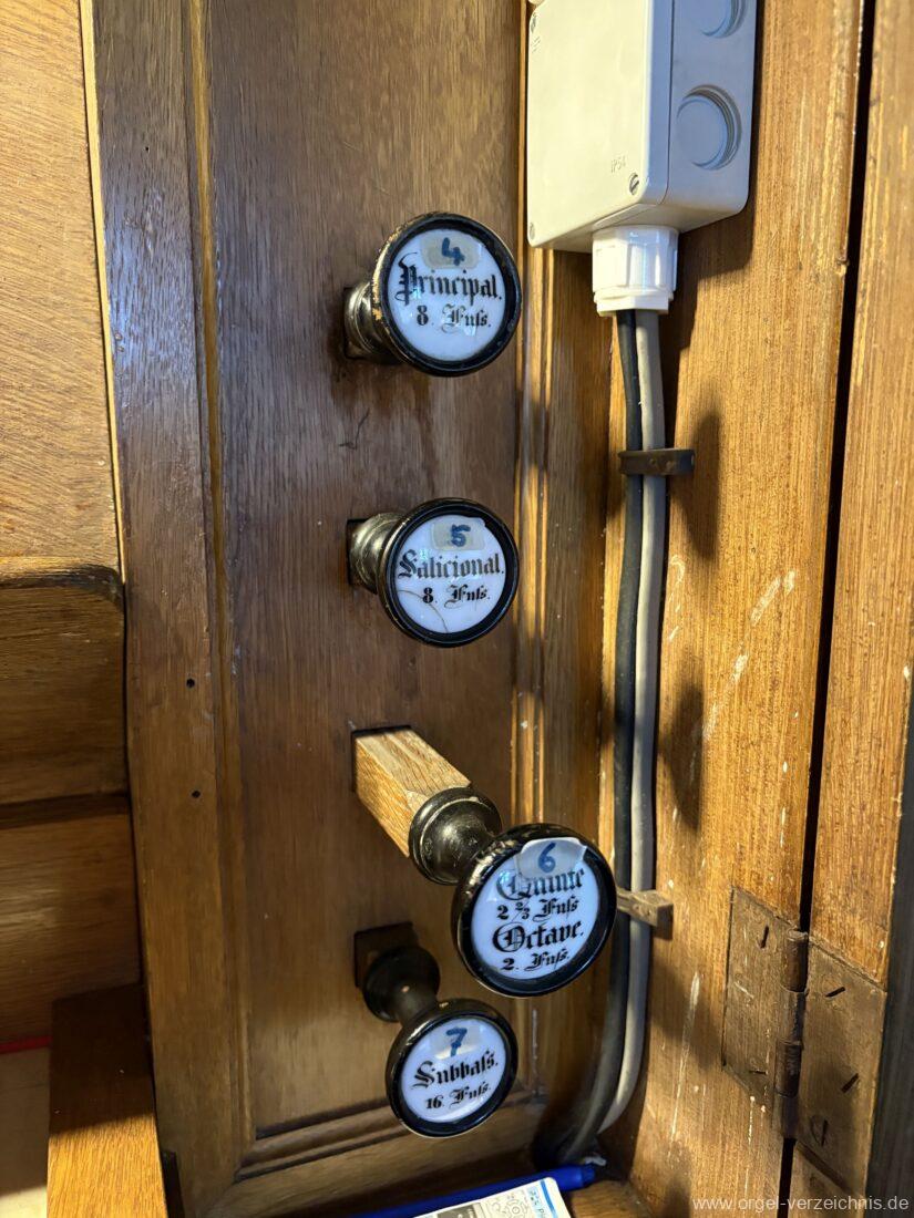 Manual C – f“‘Principal. 8 Fuss. C – ds° Holz offen, e° – ds‘ Prospekt – Anm. 1, ab e‘ innen Metall Gedackt. 8 Fuss. Holz ged., ab fs° Metall ged. Salicional. 8 Fuss. C – H Gedackt 8′, ab c° Holz offen innenlabiiert, ab fs° Metall Octave. 4 Fuss. C – e° Prospekt – Anm. 2, ab f° innen Quinte 2 2/3 Fuss / Octave. 2 Fuss. Metall (gemeinsamer Zug)