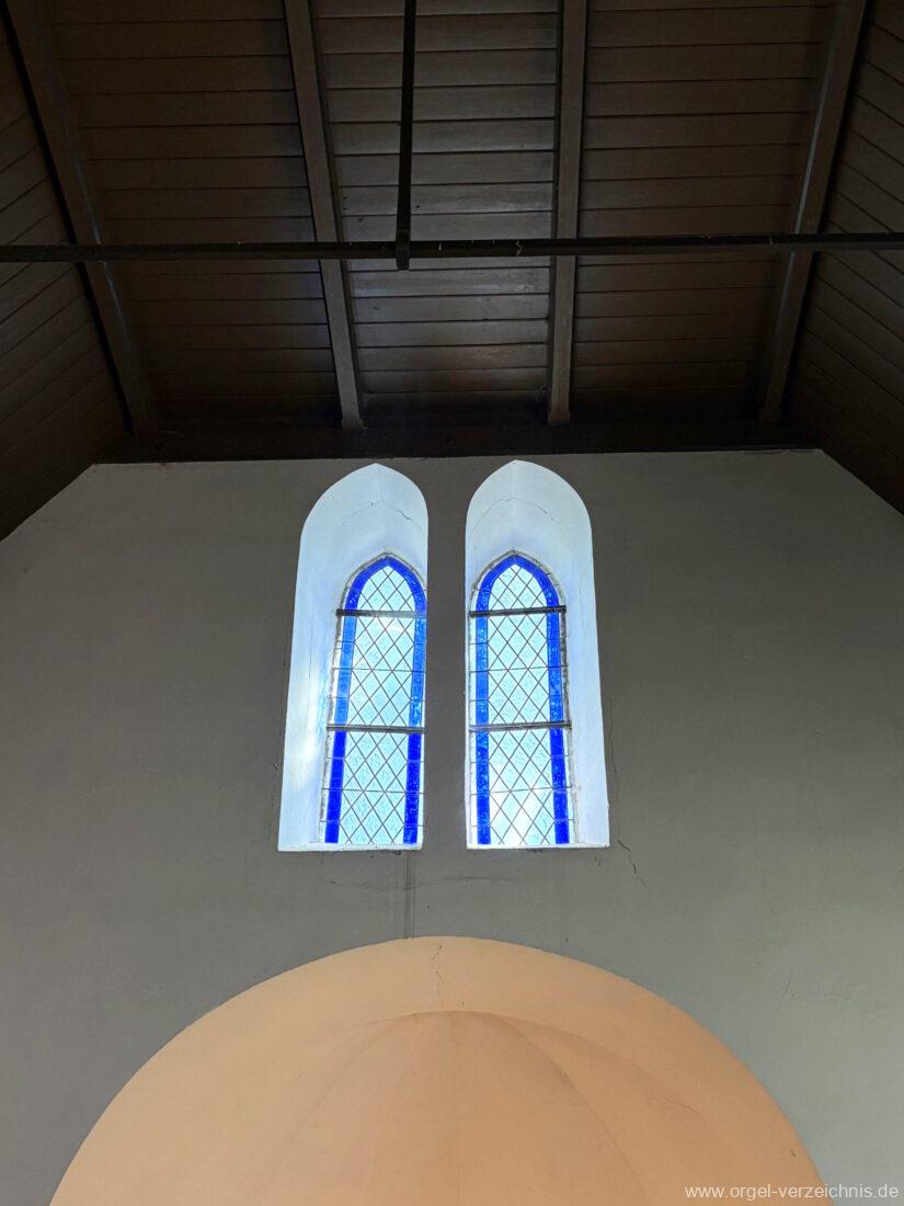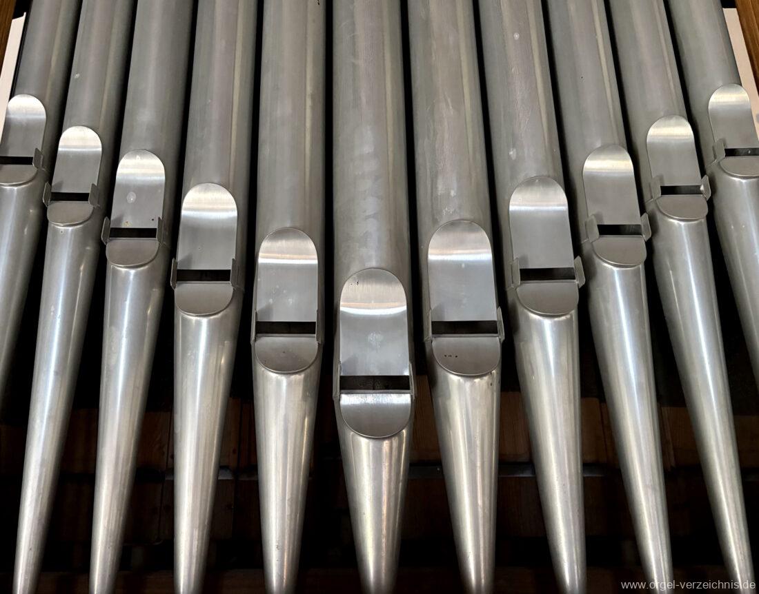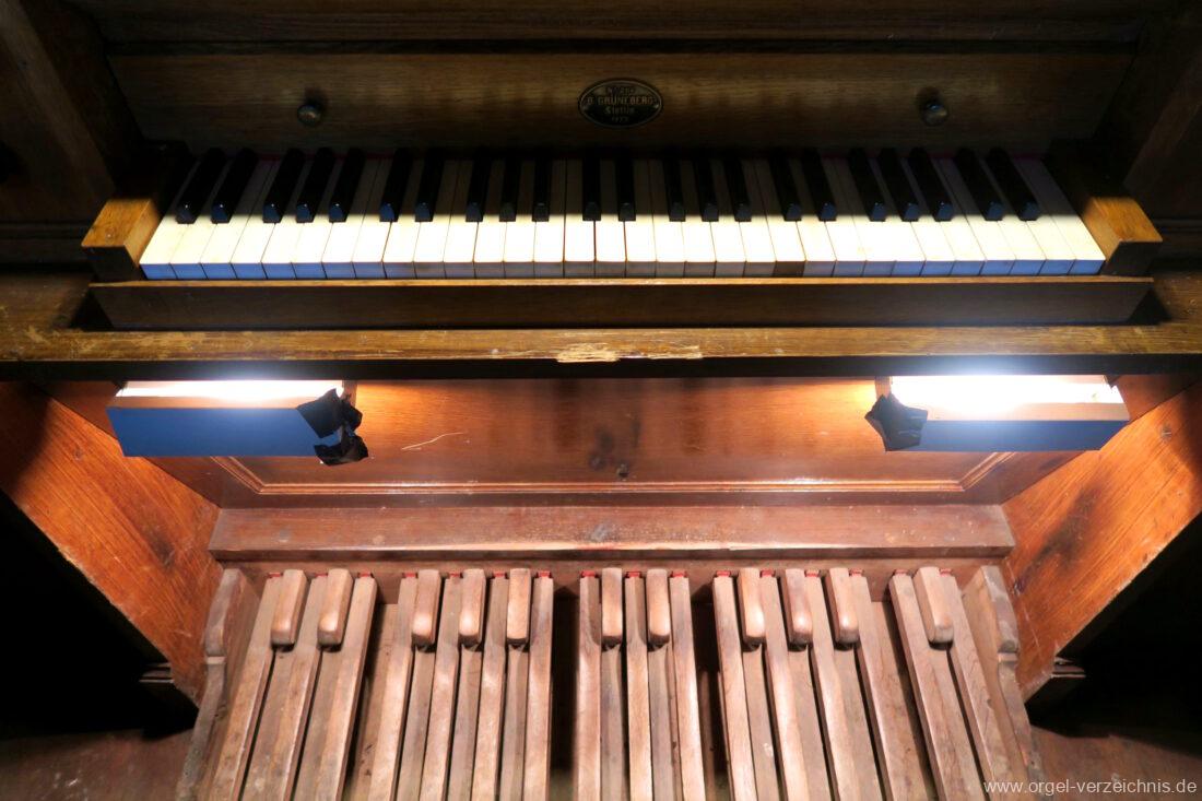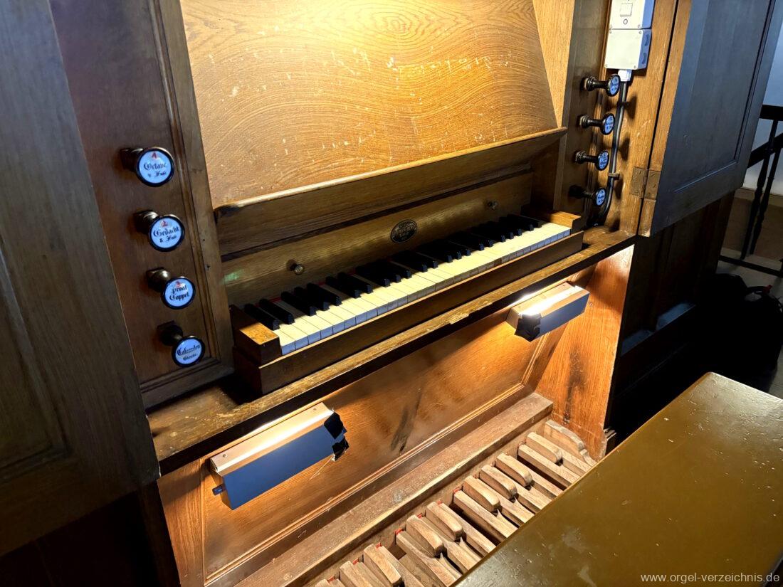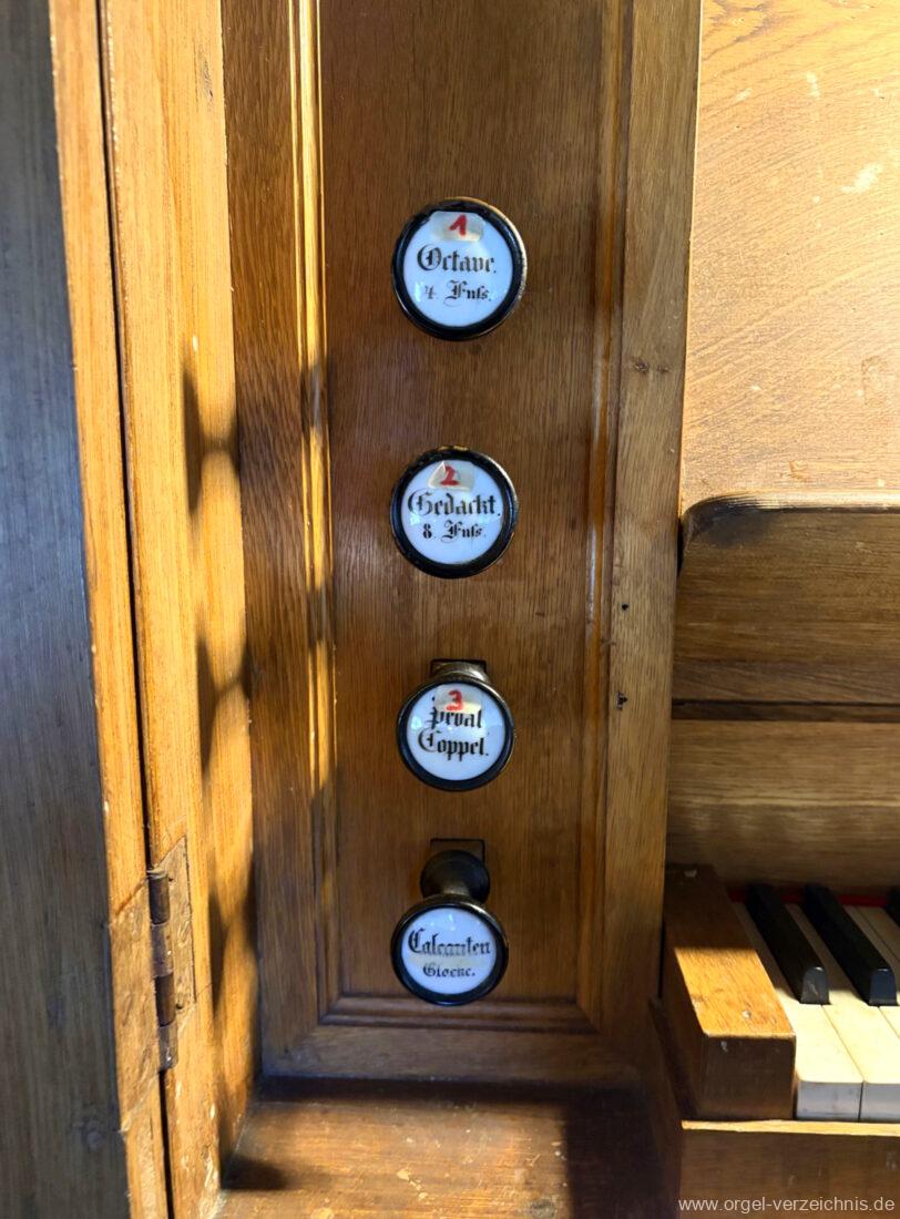 Manual C – f“‘Principal. 8 Fuss. C – ds° Holz offen, e° – ds‘ Prospekt – Anm. 1, ab e‘ innen Metall Gedackt. 8 Fuss. Holz ged., ab fs° Metall ged. Salicional. 8 Fuss. C – H Gedackt 8′, ab c° Holz offen innenlabiiert, ab fs° Metall Octave. 4 Fuss. C – e° Prospekt – Anm. 2, ab f° innen Quinte 2 2/3 Fuss / Octave. 2 Fuss. Metall (gemeinsamer Zug)