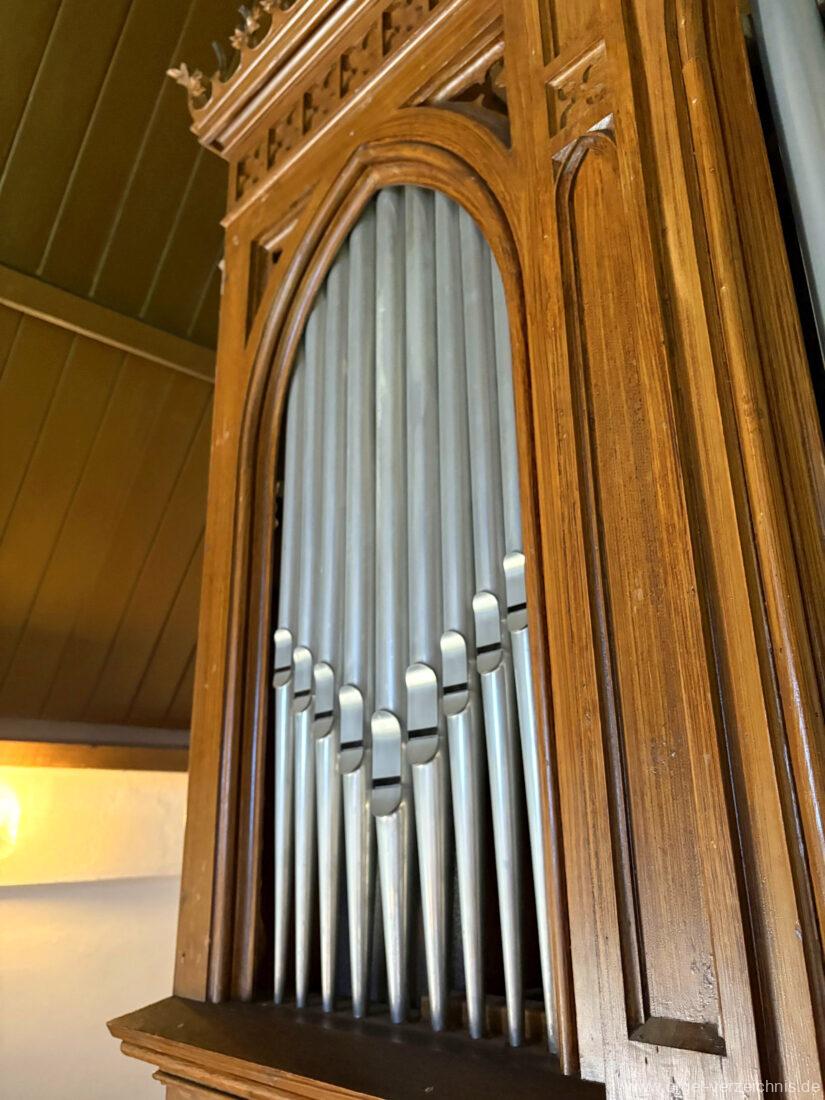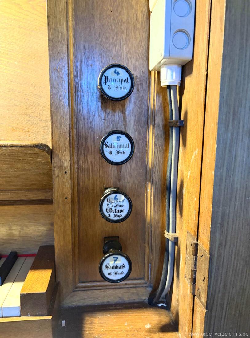 Rechte SeitePrincipal. 8 Fuss. Salicional. 8 Fuss. Quinte 2 2/3 Fuss / Octave. 2 Fuss. Subbass. 16′