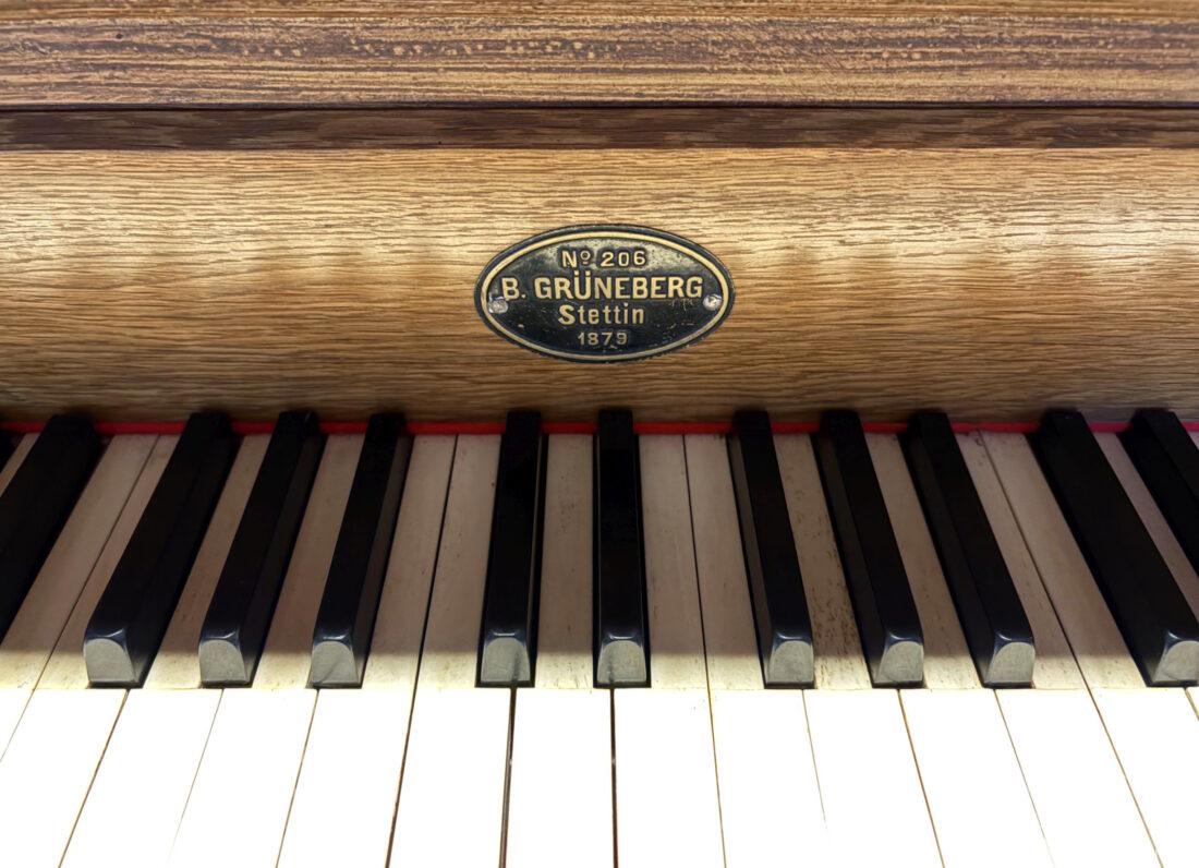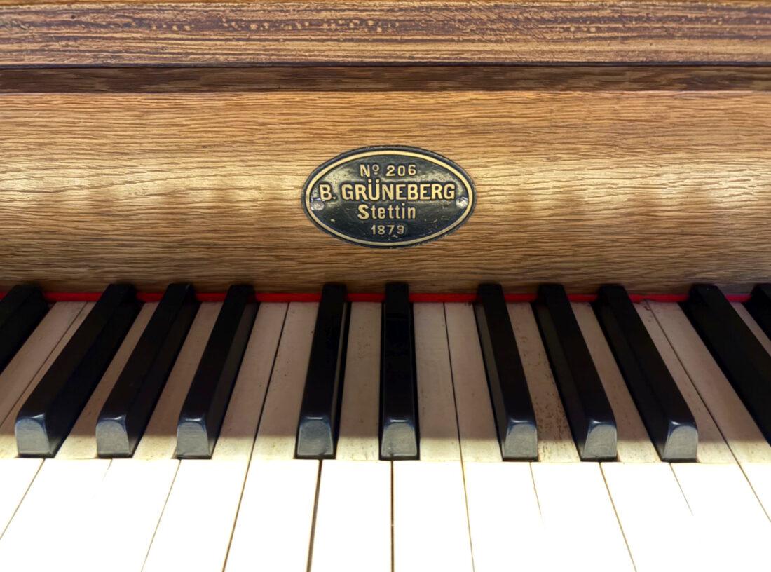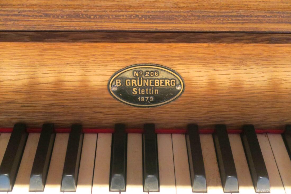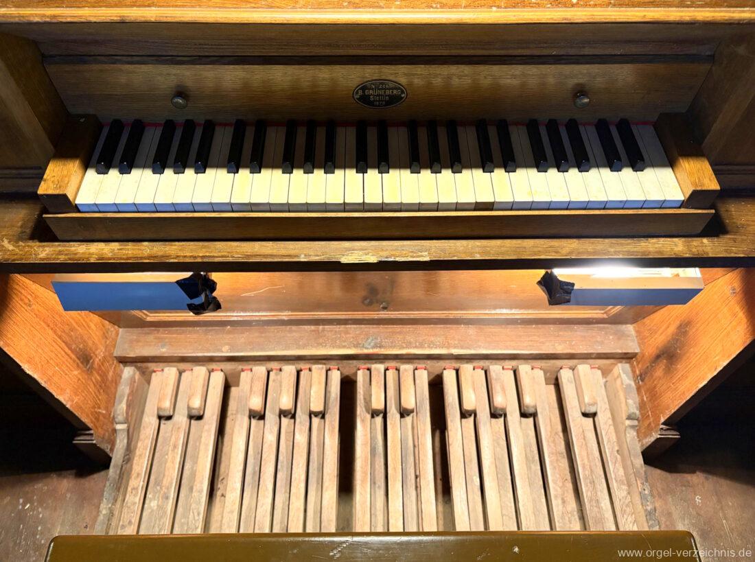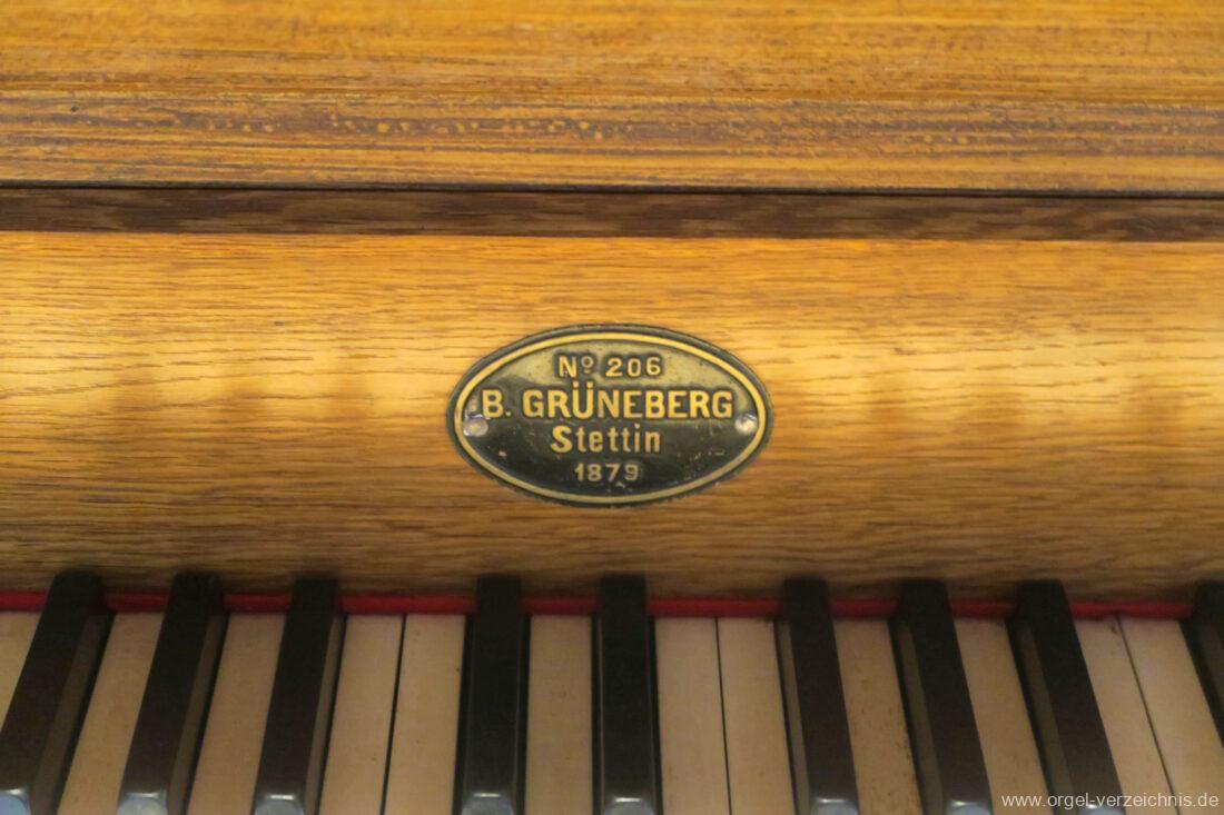 1879 mechanische Schleifladenorgel mit mittig fest eingebautem Spielschrank, erbaut als Opus 206 von Orgelbau Barnim Grüneberg (Stettin) I/6.