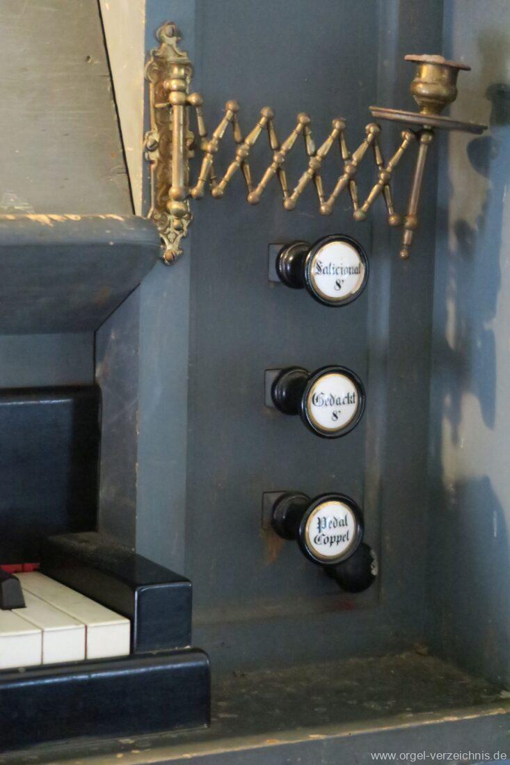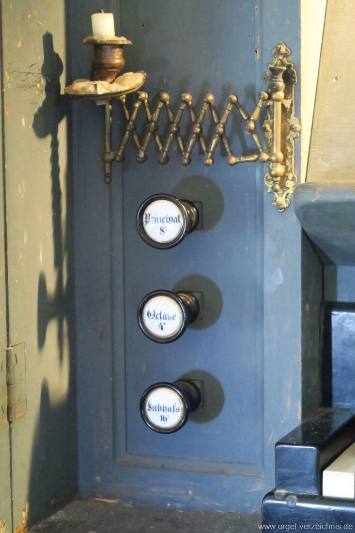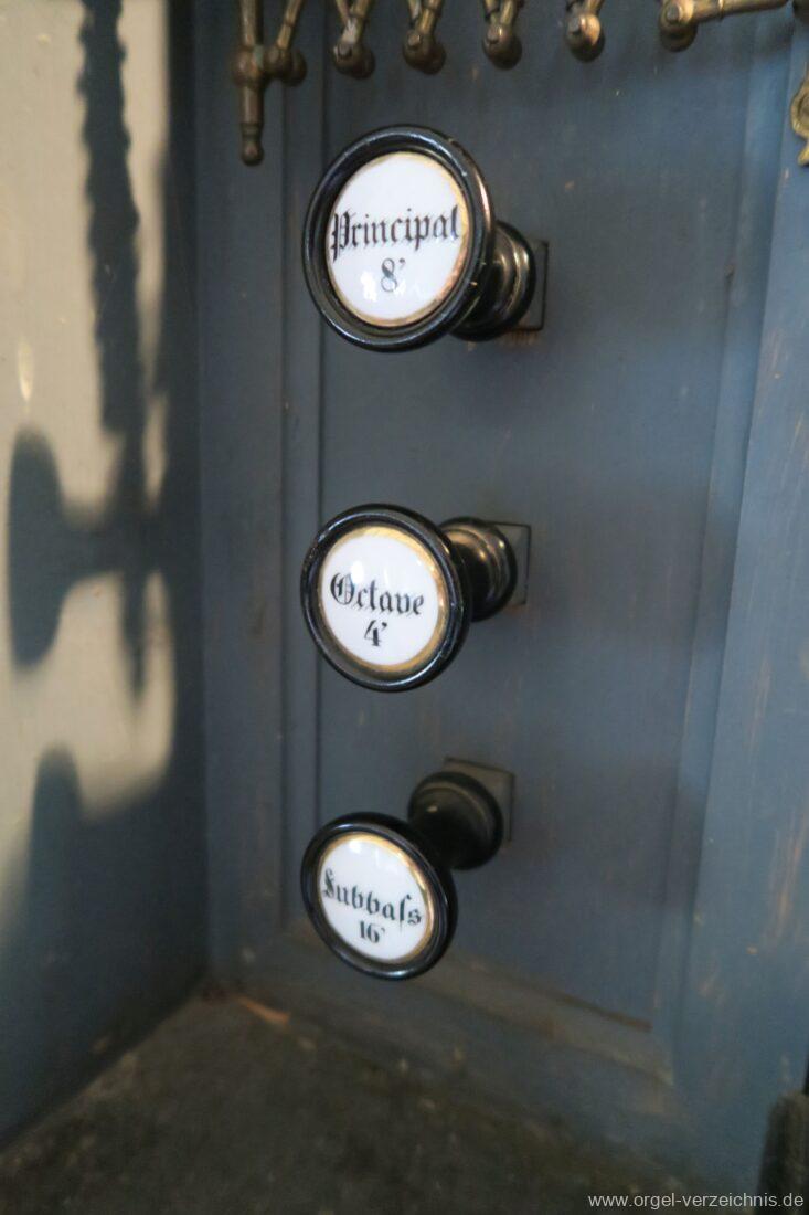Manual C – f“‘Principal 8′ C – H Holz offen, ab c° Prospekt, ab f“ innen – Anm. 1 Gedackt 8′ C – h° Holz ged., ab c‘ Metall ged., ab cs“‘ offen Salicional 8′ C – H Gedackt 8′, ab c° Metall Octave 4′ C – F Holz offen, FS – ds° Prospekt, ab e° innen – Anm. 2