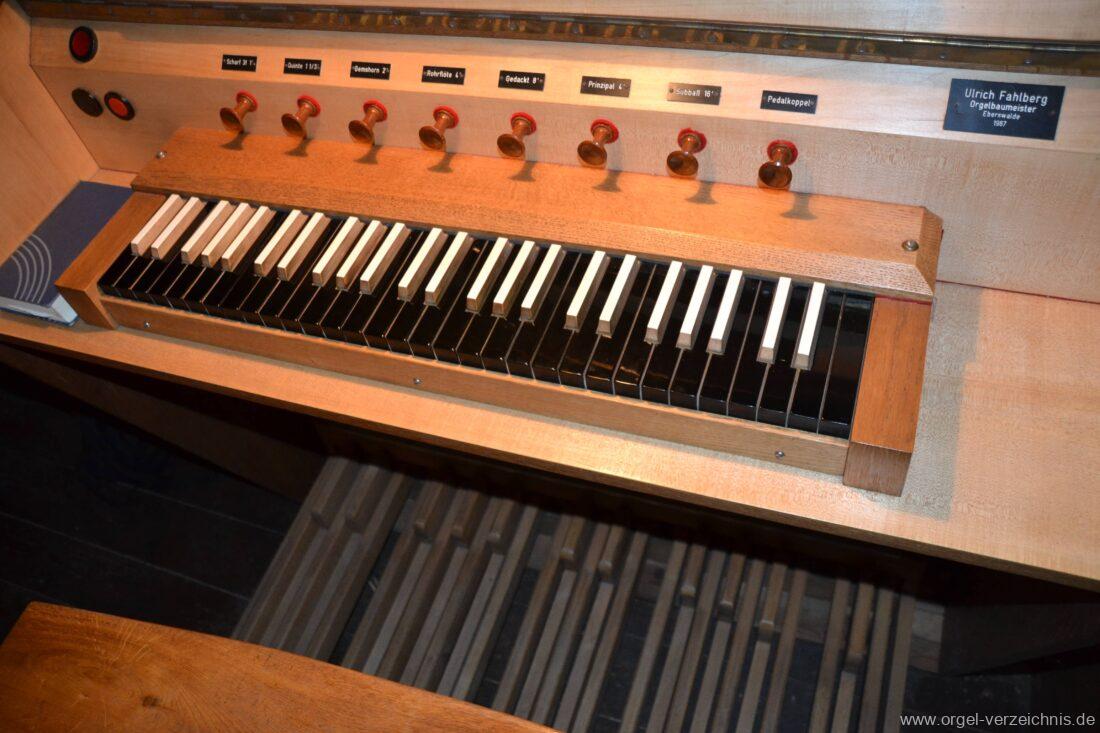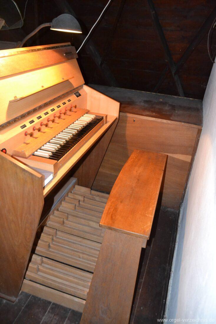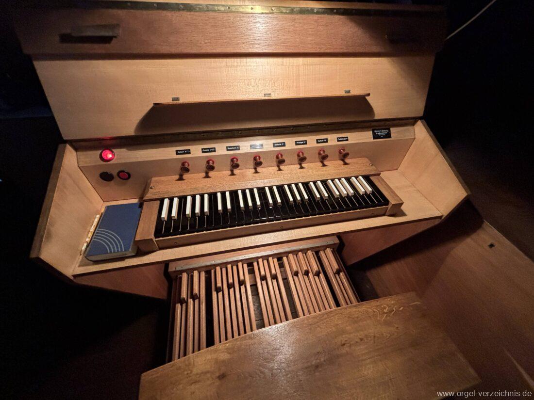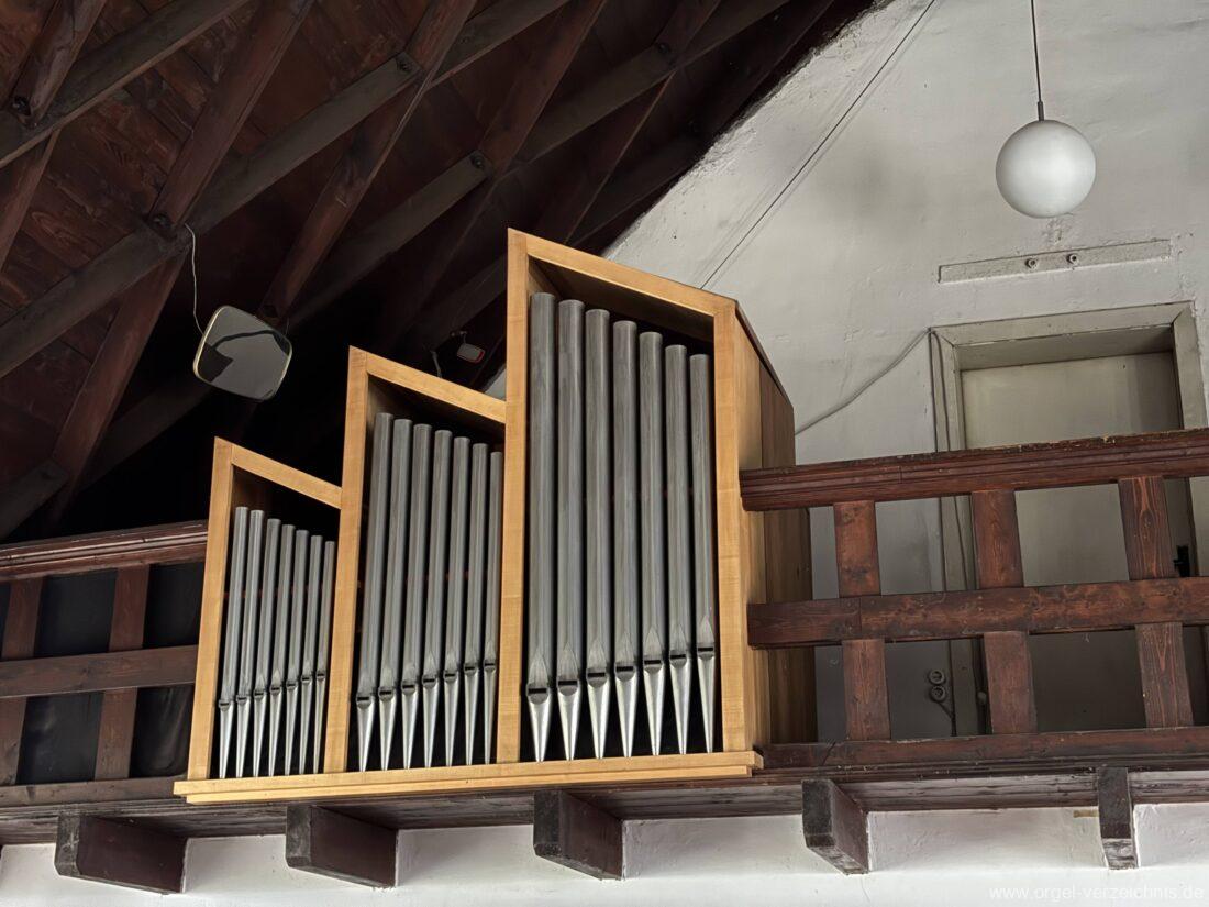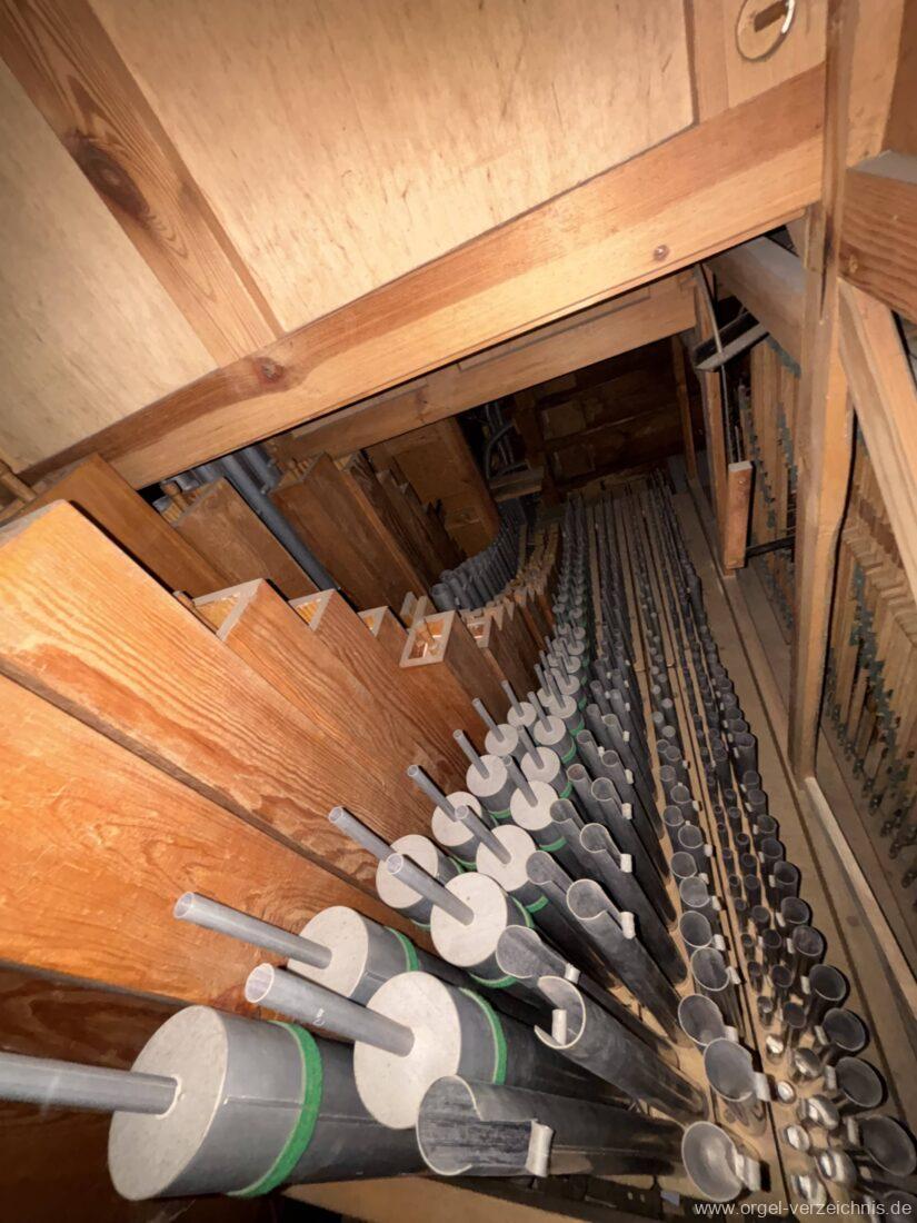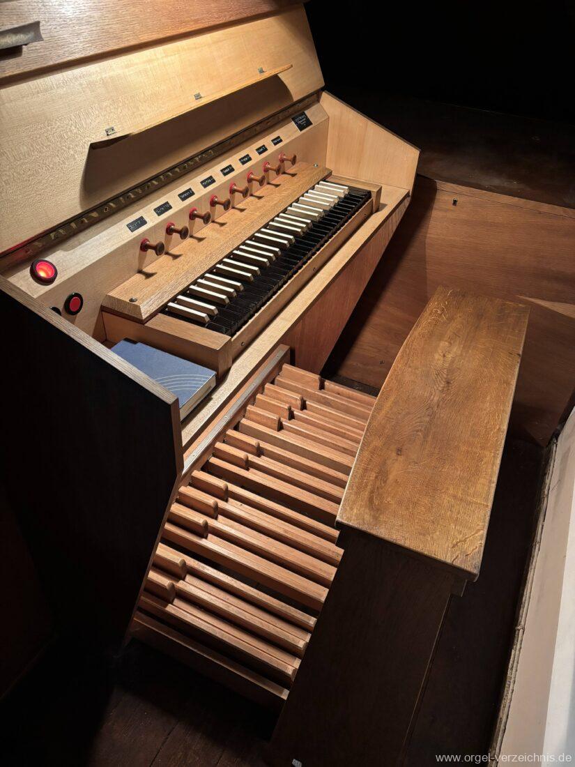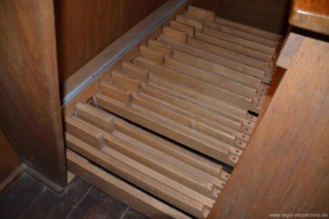 Manual C – f“‘Gedackt 8′ (durchgehend Holz gedeckt) Prinzipal 4′ (C – g#° Prospekt Zinn, Forts. Metall offen, innen) Rohrflöte 4′ (C – f“ Rohrflöte Metall, ab f#“ Metall konisch) Gemshorn 2′ (Metall offen, konisch) Quinte 1 1/3′ (Metall offen, Prinzipalmensur) Scharf 3f. 1′ (Metall offen, rep. c°, c‘, c“, c“‘) |