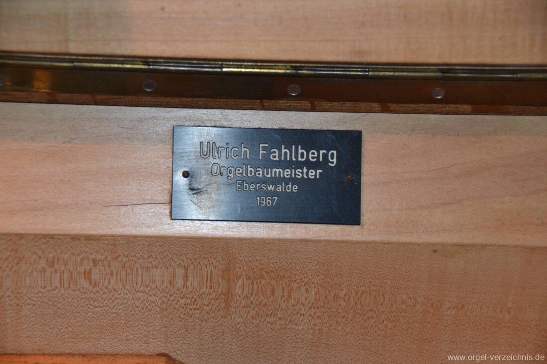 1967 Neubau durch den aus Merseburg stammenden Orgelbaumeister Ulrich Fahlberg (Eberswalde) als drittes Instrument seiner nun eigenen Werkstatt in Eberswalde. Es entstand eine mechanische, hinterspielige Brüstungsorgel I/7. Das Pedalregister wurde aufgrund der geringen Raumhöhe auf der kleinen Empore rechts neben dem Spieltisch liegend gebaut. Der Vater des Orgelbauers finanzierte den Neubau erheblich mit.