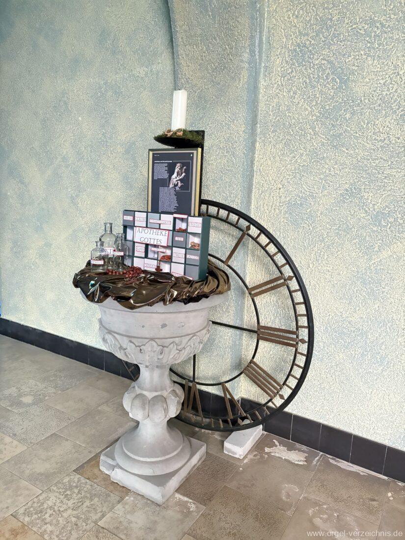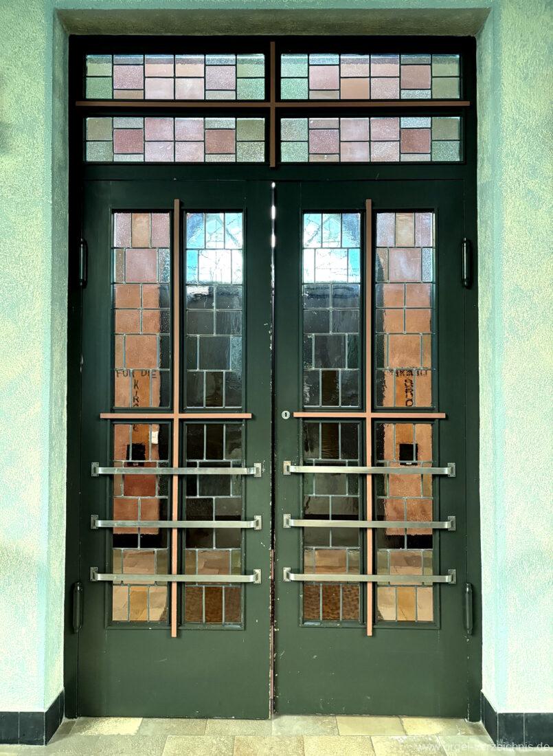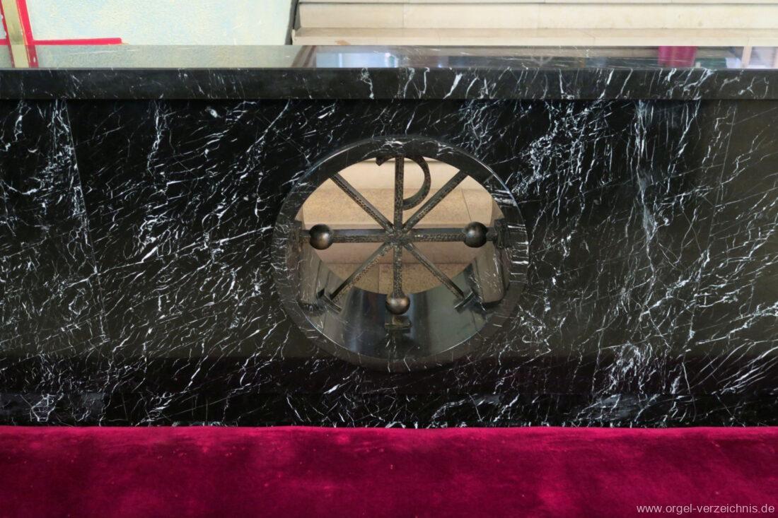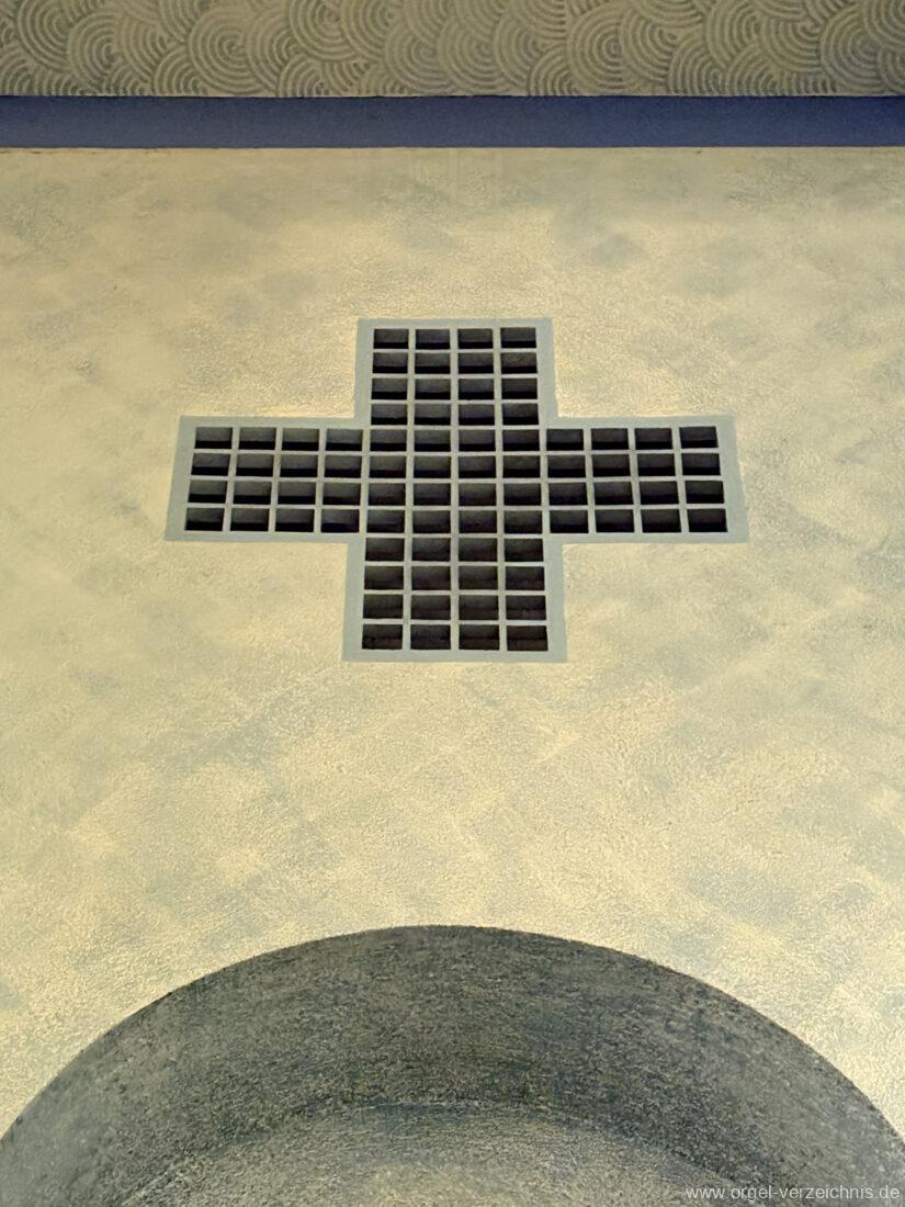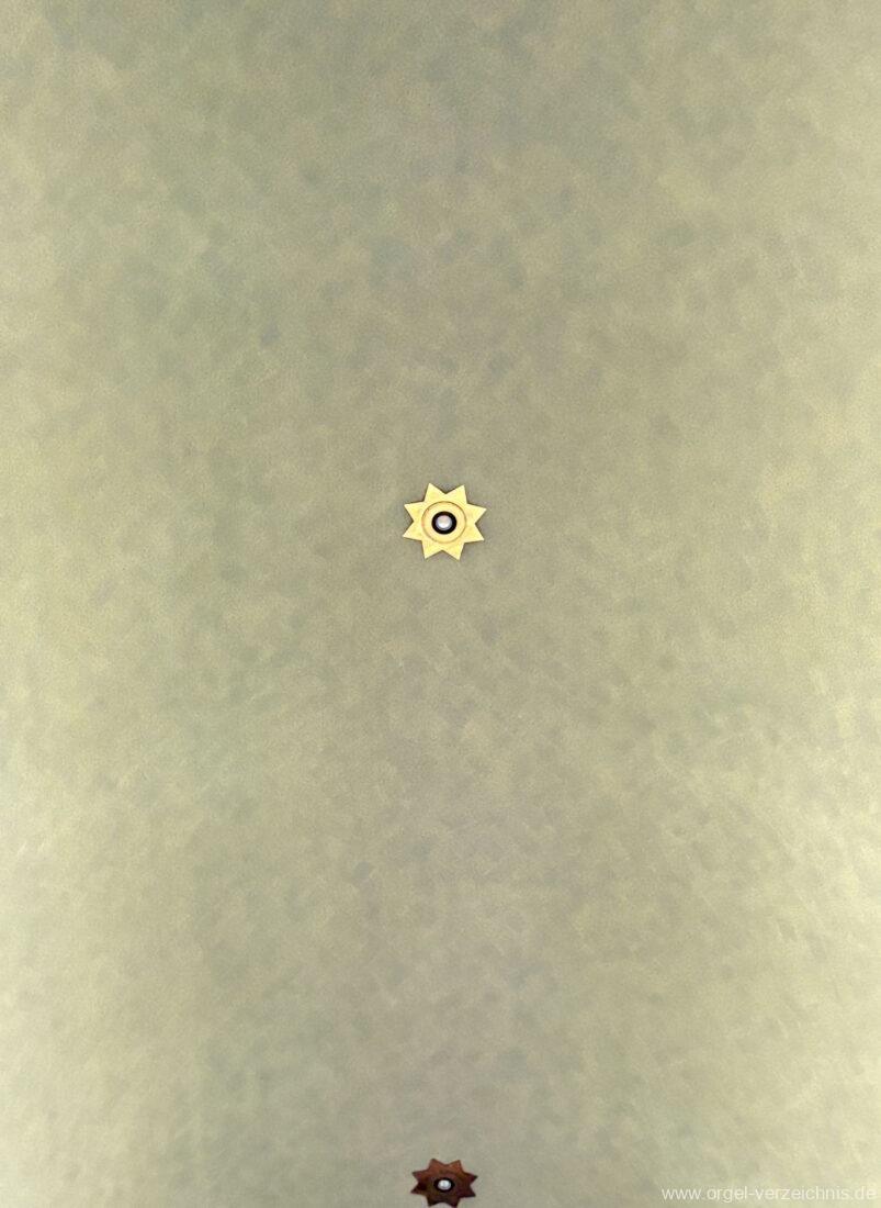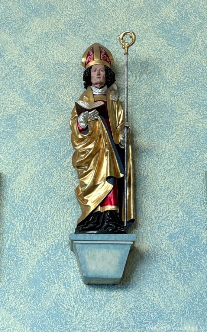 Pedal C – f‘Principal 16′ Holz offen; H – f° Metall offen, Prospekt – Anm. 3; ab fs° innen Subbass 16′ Holz ged. Octave 8′ Naturguss, offen; C – G Prospekt – Anm. 4 Gedacktbass 8′ Holz ged. Choralbass 4′ Metall Fagott 16′ Stiefel/Becher Naturguss Zinke 8′ Stiefel/Becher Naturguss
