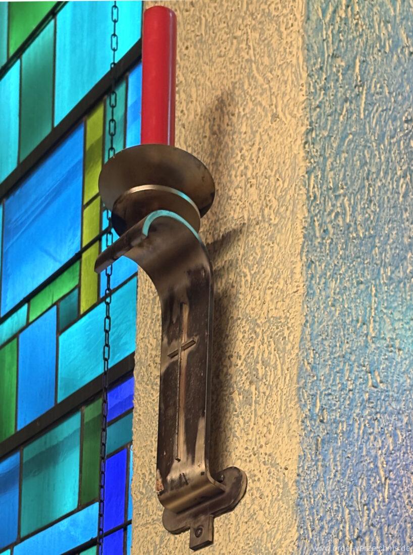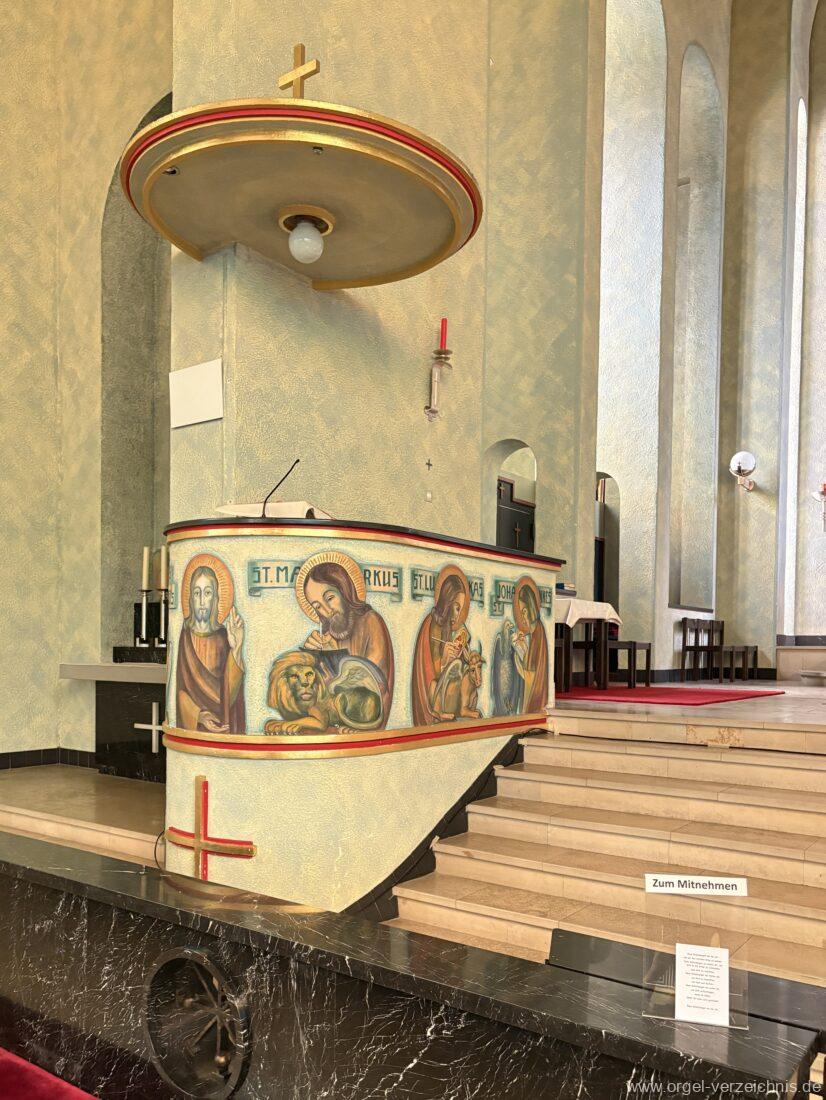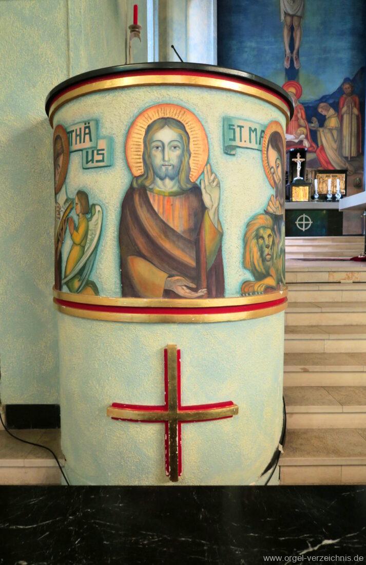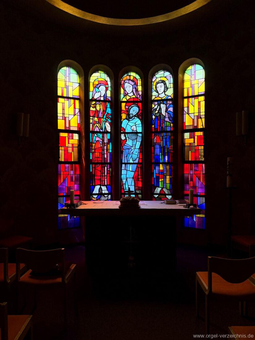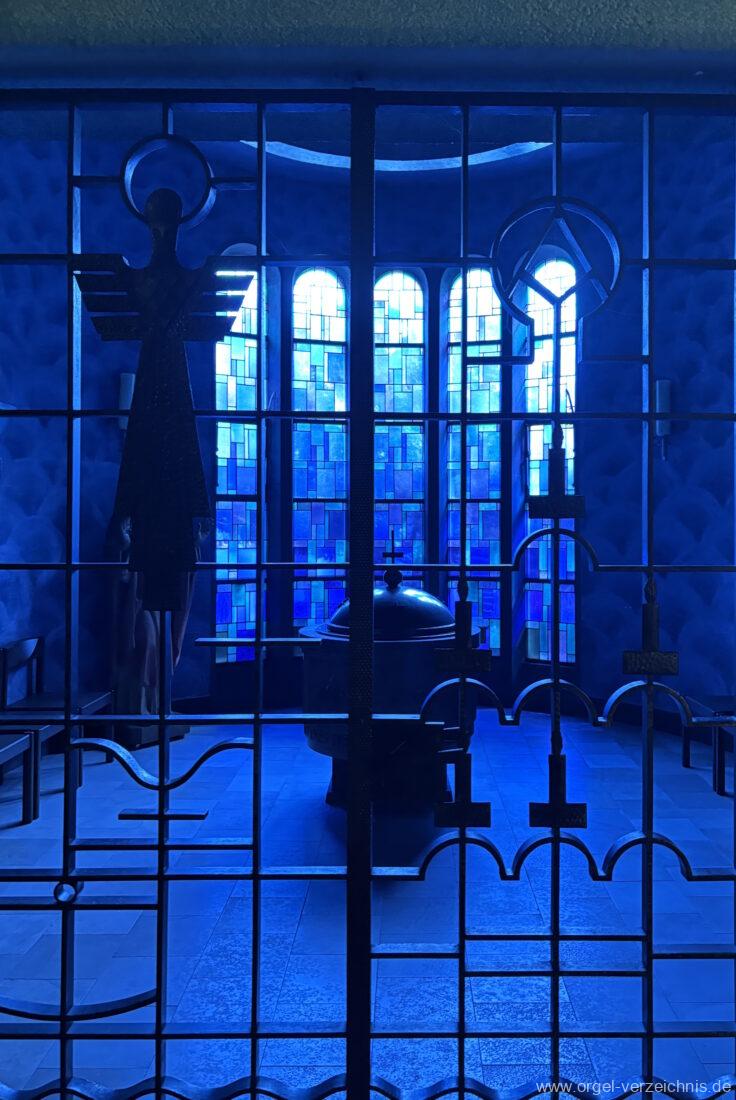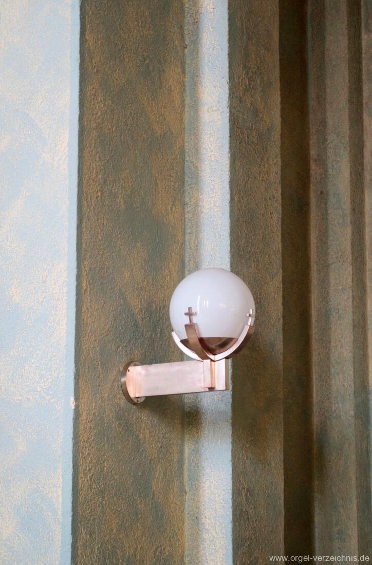 Pedal C – f‘Principal 16′ Holz offen; H – f° Metall offen, Prospekt – Anm. 3; ab fs° innen Subbass 16′ Holz ged. Octave 8′ Naturguss, offen; C – G Prospekt – Anm. 4 Gedacktbass 8′ Holz ged. Choralbass 4′ Metall Fagott 16′ Stiefel/Becher Naturguss Zinke 8′ Stiefel/Becher Naturguss