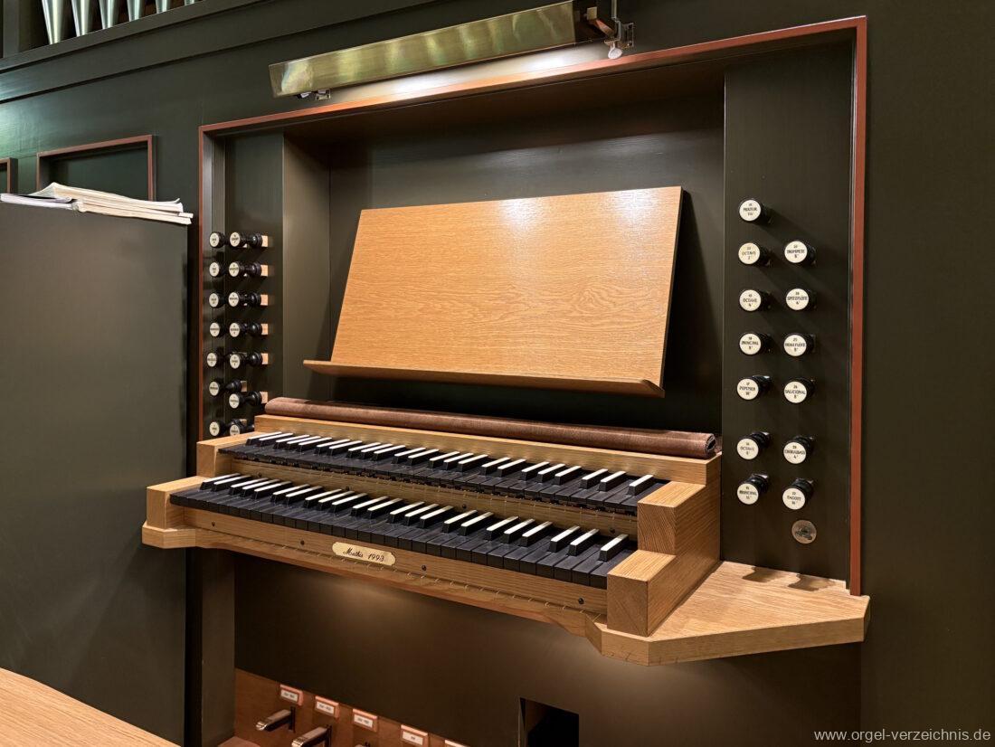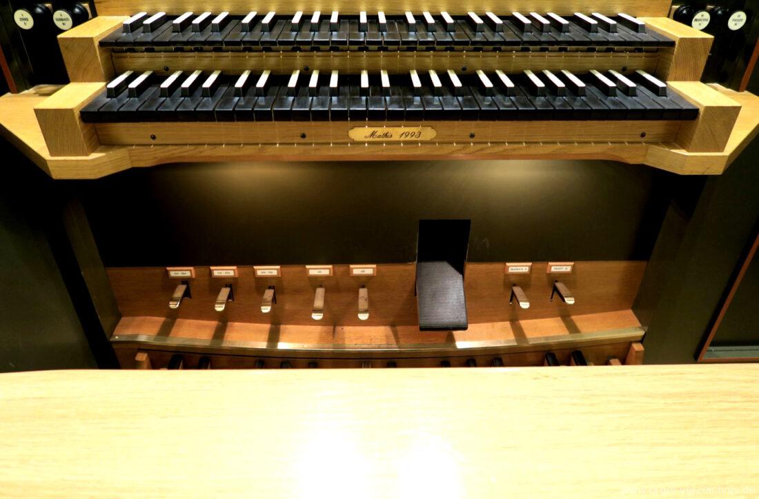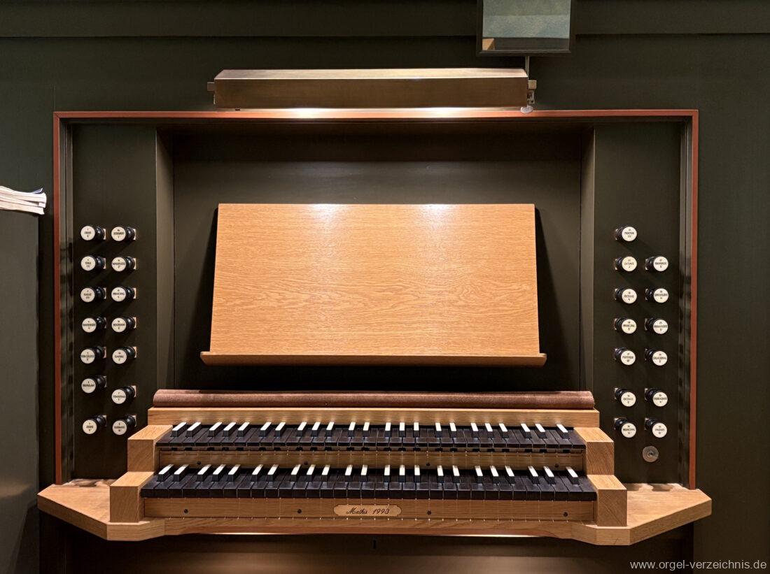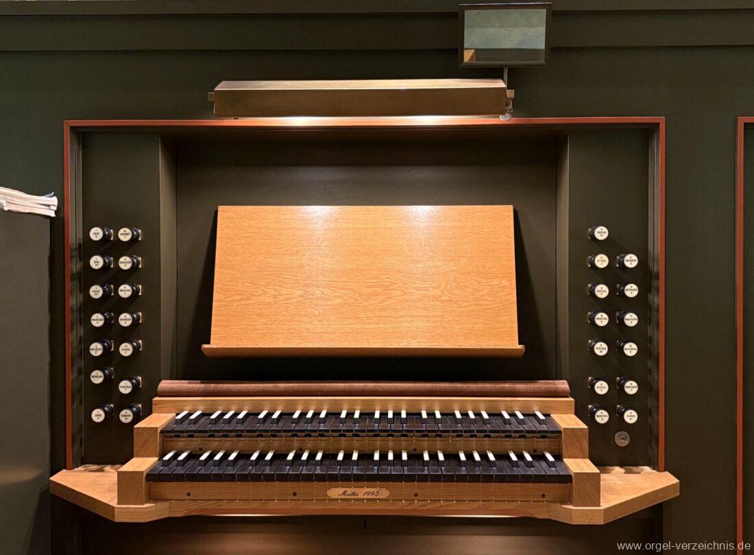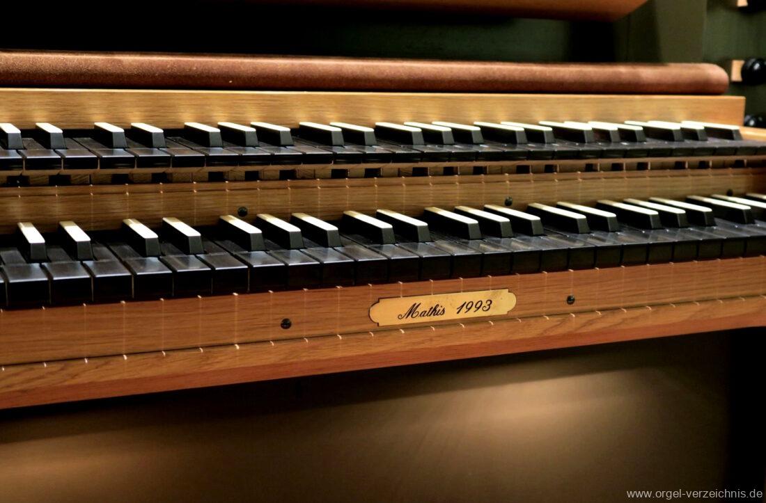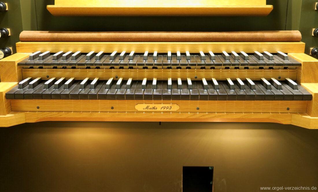 1993 mechanische Schleifladenorgel mit mittig fest eingebautem Spieltisch, erbaut in von Orgelbau Mathis (Näfels) II/26 – Einweihung 24. April 1994. Die labialen 16′ Register wurden zum Teil von der 1935 erbauten Vorgängerorgel wiederverwendet. Die Zink 8′ wurde zu späterer Zeit eingebaut. Das Werk weist 1’561 Pfeifen auf, wovon 138 aus Holz sind.