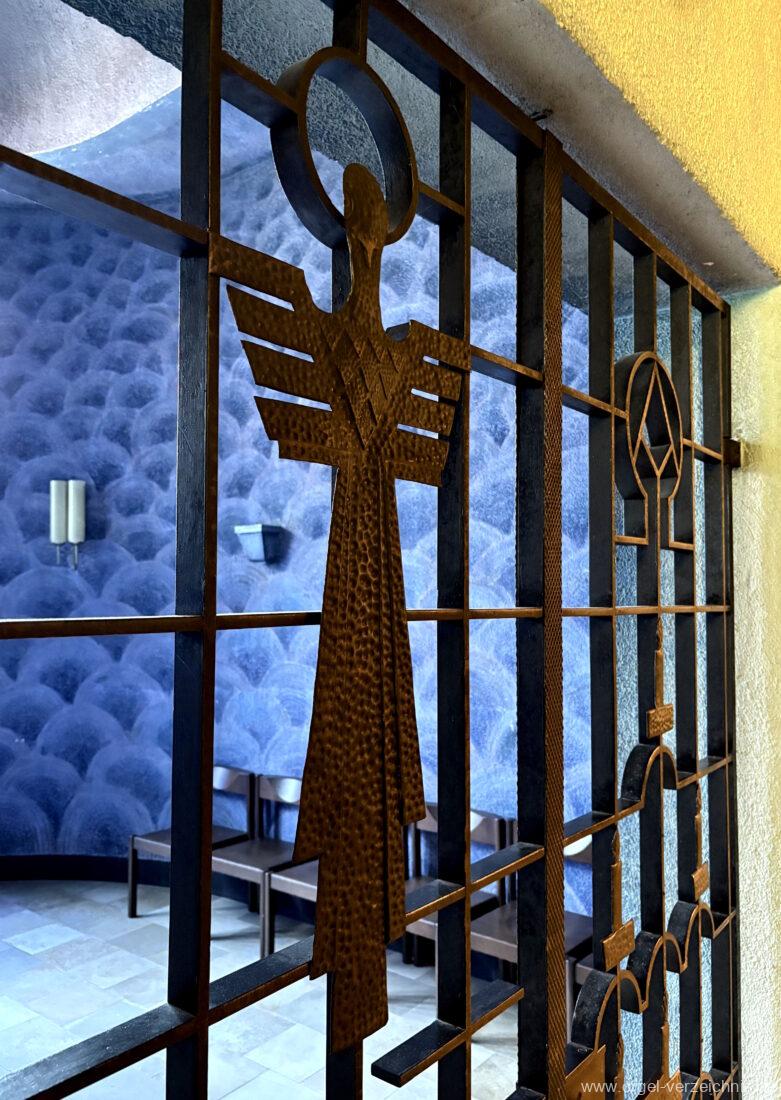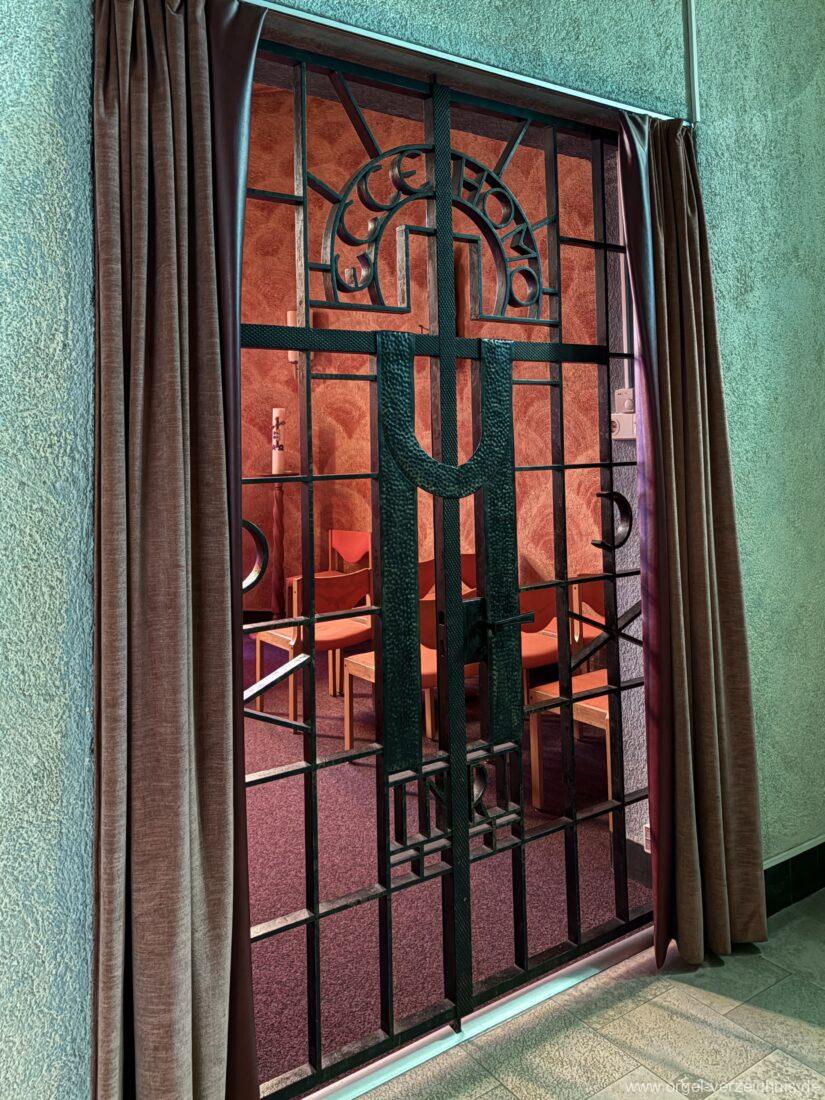 II Schwellwerk C – g“‘Bourdon 8′ C – H Holz ged.; ab c° Metall ged. Gambe 8′ Metall, ab F; C – E Bourdon Voix céleste 8′ ab c°; Metall Principal 4′ Metall Traversflöte 4′ Metall; ab c‘ überblasend Nasat 2 2/3′ Metall Waldflöte 2′ Metall Terz 1 3/5′ Metall Scharff 1′ III-IV – rep. c°/c’/c“/c“‘; ab c° IV Oboe 8′ Stiefel/Becher Metall; C – h° Fagott Tremulant