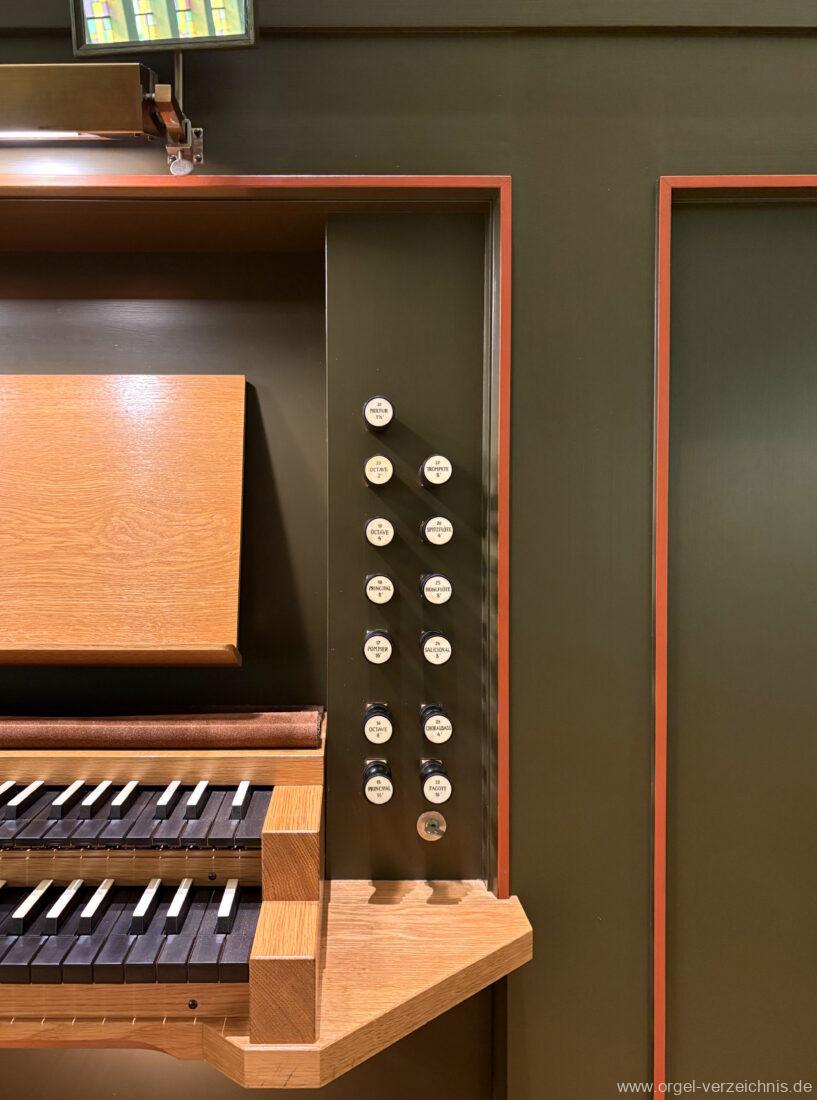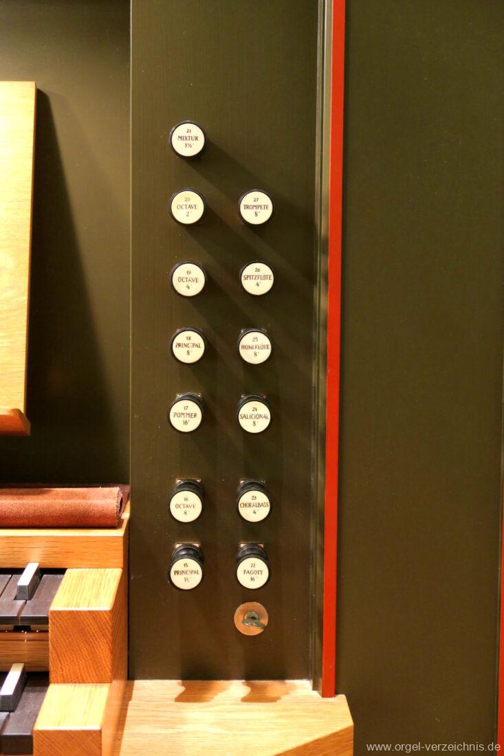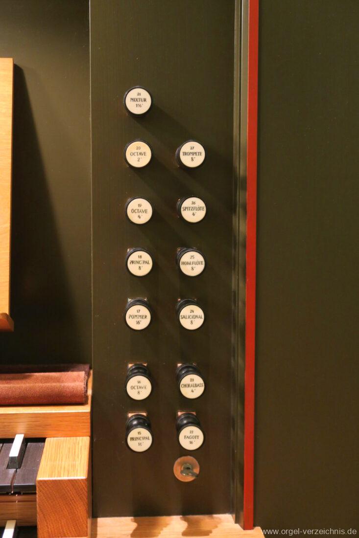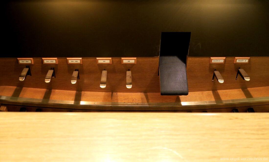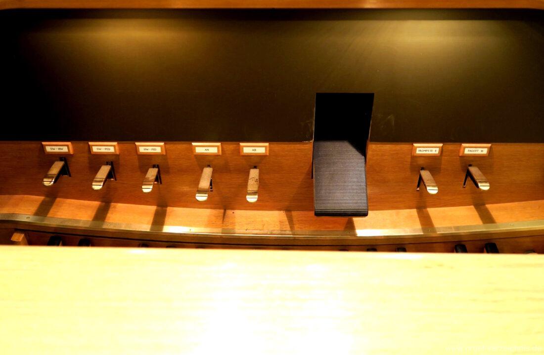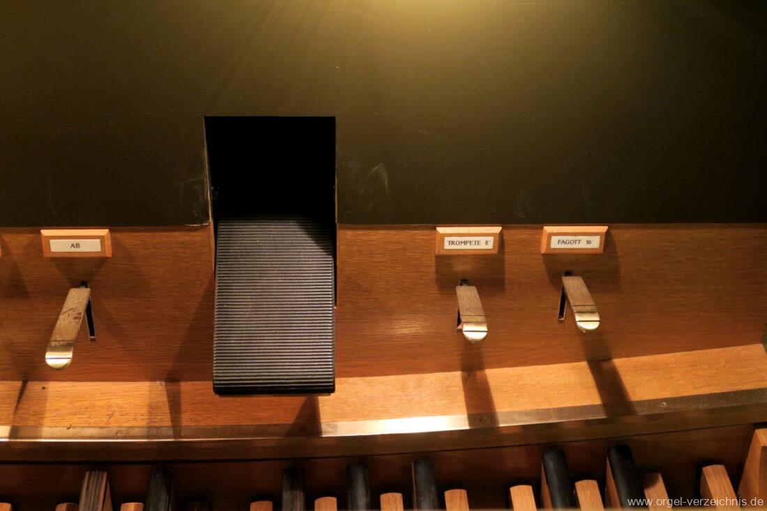 Fuß: SW – HW, SW – PED, HW – PED als Rastentritte auf der Linkenseite, Choralpleno AN / AB als Hebeltritte, Schwelltritt II, Einführungstritte Trompete 8′, Fagott 16′ als Hebeltritte (wechselwirkend zu Registerzügen)