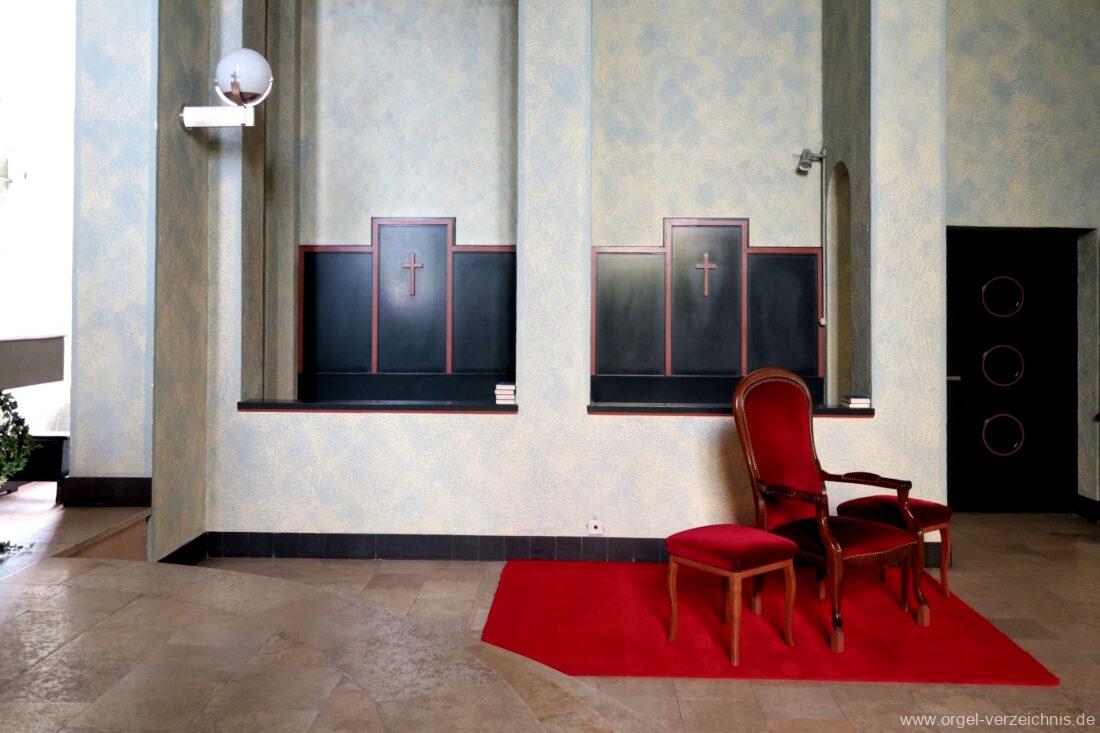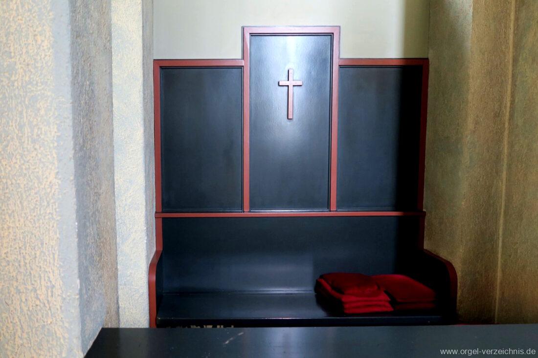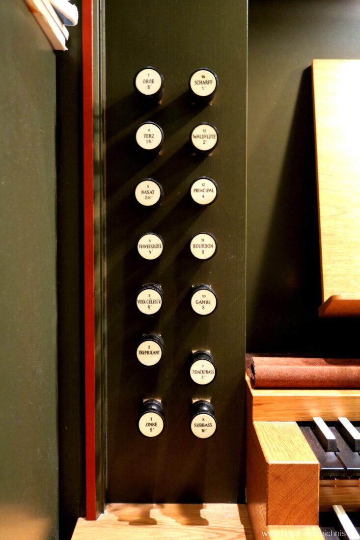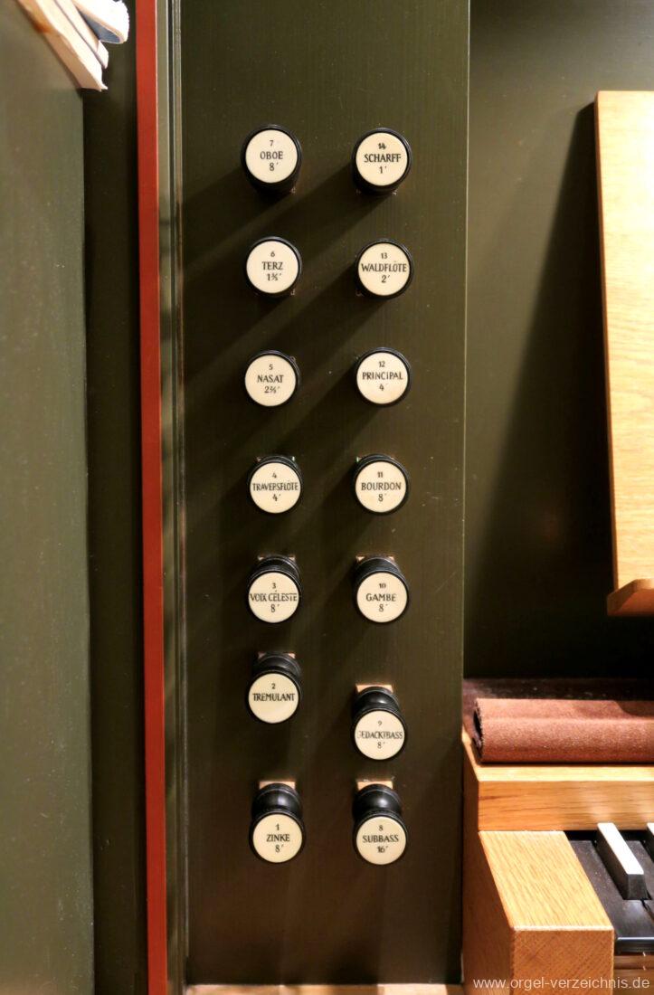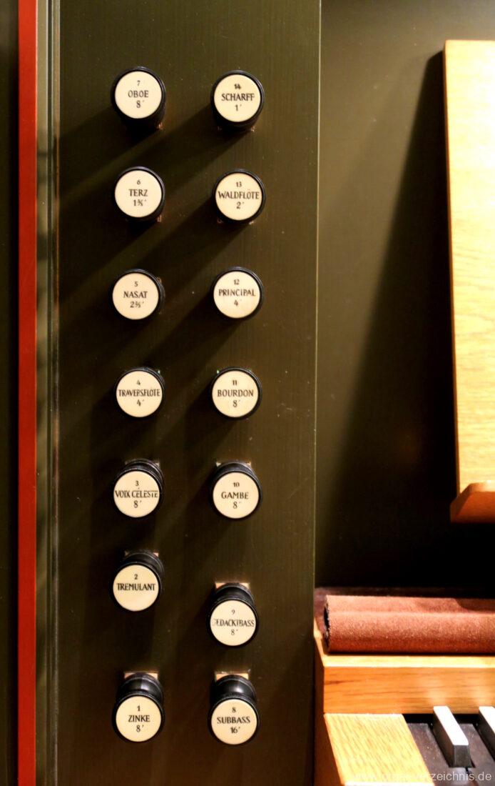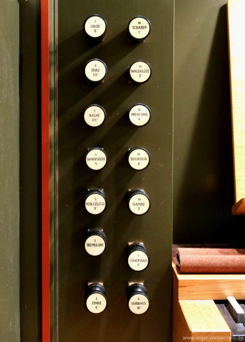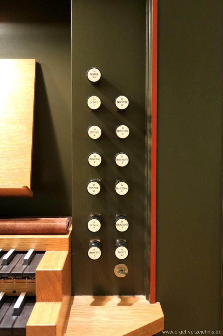 Fuß: SW – HW, SW – PED, HW – PED als Rastentritte auf der Linkenseite, Choralpleno AN / AB als Hebeltritte, Schwelltritt II, Einführungstritte Trompete 8′, Fagott 16′ als Hebeltritte (wechselwirkend zu Registerzügen)