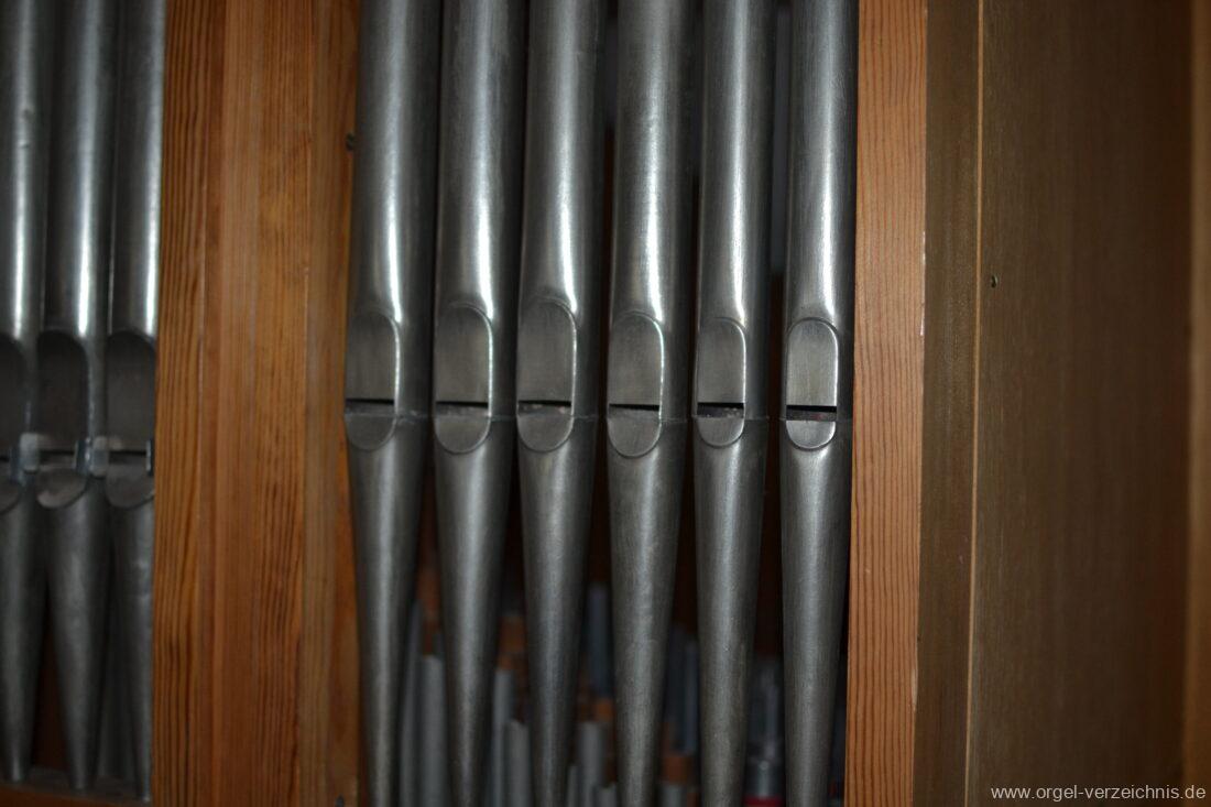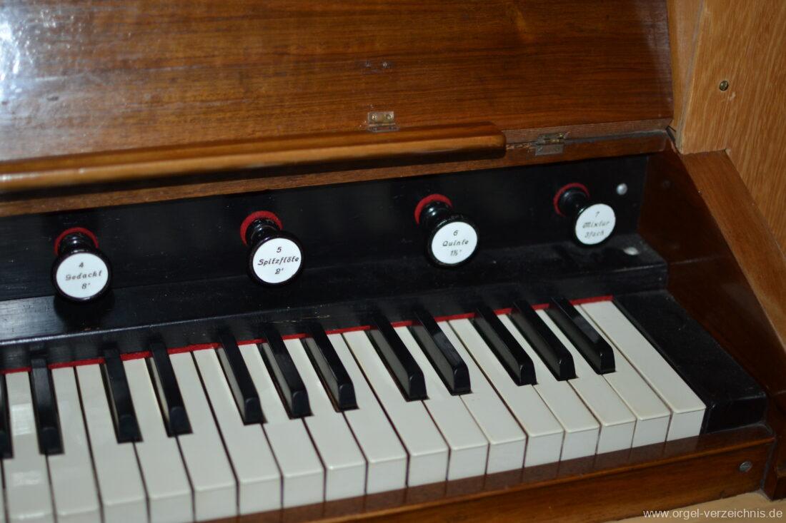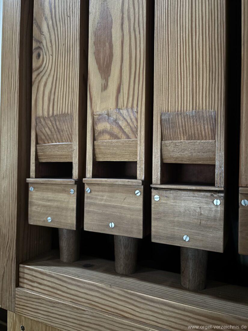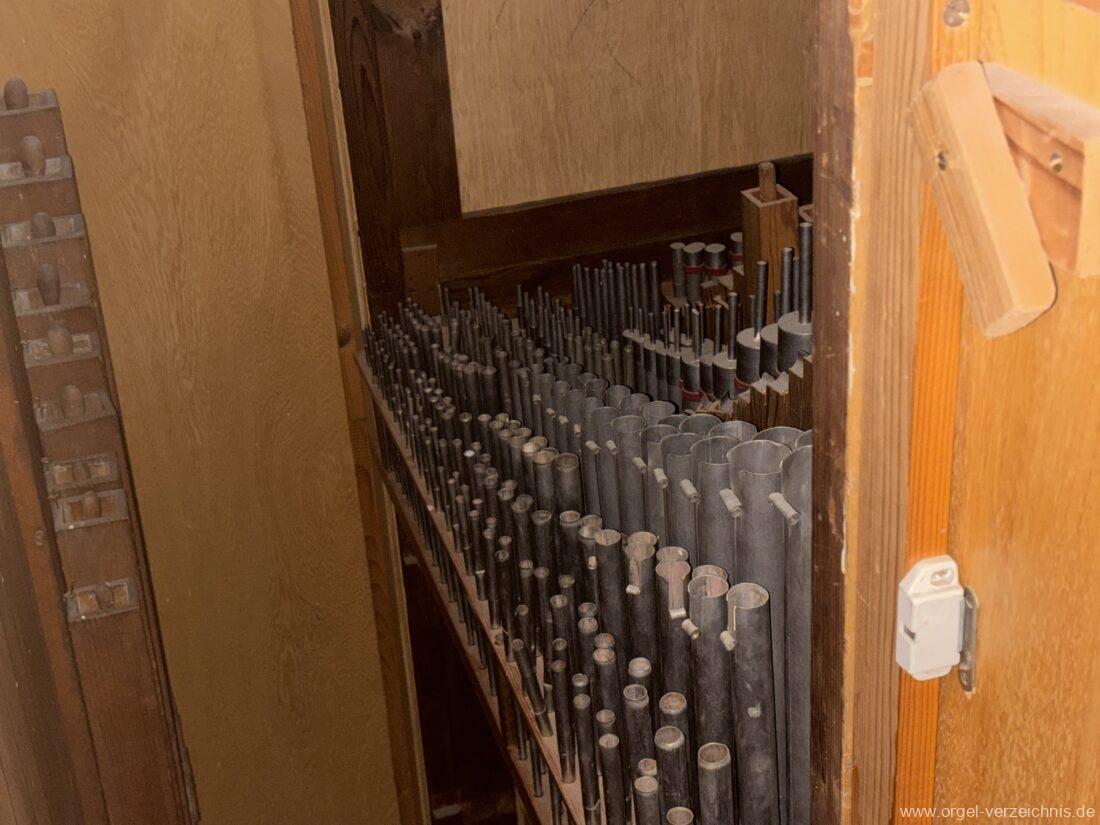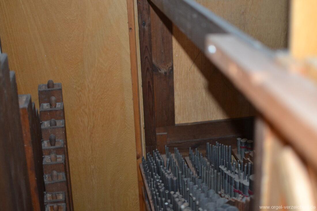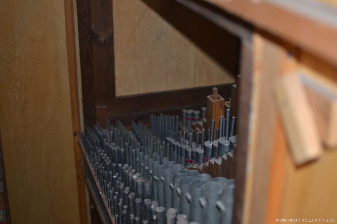 Anm. 1 – C-D# Holz gedeckt innen, E-G# Prospekt Holz, Aufschnitte nachträglich erniedrigt, ab A innen – Pfeifenwerk teilweise alt aus Fichtenholz prismatisch mit Seitenbärten aus Holz, ab f‘ deutlich rechteckige Pfeifen mit massiven gedrungenen Spundgriffen (Maße identisch mit den Spunden selbst), ab f“ Metall gedeckt, weite Mensur mit Aufschnittbärten