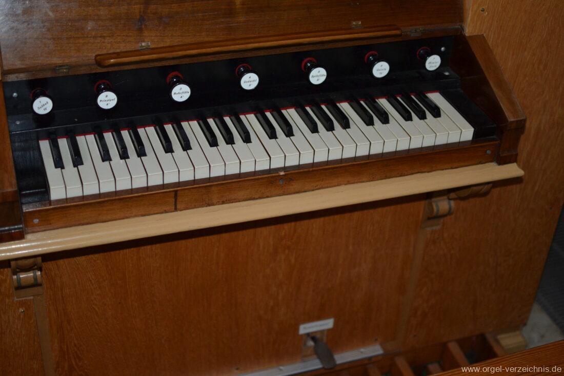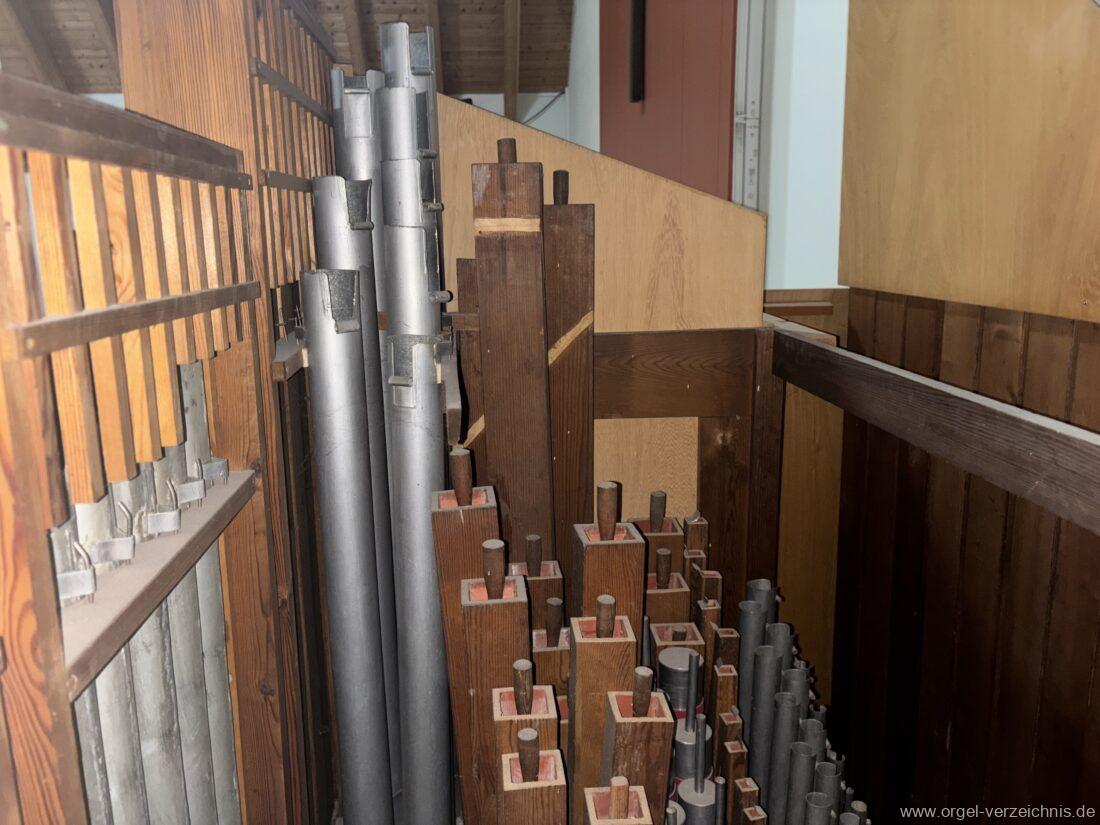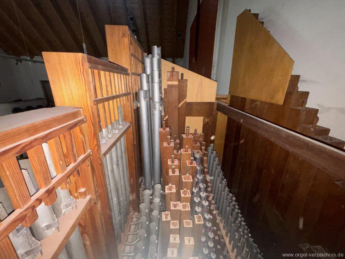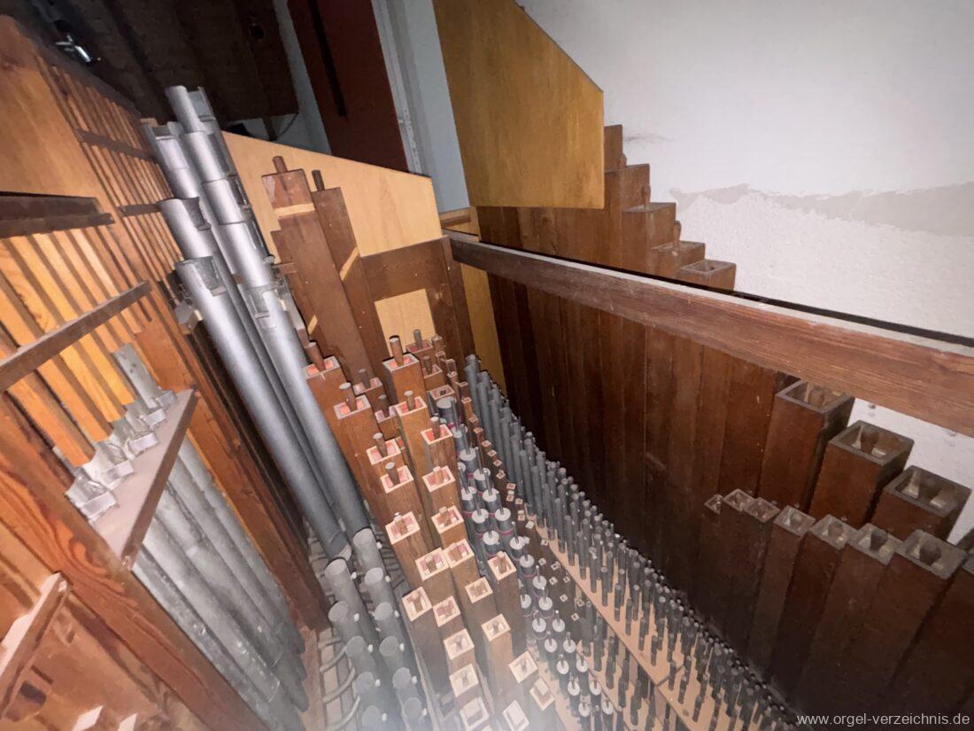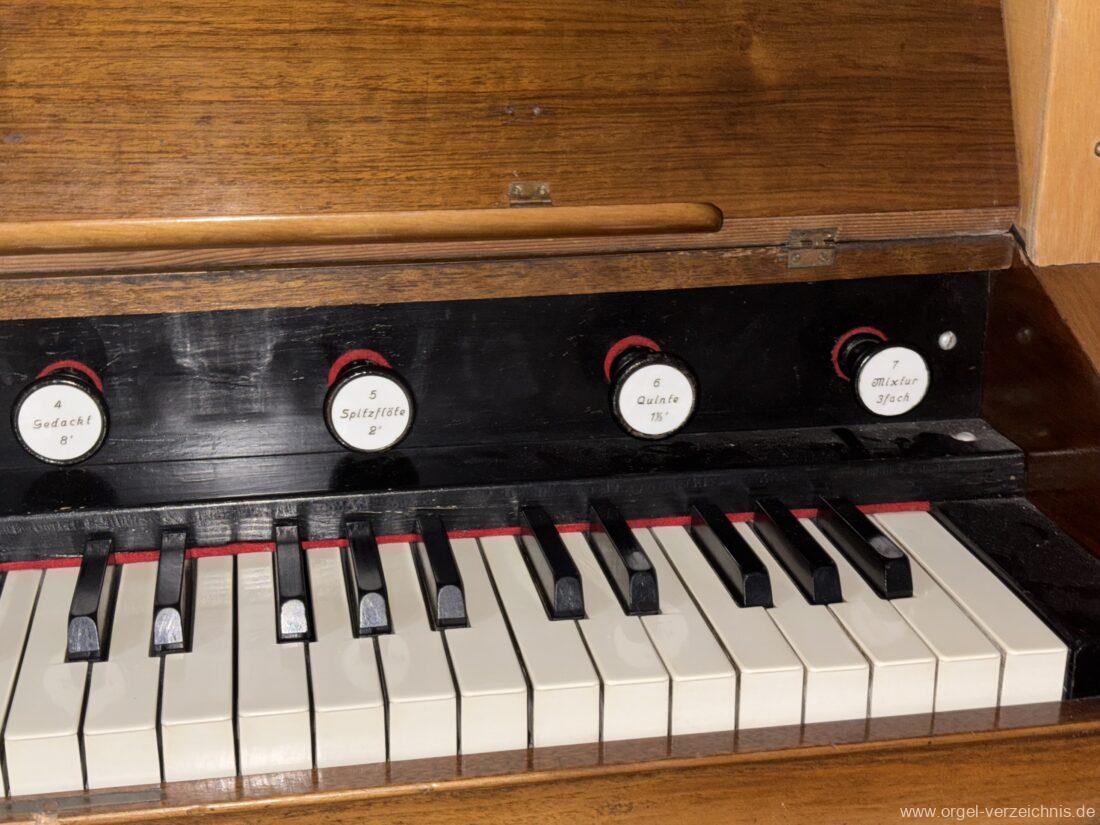 Anm. 1 – C-D# Holz gedeckt innen, E-G# Prospekt Holz, Aufschnitte nachträglich erniedrigt, ab A innen – Pfeifenwerk teilweise alt aus Fichtenholz prismatisch mit Seitenbärten aus Holz, ab f‘ deutlich rechteckige Pfeifen mit massiven gedrungenen Spundgriffen (Maße identisch mit den Spunden selbst), ab f“ Metall gedeckt, weite Mensur mit Aufschnittbärten