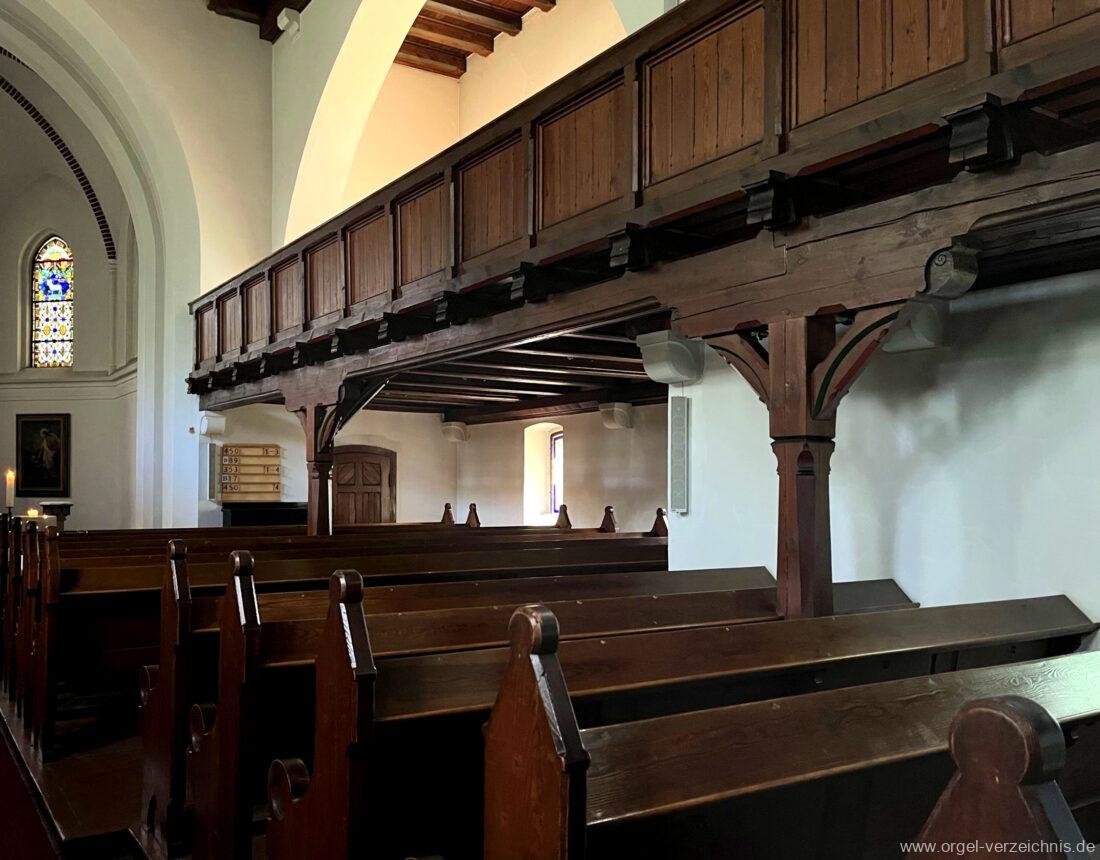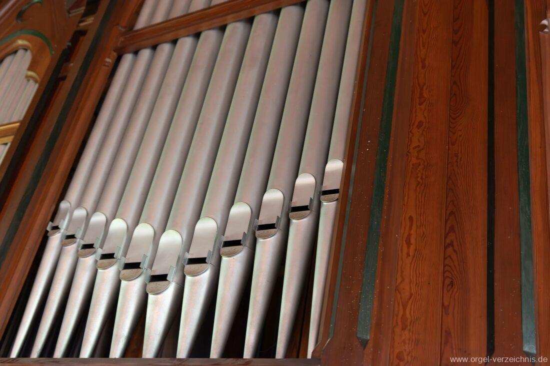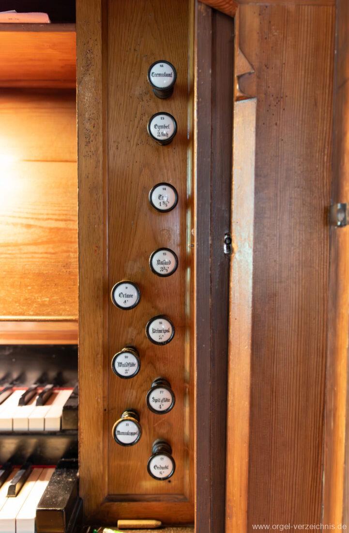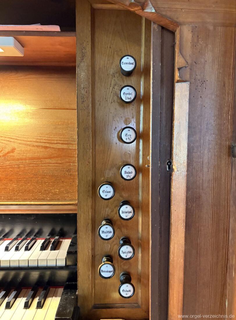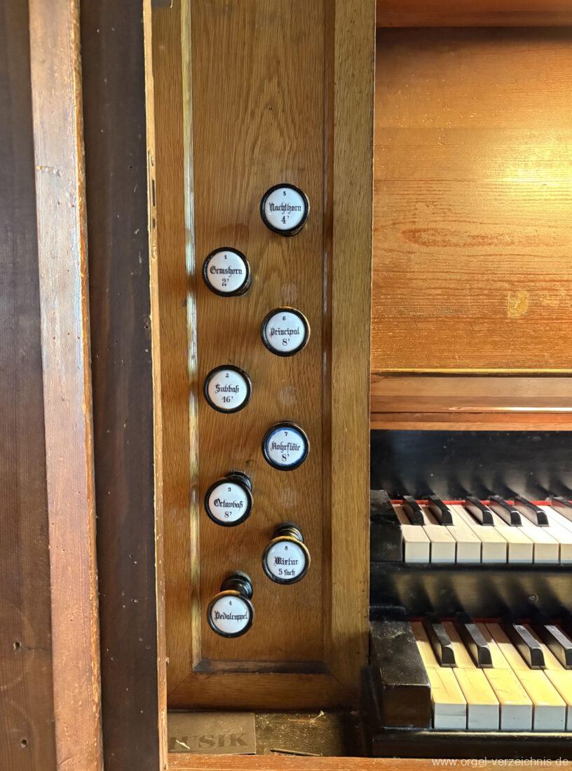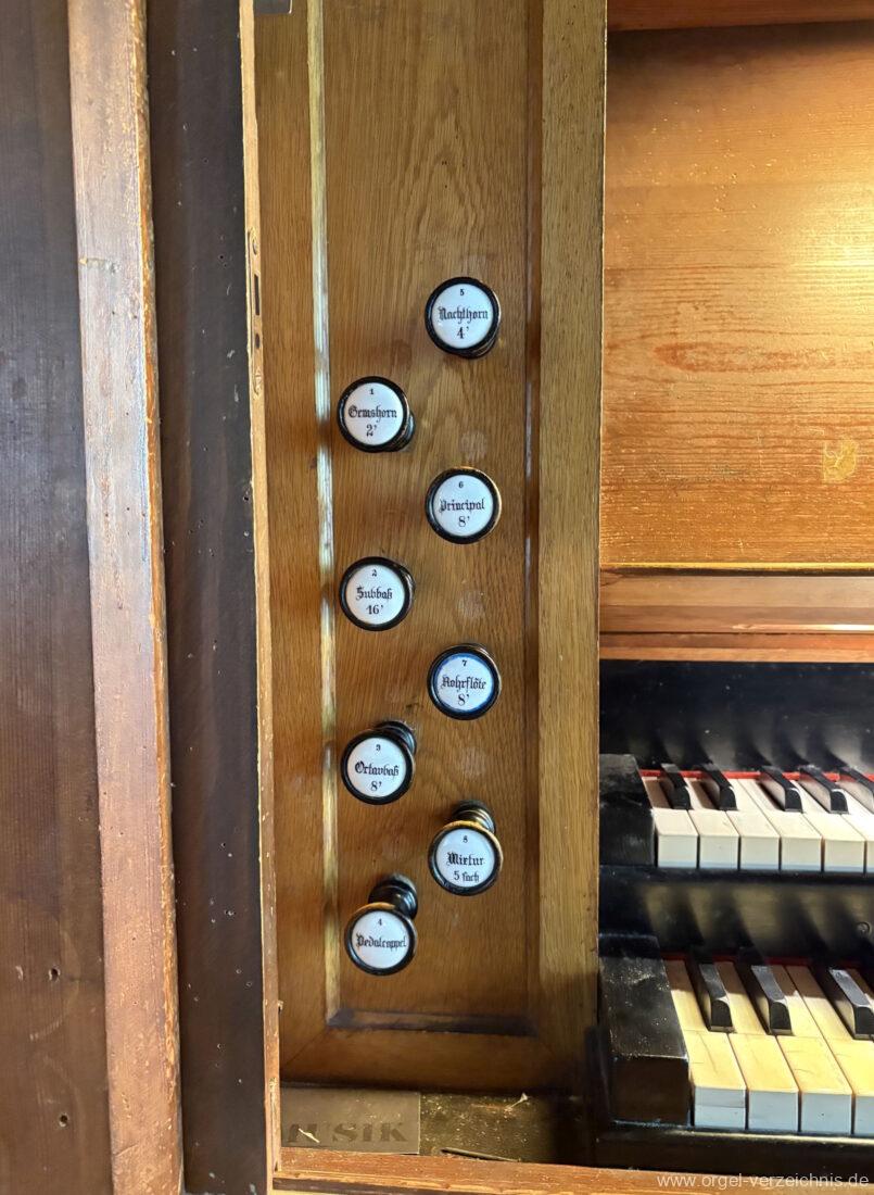 I Hauptwerk C – f“‘Principal 8′ C Holz offen, CS – a° Prospekt Zink, ab b° innnen Metall, z. T. Alt Rohrflöte 8′ C – H Holz ged., ab c° Zink rohrged., ab gs° Metall rohrged., umgearbeitete Quintade Octave 4′ C – H Prospekt Zink, ab c° innen Metall, z. T. Alt Waldflöte 2′ Metall konisch Mixtur 5 fach 1 1/3′ – rep. c°/c’/c“, aktuell 3-4 fach