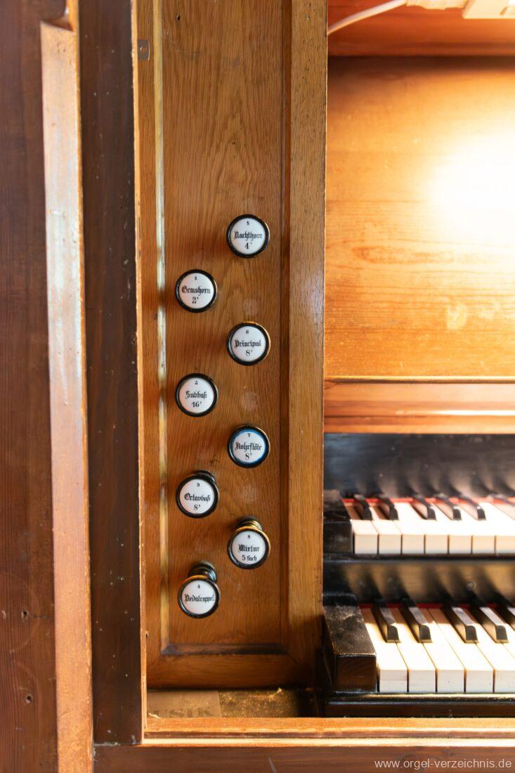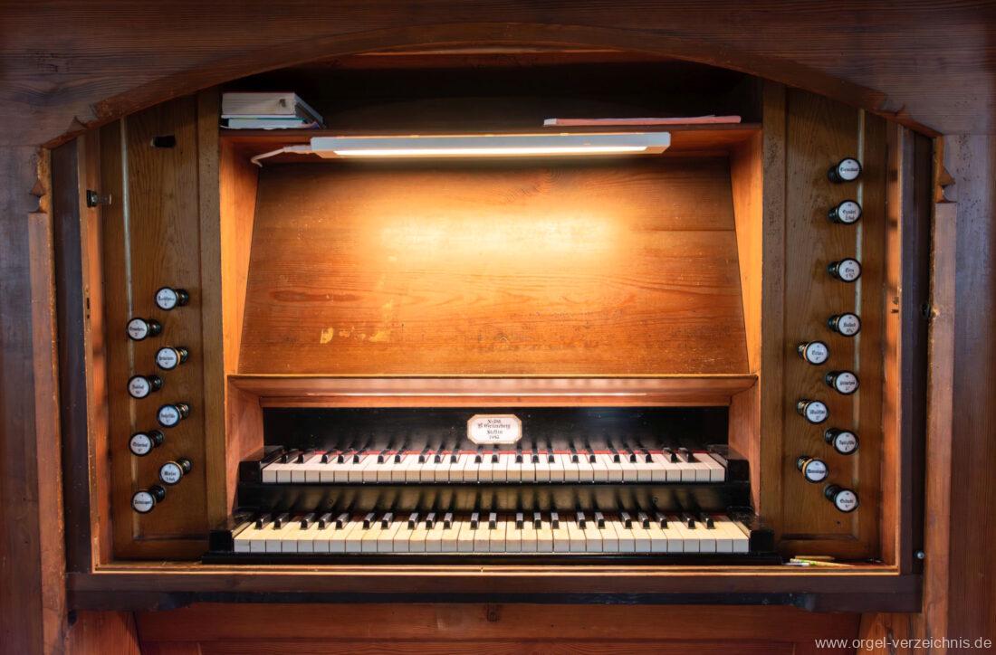 I Hauptwerk C – f“‘Principal 8′ teilw. alt Quintade 8′ Oktave 4′ teilw. alt Waldflöte 2′ Mixtur 5 fach