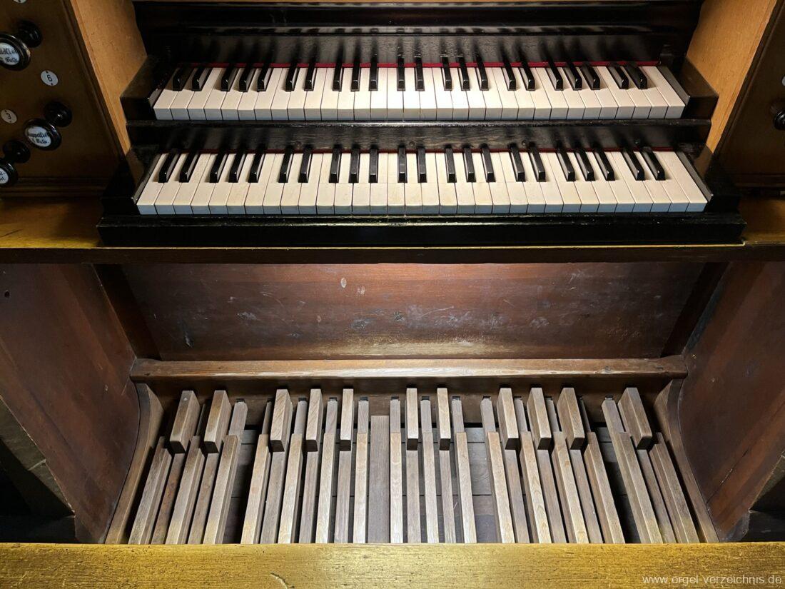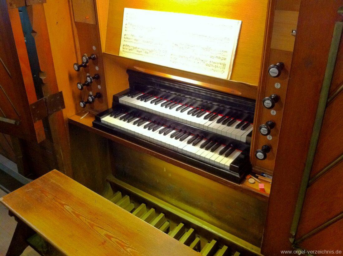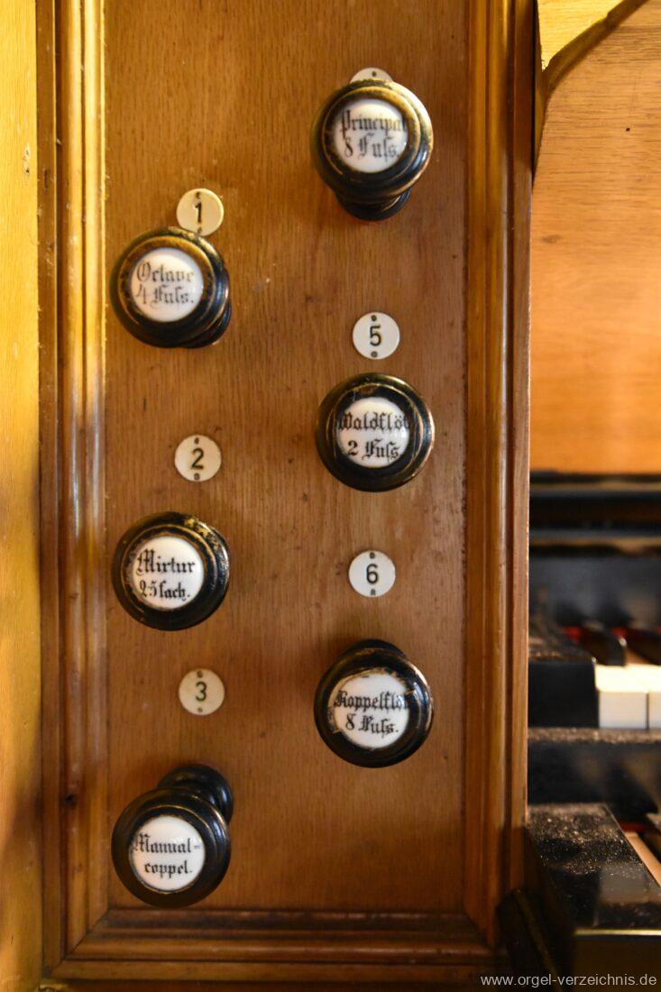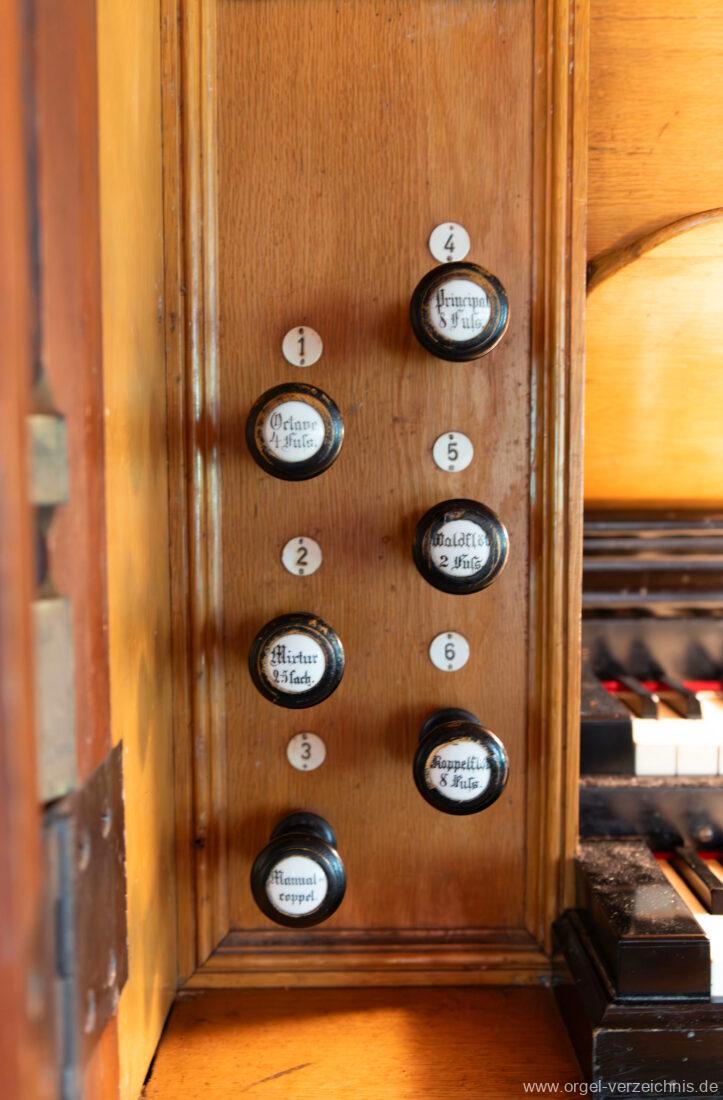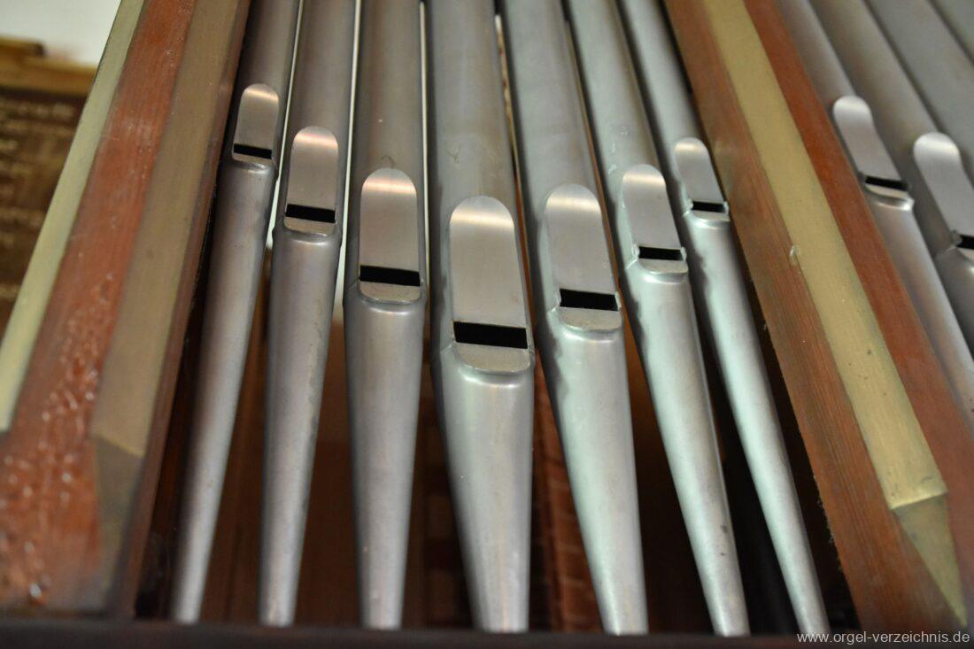 I Hauptwerk C – f“‘Principal 8 Fuss. C – F Holz offen, ab FS Prospekt, ab c‘ innen Koppelflöte 8 Fuss. C – H Holz ged., ab c° Metall konisch Octave 4 Fuss. C – H Prospekt, ab c° innen Waldflöte 2 Fuss. Metall leicht konisch Mixtur 2-3 fach. ist 3-4 fach – rep. c°/c’/c“‘, ab c‘ 4 fach |